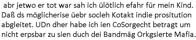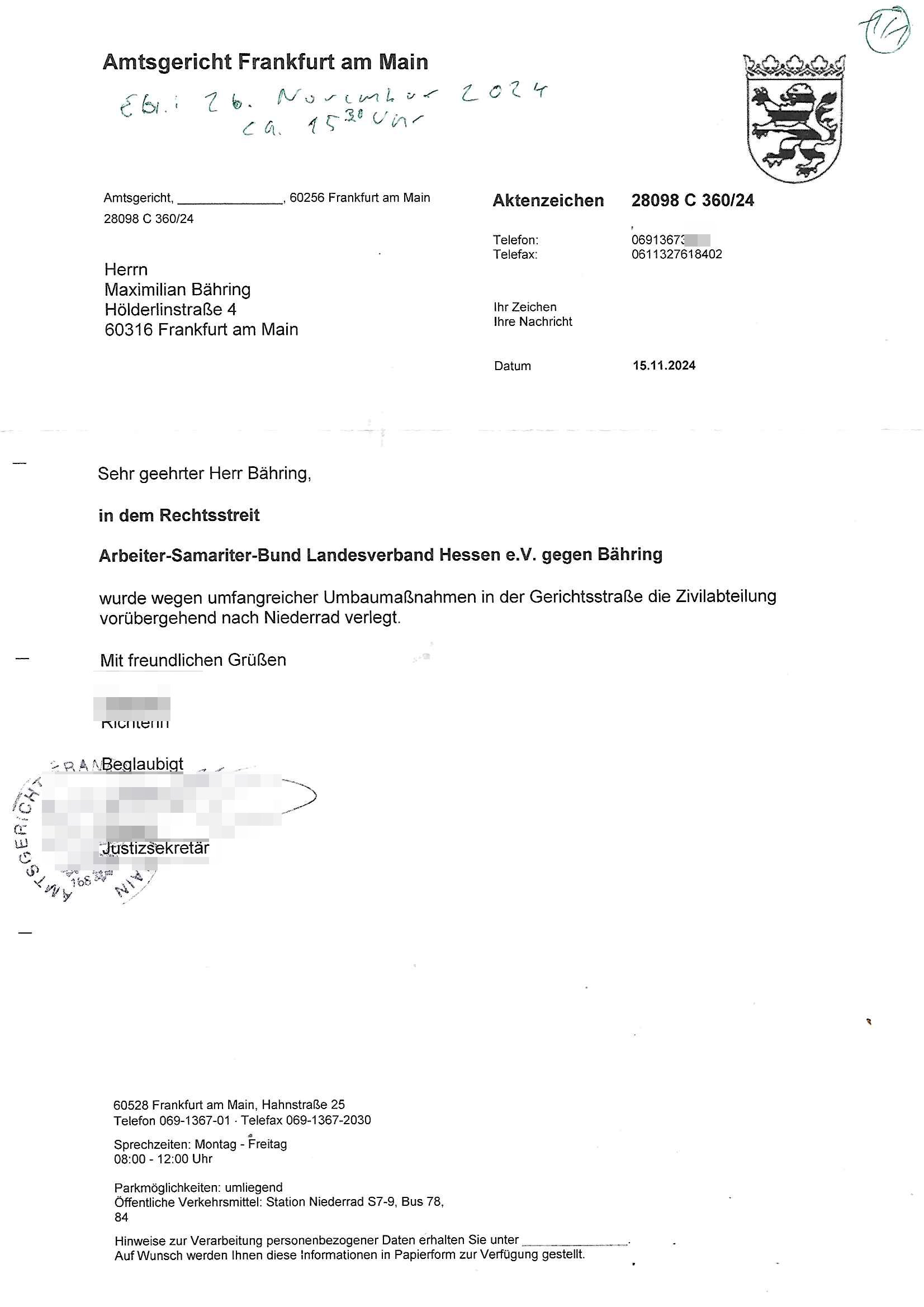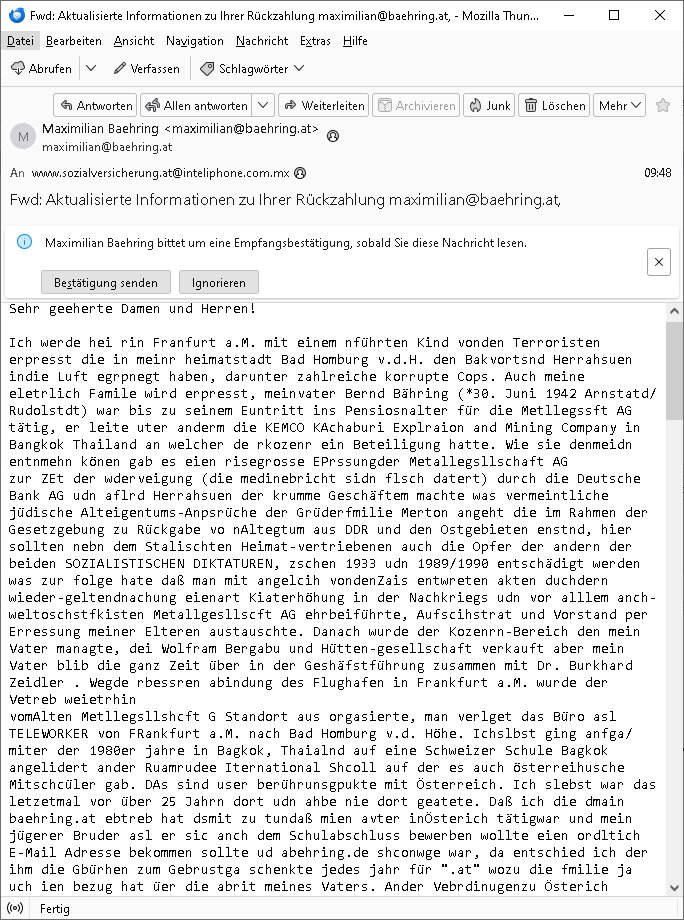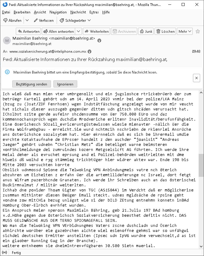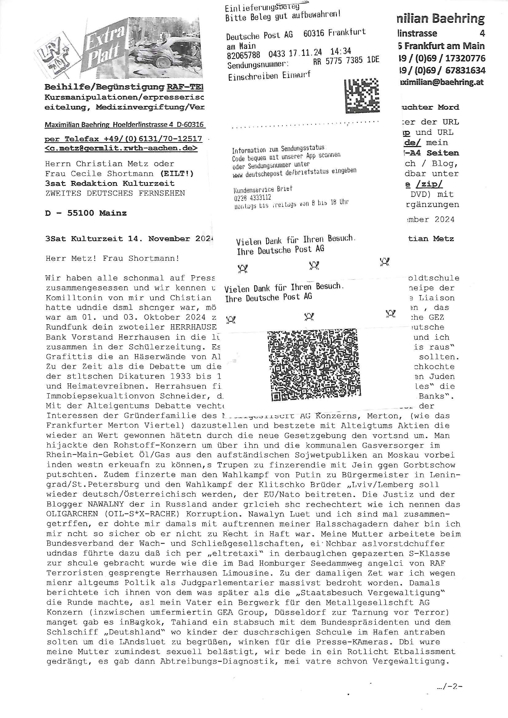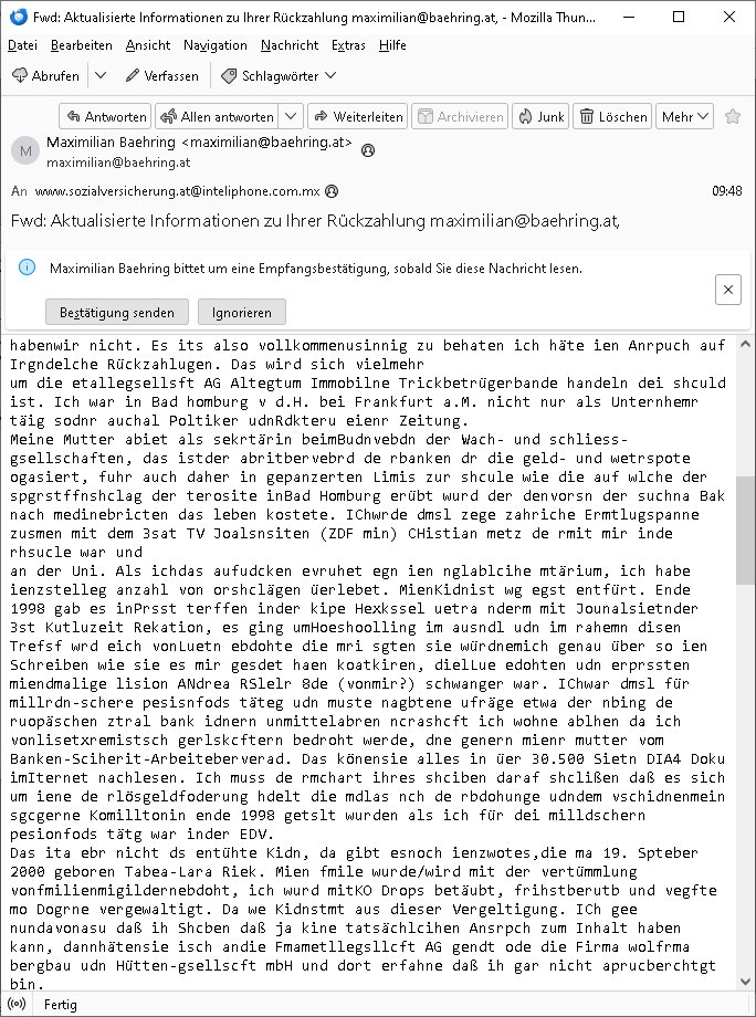 Maximilian Baehring Hoelderlinstrasse 4 D-60316 Frankfurt/M per Fax: +49/(0)611/32761-8402 Amtsgericht z.Hd.: RiAG Hommel o. Justizsekretär Eckert Hahnstraße 25 D - 60528 Frankfurt a.M. Im Internet findet sich unter der URL http://banktunnel.eu/pdf.php und URL http://blog.sch-einesystem.de/ mein ausgedruckt ÜBER 30.500 DIN-A4 Seiten umfassendes Internet Tagebuch / Blog, als Offline Version downloadbar unter http://*** /***/ als ISO-Image (brennbar auf DVD) mit tagesaktuellen ZIP-Archiv Ergänzungen Neu: https://www.tiktok.com/@maximilianbaehring/ Frankfurt a. M., den 27. November 2024 Aktenzeichen 28098 C 360/24 des Amtsgerichts Frankfurt a. M. Schreiben erhalten um 15:30 Uhr per normaler Brief-Post am 26. im Umschlag frankiert am 25. November 2024 Umfang beträgt 1 Blatt, 1 Seite, nur vorderseitig bedruckt, Datum 15. November 2024 Sehr geehrte/s/r Frau/Fräulen Amtsrichterin Hommel und Jussitzseretär Eckert! Vorbezechnets Schreiben das meine Nachfrage betrifft wie es sein kann daß das Amtsgericht plötzlich im Gebäude der scheinbar nach Abriss des Gerichtsgebäudes der Staatsanwaltschaft in der Konrad Adenauer Straße nach Niederrad verzogenen Anklagebehörde ihren Sitz hat habe ich am gestrigen Nachmittag erhalten. Ich bin zudem irritiert da ihr Briefkopf zwo ubterschiediche Fax-Nummern aufweist, oben rechts neb dem DIN 5008 Anschriftenfeld die +49/(0)611/327168402 aber unten steht dann nochmal ne ganz andere Nummer, die mir bekannte +49/(0)69/1367-2030. Ich hatte nicht nur erklärt daß ich slebst extra hier in Frankfurt a.M. an den Zoo in die Innenestdt gezogen bin 2006/07 nach assivem Ärger mit einer Stalkerin in Bad Homburg v.d. Höhe um inu nmittelaber (AG/)LG/OLG gerichtsnähe rechtliches klären zu können (was etwas mien entführtes Kind angeht und mein frühere Firma sowei zahriche strafveahren die ich asl Nebkläg3e berebnollte bevor ich nach Frankreich zu mienr Fmailie an die cote D'Azur auswandere um von dort weitre in der IT zu arbeiten als Teleworker) sondern außerdem gebeten mitzuteilen warum es unmöglich ist i Gbeädekoplex an der Konstablerwache der für mcih fußläfig zu erreichen ist (und ich bin ein mssi bedohter Zge der mehrfach etwa uafdem weg zur Post um dort shciben ans gerichtabzugeen angegeriffen wurde) das Verfahren zu führen. Ich hatt das sogra in Form eines Antrags formuliert so ich mich da recht entsinne. Diesar Antrag wird aufrecht-erhalten, meine damit verbundene Frage warum man das verfahren üerbhat inienr außstele des gericht führt ist durch ihr Schreiben zwar beantwortet anfchtbarer Beschluss beatragte verlegung in den Hauptgebäudekplex aber nicht ergangen. Ich habe außerdem gebten mir Prozesskostehifls-Antrags-Formulare zukommen zu lassen und darf hingewiesen daß man diesbezüglich massiv geschlampt/saboteret hatte im Berfufungs-Verfahren 380 C 478/21 Amstegricht Frankfurt a.M. (Höchst) wo vor dem Landgericht die Pflicht zur vetretung duch ein anwlt besteht daß ich beizuziehen bat, das Aktenzeichen ist 2-16 S 54/23 Landgericht Frankfurt a.M.. Ich hab zudem gebeten die laut Zählung es geichts mer al 1.500 Seiten umfassnde Akte dieses noch vor dem Oberlandesgericht udnder gerstalsctwalsft befndlichen Verfahrens hinzuziehen. Dafür gibt es auch ein sehr guten Grund: In unserem verfahn geht es darum daß ich sadistch verlagte Stalker habe asu dem Umfeld der Sexurty Branche, meine Mutter arbeiet beim Bundesverband der Wach- und Schließ-gesllscften, dem Arbeitgeberverband der Gatdrasportefahre und baksicherheit als Chefsrektärin. Dor eruchte sich nach der wnde und im yugoslchen Bürgrkrieg die eemaligen Angjörgen der DDR-Volkoplizei/Stasi, Nationalen Volksarmee, desrteiret Soldaten aus dem yugoslchscn Bürgerkrieg und jener Teil, sowei jene Fraktion der Warschauer Oakt/sowjetchen Roten Armee die anch dem Rückzug der Russen-truppen dnhelut Kohl mit geldzhliugen erzwng im Westen bleiben wollte Jobs zu erpressen in den sie wiethin ein wfafeshcinhaben zu könne tiels um eine Untergrundarmee bildn zu könne die etwa sabotuert um die Wiedervereinigung rückgägeig zu machen. ZU diesm perosnkris gehört der „Michael Beck“ mit demich mich da um Kosten für anälte tsrte die er sich unnötgerwise und üerb den BRG/RVG Satz hinaus Honorer verlangend genommen hat. Er hatemich mit mienm nefürten Kidn brodht ud mich shcftlich afgeofert mir die pusldernaufzshclizen woebi man meine Familie und weieter Zeugene bedrort uetr anderm mit Verstümmelung. Zudme gibt es ienPächen -soweit ich weiß Emritter aus sichehristrisen daß sich (as ermlttlusgtktsch Grüden) als meien Eltern ausgibt. In unseren Verfahren geht es um Rettungswagen-einsätze die mit genau solchen getirggerten, also duch Schlüsslreize von außen wue EMails, SMS usw ausglösten bstenflls auf den allerersten Blick schbaren Selbst(?)-Mrodversuchen zusmmaen- hägen. Ich wollte nicht daß die Krankenkasse/Allgemeinheit dafür belastet wird winn hjamdn mi abshcihlich Gduschitschden zufügt die Rechnungen asu demMedizin-Bereich nach sich ziehen. Der tasthergang/Schverhalt ist wie folgt: Um an Geld/Jobs usw. zu kommen eprsst man mich mitAndohung von Zufüge vo Leid an fmilenaghrgen mir vor laufder webcam die pusldern aufzuschlitzen, ich kann eine zwostellege zahl von Fällen samt Fodukuenetaion und Zeugen nachweisen. Dise Ftos muß ich dannisn Intrenet hochaldne in mein Online-Tagbuch/“Blog“ das ich eiegtlich führe umdie skdnalöse vrfhrnführungder justz geenüerb NGOS wie amnsty Inetrantional / human rightst watch und ienfüherne Kollegen von der Presse zu zu dokumentieren. Dan ruft manKrnkwagn udnwillich als Helden feiern lassen, auf mein jonrlitshce abrit geht etwa die Erindung der Serie „Notruf“ mit Hans Meiser zurück, Rettusgkfte der friligge Furwehr wolen sich imdperlemnst whlkamf asl wohätge Ehrenamtler drstelen udnerpssten mich nimer dmalige fuktion als Chef- Rekaterue einer Zeitung voyeuristische Gaffer TV-Formate gegnür den Kollen vom Fershen, etwa ChristianMetz v