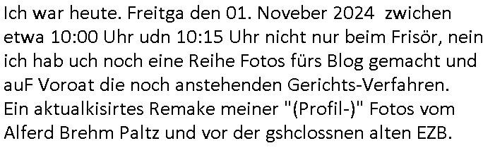 | Ich war heute. Freitga den 01. Noveber 2024 zwichen etwa 10:00 Uhr udn 10:15 Uhr nicht nur beim Frisör, nein ich hab uch noch eine Reihe Fotos fürs Blog gemacht und auF Voroat die noch anstehenden Gerichts-Verfahren. Ein aktualkisirtes Remake meiner "(Profil-)" Fotos vom Alferd Brehm Paltz und vor der gshclossnen alten EZB.