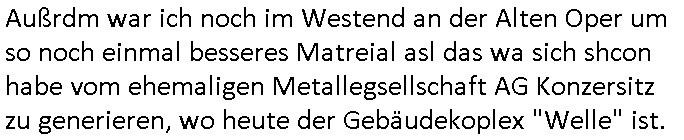 | Außrdm war ich noch im Westend an der Alten Oper um so noch einmal besseres Matreial asl das wa sich shcon habe vom ehemaligen Metallegsellschaft AG Konzersitz zu generieren, wo heute der Gebäudekoplex "Welle" ist.