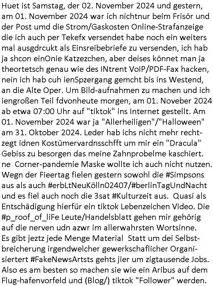 | Huet ist Samstag, der 02. November 2024 und gestern, am 01. November 2024 war ich nichtnur beim Frisör und der Post umd die Strom/Gaskosten Online-Strafanzeige die ich auch per Tekefx versendet habe noch ein weiters mal ausgdrcukt als Einsreibebriefe zu versenden, ich hab ja shcon einOnie Katzezchen, aber deises könnet man ja theortetsch genau wie des INtrent VoIP/PDF-Fax hacken, nein ich hab cuh ienSpzergang gemcht bis ins Westend, an die Alte Oper. Um Bild-aufnahmen zu machen und ich iengroßen Teil fdvonheute morgen, am 01. Noveber 2024 ab etwa 07:00 Uhr auf "tiktok" ins Internet gestellt. Am 01. November 2024 war ja "Allerheiligen"/"Halloween" am 31. Oktober 2024. Leder hab ichs nicht mehr recht-zegt idnen Kostümervardnsschfft um mir ein "Dracula" Gebiss zu besorgen das meine Zahnprobelme kaschiert. ne Corner-pandemie Maske wollte ich auch nicht nutzen. Wegn der Fieertag fielen gestern sowohl die #Simpsons aus als auch #erbLtNeuKölln02407/#berlinTagUndNacht und es fiel auch noch die 3sat #Kulturzeit aus. Quasi als Entschädigung hierfür ein tiktok Lebenzeichen Video. Die #p_roof_of_liFe Leute/Handelsblatt gehen mir gehörig auf die nerven udn azwr im allerwahrsten Wortsinne. Es gibt jeztz jede Menge Material Statt um dei Selbst-breicherung irgendwelcher gewerkschaflicher Organi-siertert #FakeNewsArtsts gehts jier um zigtausende Jobs. Also es am besten so machen sie wie ein Aribus auf dem Flug-hafenvorfeld und (Blog/) tiktok "Follower" werden.