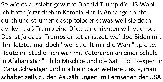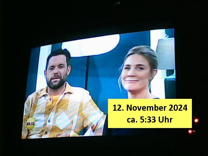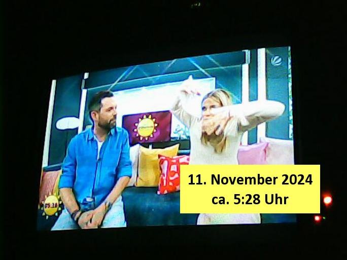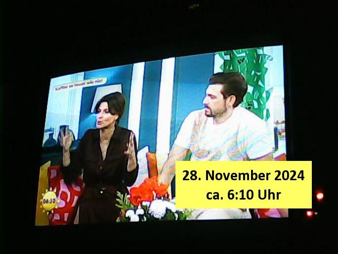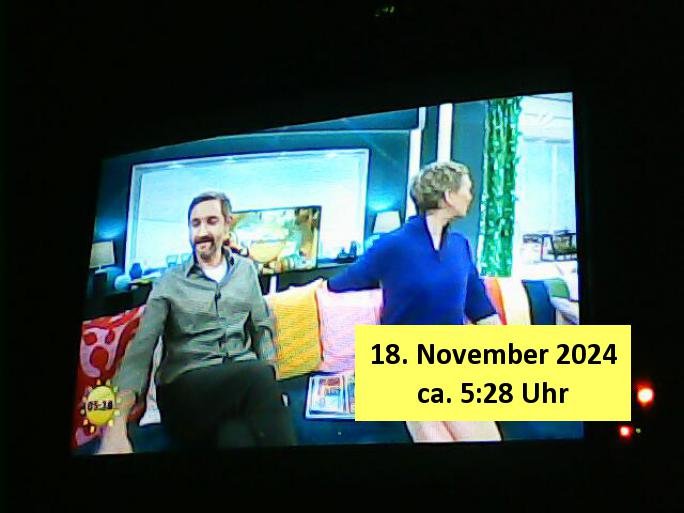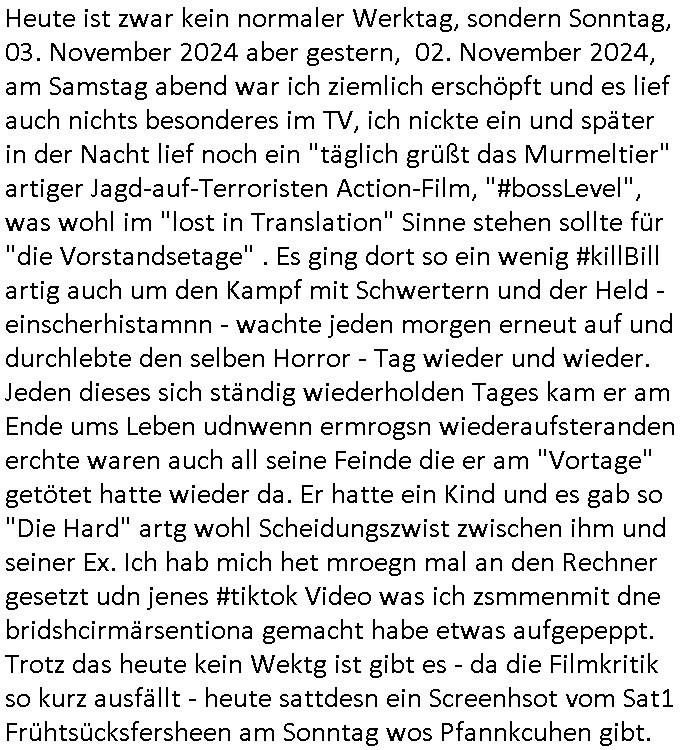 | Heute ist zwar kein normaler Werktag, sondern Sonntag, 03. November 2024 aber gestern, 02. November 2024, am Samstag abend war ich ziemlich erschöpft und es lief auch nichts besonderes im TV, ich nickte ein und später in der Nacht lief noch ein "täglich grüßt das Murmeltier" artiger Jagd-auf-Terroristen Action-Film, "#bossLevel", was wohl im "lost in Translation" Sinne stehen sollte für "die Vorstandsetage" . Es ging dort so ein wenig #killBill artig auch um den Kampf mit Schwertern und der Held - einscherhistamnn - wachte jeden morgen erneut auf und durchlebte den selben Horror - Tag wieder und wieder. Jeden dieses sich ständig wiederholden Tages kam er am Ende ums Leben udnwenn ermrogsn wiederaufsteranden erchte waren auch all seine Feinde die er am "Vortage" getötet hatte wieder da. Er hatte ein Kind und es gab so "Die Hard" artg wohl Scheidungszwist zwischen ihm und seiner Ex. Ich hab mich het mroegn mal an den Rechner gesetzt udn jenes #tiktok Video was ich zsmmenmit dne bridshcirmärsentiona gemacht habe etwas aufgepeppt. Trotz das heute kein Wektg ist gibt es - da die Filmkritik so kurz ausfällt - heute sattdesn ein Screenhsot vom Sat1 Frühtsücksfersheen am Sonntag wos Pfannkcuhen gibt.