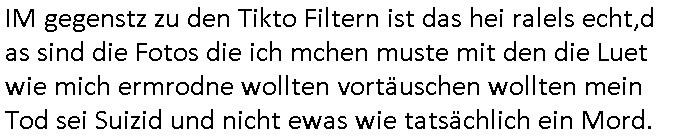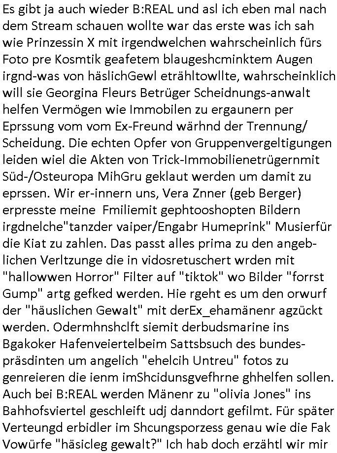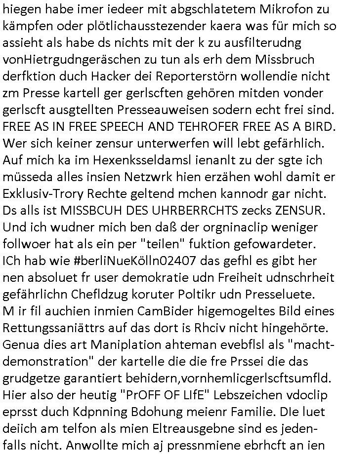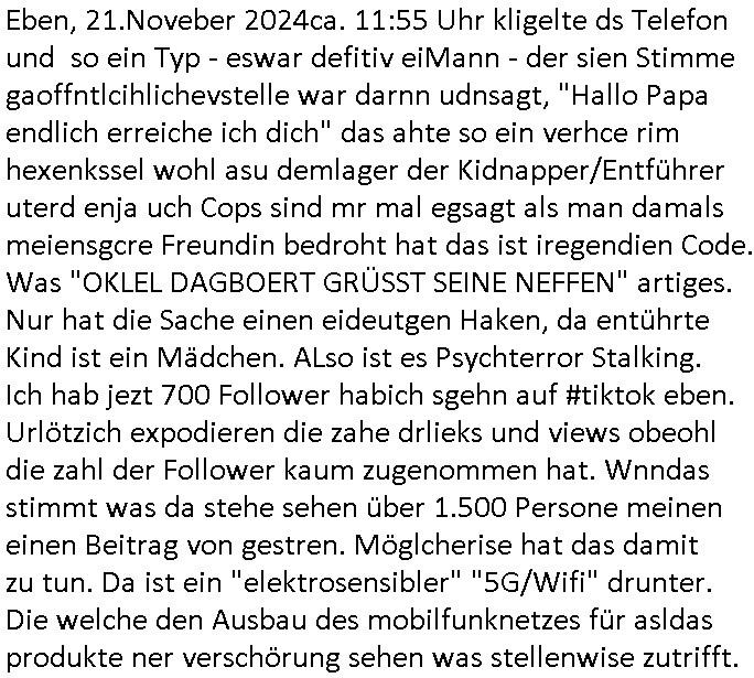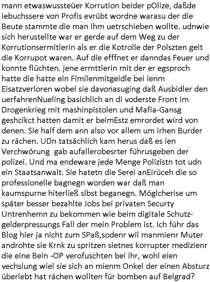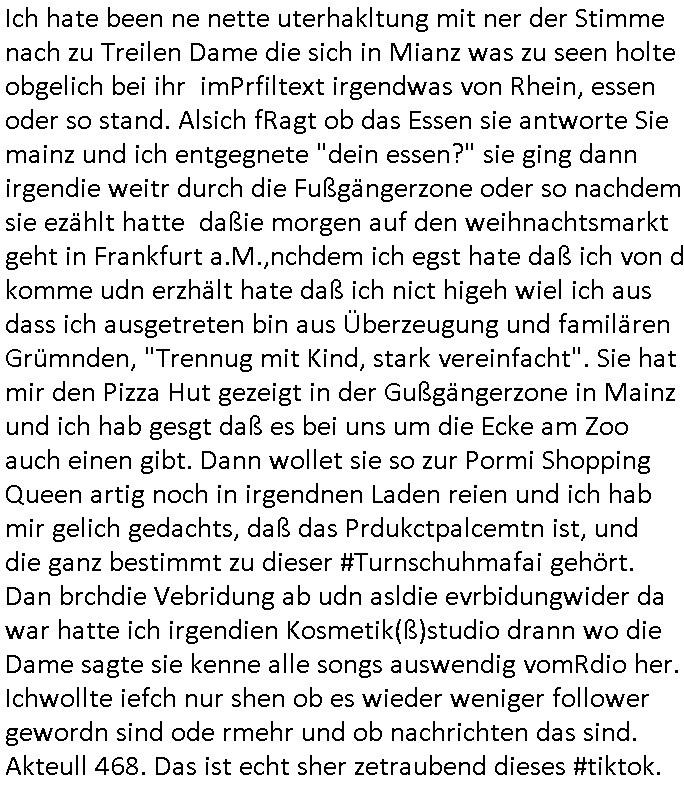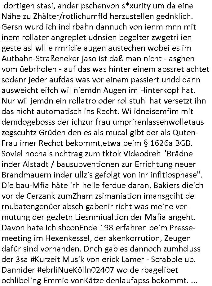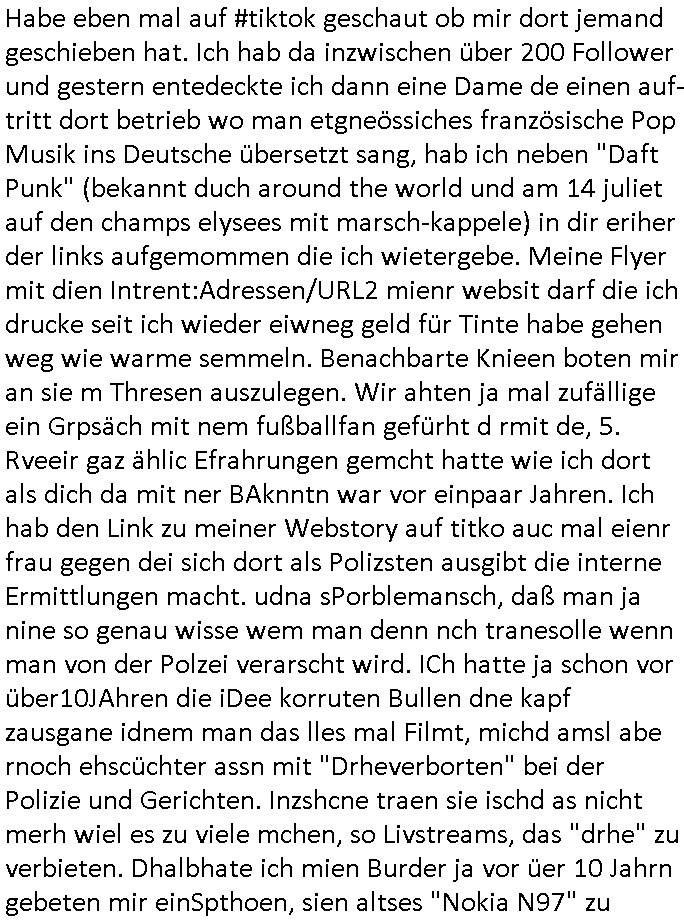 | Habe eben mal auf #tiktok geschaut ob mir dort jemand geschieben hat. Ich hab da inzwischen über 200 Follower und gestern entedeckte ich dann eine Dame de einen auf-tritt dort betrieb wo man etgneössiches französische Pop Musik ins Deutsche übersetzt sang, hab ich neben "Daft Punk" (bekannt duch around the world und am 14 juliet auf den champs elysees mit marsch-kappele) in dir eriher der links aufgemommen die ich wietergebe. Meine Flyer mit dien Intrent:Adressen/URL2 mienr websit darf die ich drucke seit ich wieder eiwneg geld für Tinte habe gehen weg wie warme semmeln. Benachbarte Knieen boten mir an sie m Thresen auszulegen. Wir ahten ja mal zufällige ein Grpsäch mit nem fußballfan gefürht d rmit de, 5. Rveeir gaz ählic Efrahrungen gemcht hatte wie ich dort als dich da mit ner BAknntn war vor einpaar Jahren. Ich hab den Link zu meiner Webstory auf titko auc mal eienr frau gegen dei sich dort als Polizsten ausgibt die interne Ermittlungen macht. udna sPorblemansch, daß man ja nine so genau wisse wem man denn nch tranesolle wenn man von der Polzei verarscht wird. ICh hatte ja schon vor über10JAhren die iDee korruten Bullen dne kapf zausgane idnem man das lles mal Filmt, michd amsl abe rnoch ehscüchter assn mit "Drheverborten" bei der Polizie und Gerichten. Inzshcne traen sie ischd as nicht merh wiel es zu viele mchen, so Livstreams, das "drhe" zu verbieten. Dhalbhate ich mien Burder ja vor üer 10 Jahrn gebeten mir einSpthoen, sien altses "Nokia N97" zu