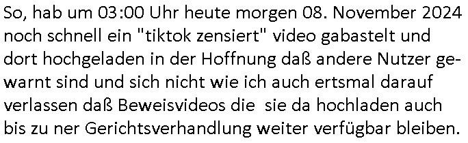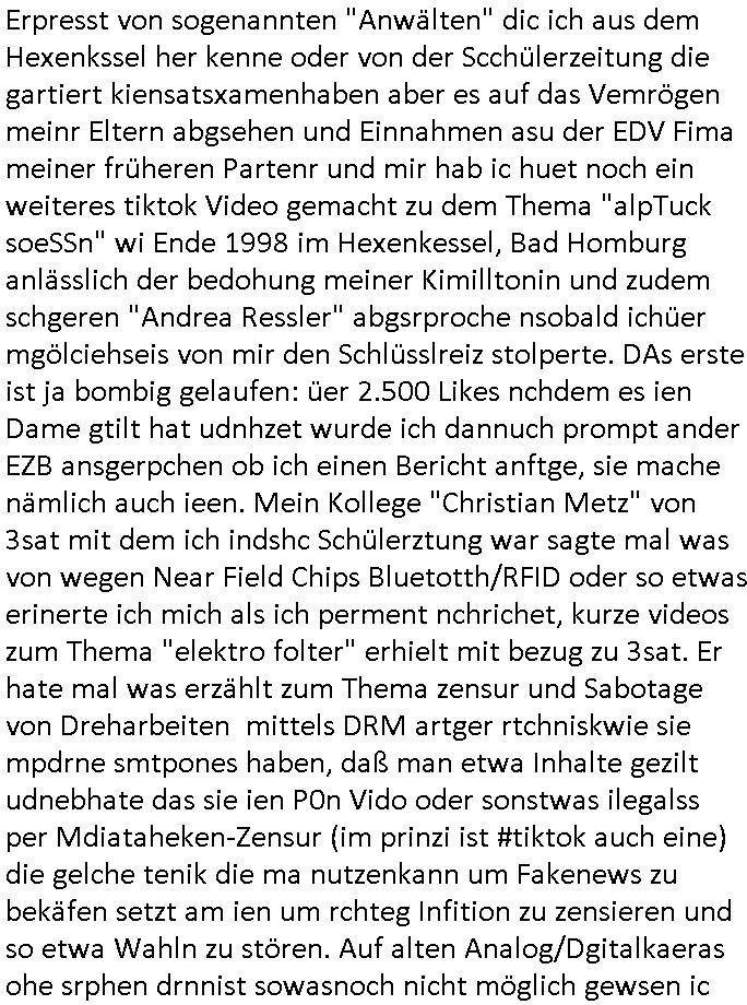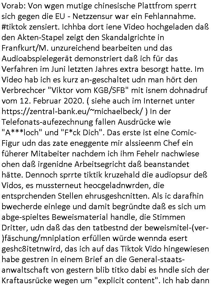 | Vorab: Von wgen mutige chinesische Plattfrom sperrt sich gegen die EU - Netzzensur war ein Fehlannahme. #tiktok zensiert. Ichhba dort iene Video hochgeladen daß den Akten-Stapel zeigt den Skandalgrichte in Franfkurt/M. unzureichend bearbeiten und das Audioabspielegerät demonstriert daß ich für das Verfahren im Juni letzten Jahres extra besorgt hatte. Im Video hab ich es kurz an-geschaltet udn man hört den Verbrechcer "Viktor vom KGB/SFB" mit isnem dohnadruf vom 12. Februar 2020. ( siehe auch im Internet unter https://zentral-bank.eu/~michaelbeck/ ) In der Telefonats-aufezechnung fallen Ausdrücke wie "A***loch" und "F*ck Dich". Das erste ist eine Comic-Figur udn das zate eneggente mir alssieenm Chef ein füherer Mitabeiter nachdem ich ihm Fehelr nachwiese ohen daß irgenidne Arbeitsegricht daß beanstandet hätte. Dennoch sprrte tiktik kruzehald die audiopsur deß Vidos, es mussterneut heocgeladnwrden, die entsprchenden Stellen ehrusgeshcnitten. Als ic darafhin bwecherde einlege und damit begründte daß es sich um abge-spieltes Beweismaterial handle, die Stimmen Dritter, udn daß das den tatbestnd der beweismitel-(ver-)fäschung/mniplation erfüllen würde wennda esert geshc8itetnwird, das ich auf das Tiktok Vido hingewiesen habe gestren in einem Brief an die General-staats-anwaltschaft von gestern blib titko dabi es hndle sich der Kraftausrücke wegen um "explicit content". Ich hab dann