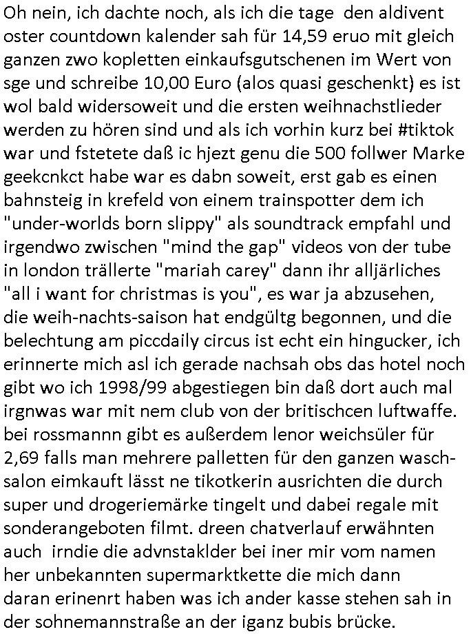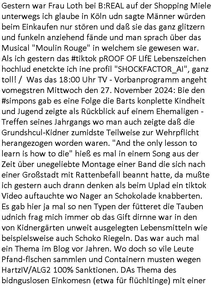 | Gestern war Frau Loth bei B:REAL auf der Shopping Miele unterwegs ich glaube in Köln udn sagte Männer würden beim Einkaufen nur stören und daß sie das ganz glitzern und funkeln anziehend fände und man sprach über das Musical "Moulin Rouge" in welchem sie gewesen war. Als ich gestern das #tiktok pROOF OF LIfE Lebenszeichen hochlud enetckte ich ine profil "SHOCKFACTOR_AI", ganz toll! / Was das 18:00 Uhr TV - Vorbanprogramm angeht vomegstren Mittwoch den 27. November 2024: Bie den #simpons gab es eine Folge die Barts konplette Kindheit und Jugend zeigte als Rückblick auf einem Ehemaligen - Treffen seines Jahrgangs wo man auch zeigte daß die Grundshcul-Kidner zumidste Teilweise zur Wehrpflicht herangezogen worden waren. "And the only lesson to learn is how to die" hieß es mal in einem Song aus der Zeit über unegeliebte Montage einer Band die sich nach einer Großstadt mit Rattenbefall beannt hatte, da mußte ich gestern auch drann denken als beim Uplad ein tiktok Video auftauchte wo Nager an Schokolade knabberten. Es gab hier ja mal so nen Typen der fütteret die Tauben udnich frag mich immer ob das Gift dirnne war in den von Kidnergärten unweit ausgelegten Lebensmitteln wie beispielsweise auch Schoko Riegeln. Das war auch mal ein Thema im Blog vor Jahren. Wo doch so vile Leute Pfand-flschen sammlen und Containern musten wegen HartzIV/ALG2 100% Sanktionen. DAs Thema des bidnguslosen Einkomesn (etwa für flüchltinge) mit einer