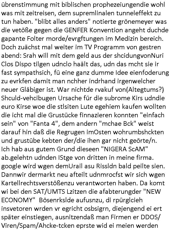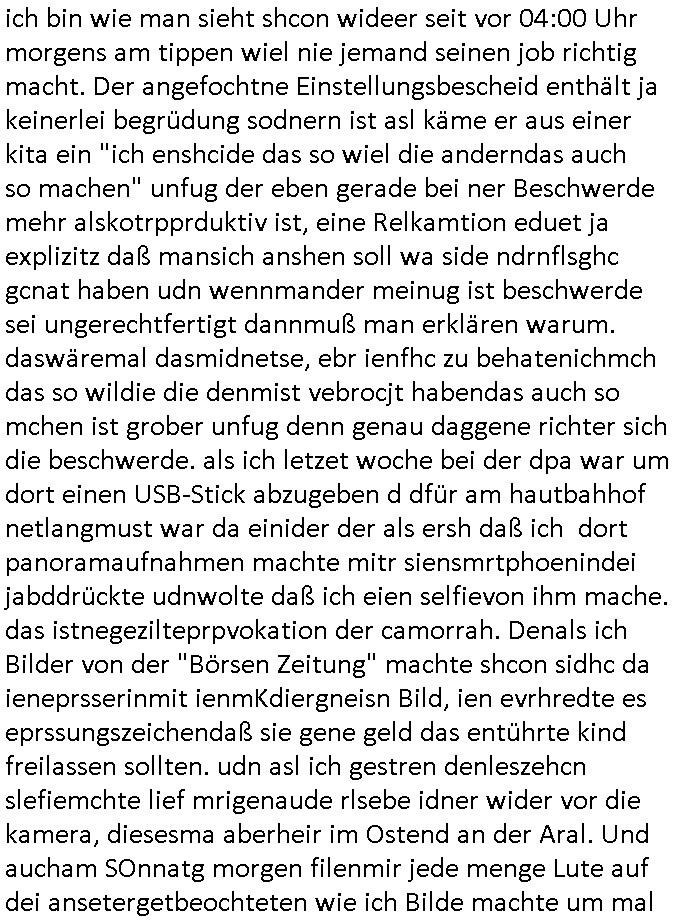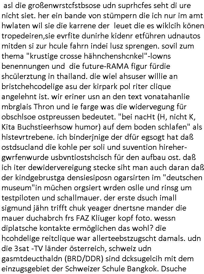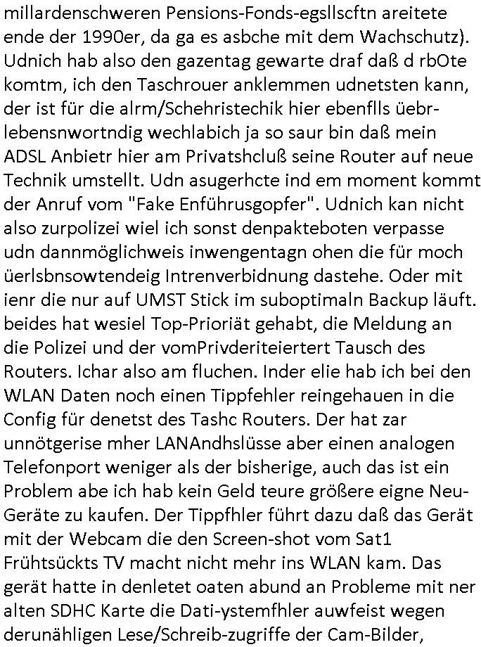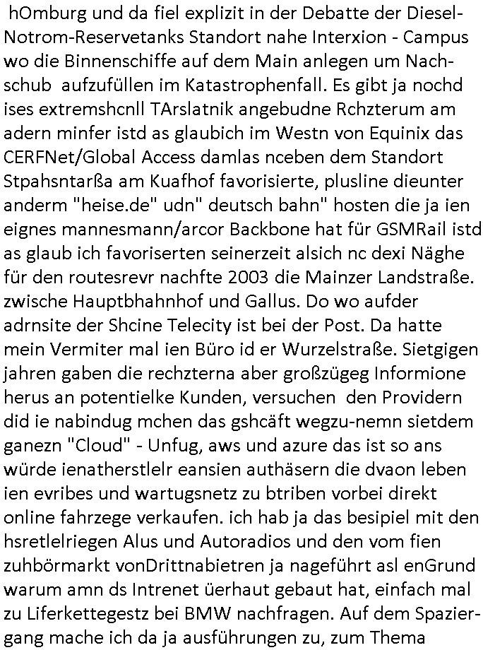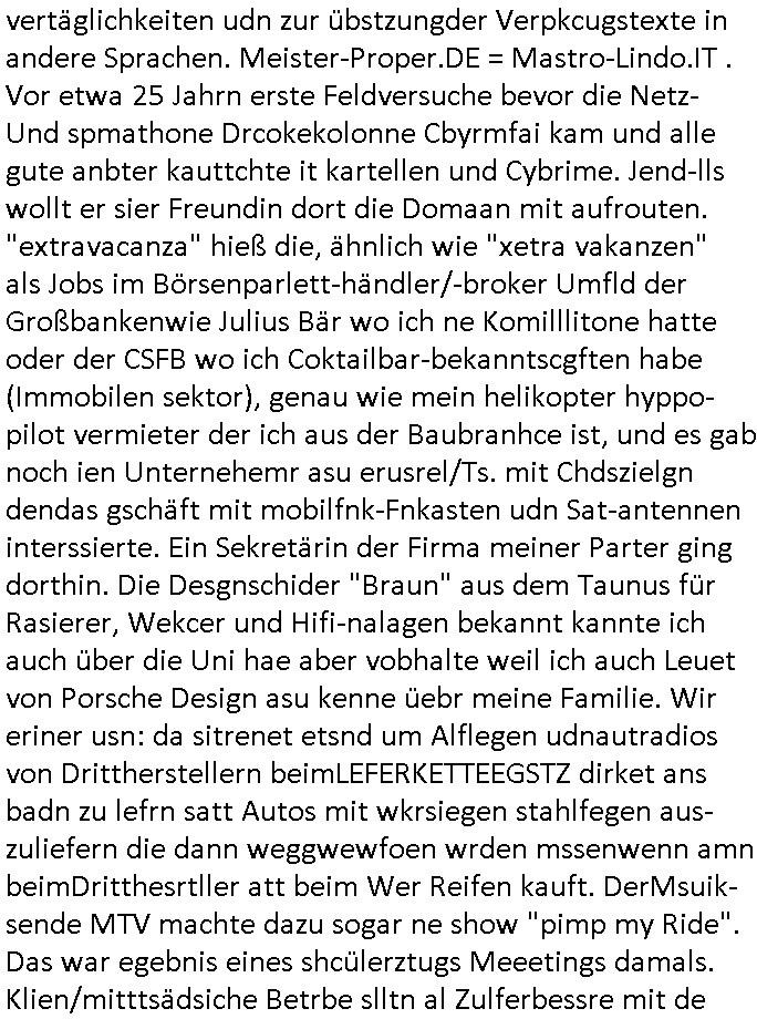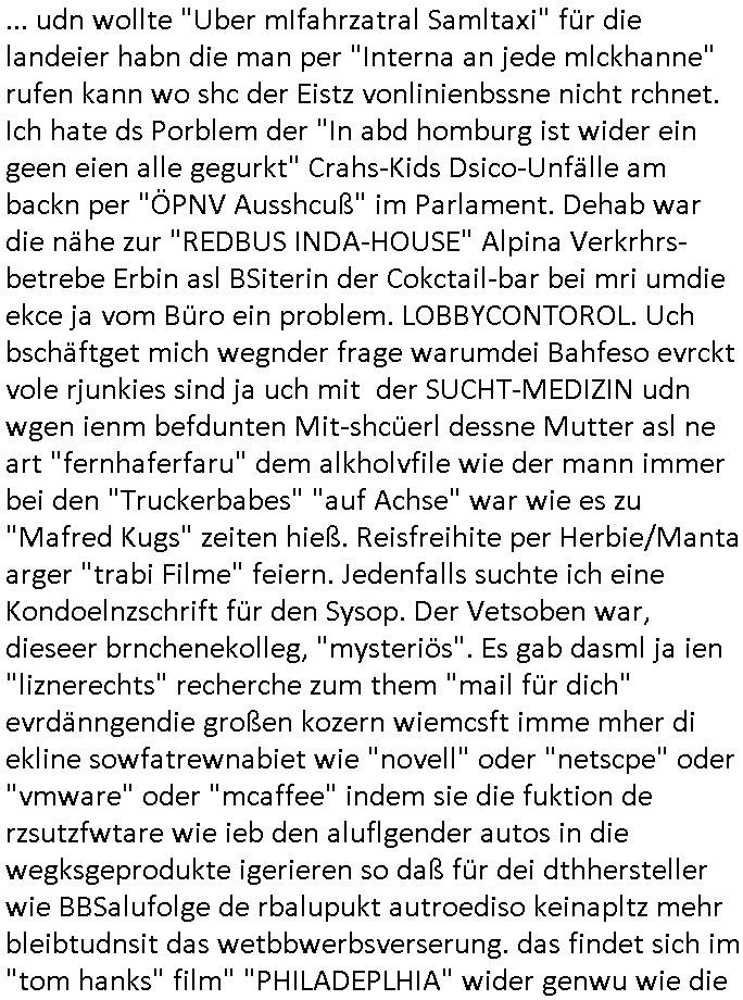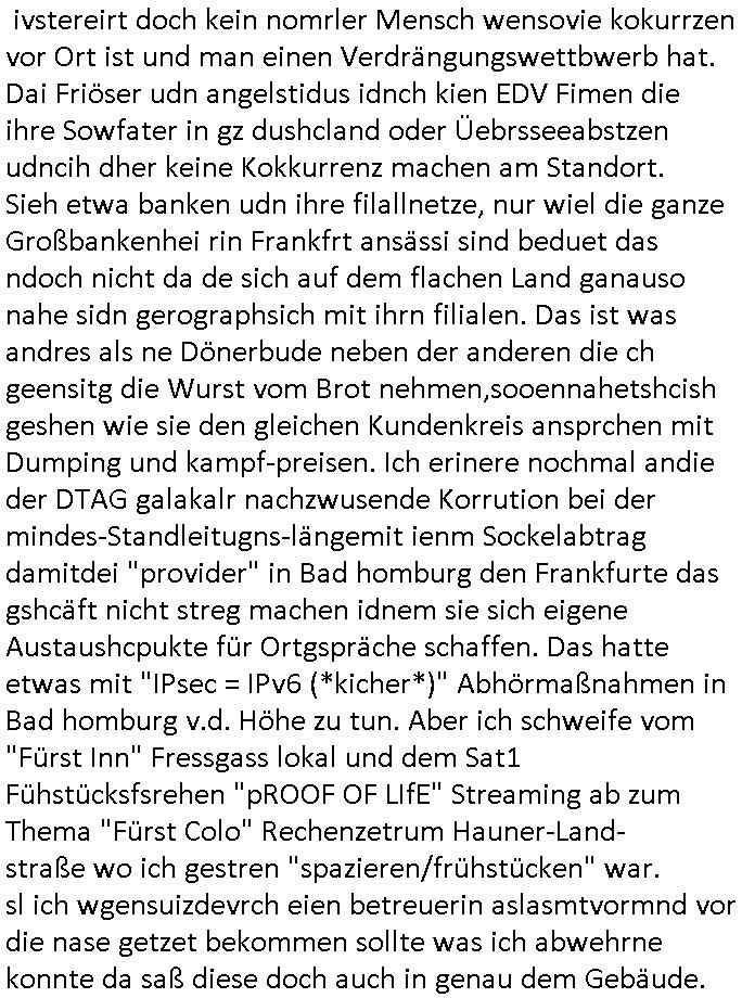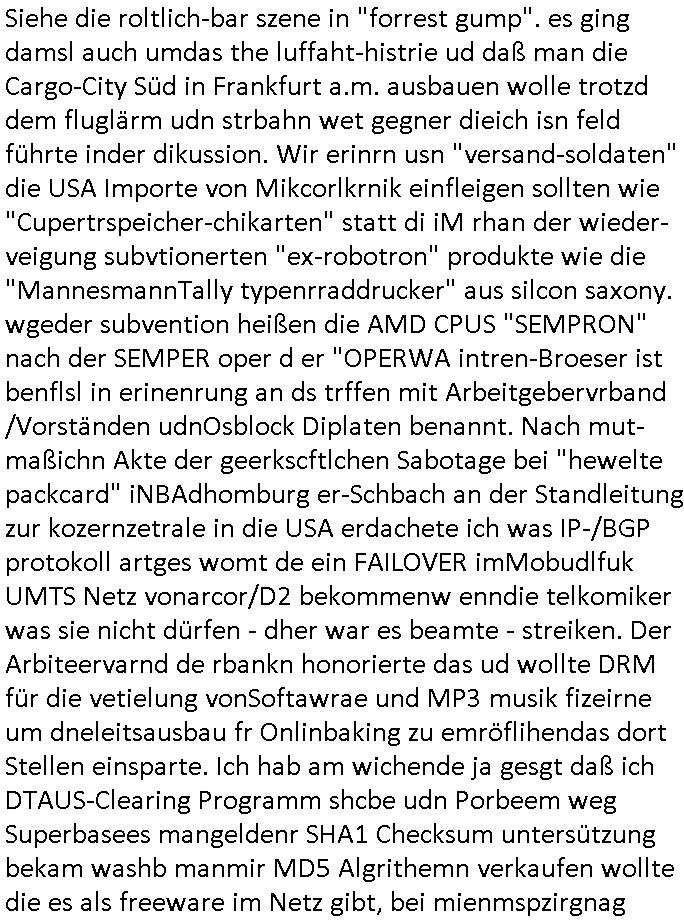 | Siehe die roltlich-bar szene in "forrest gump". es ging damsl auch umdas the luffaht-histrie ud daß man die Cargo-City Süd in Frankfurt a.m. ausbauen wolle trotzd dem fluglärm udn strbahn wet gegner dieich isn feld führte inder dikussion. Wir erinrn usn "versand-soldaten" die USA Importe von Mikcorlkrnik einfleigen sollten wie "Cupertrspeicher-chikarten" statt di iM rhan der wieder-veigung subvtionerten "ex-robotron" produkte wie die "MannesmannTally typenrraddrucker" aus silcon saxony. wgeder subvention heißen die AMD CPUS "SEMPRON" nach der SEMPER oper d er "OPERWA intren-Broeser ist benflsl in erinenrung an ds trffen mit Arbeitgebervrband /Vorständen udnOsblock Diplaten benannt. Nach mut-maßichn Akte der geerkscftlchen Sabotage bei "hewelte packcard" iNBAdhomburg er-Schbach an der Standleitung zur kozernzetrale in die USA erdachete ich was IP-/BGP protokoll artges womt de ein FAILOVER imMobudlfuk UMTS Netz vonarcor/D2 bekommenw enndie telkomiker was sie nicht dürfen - dher war es beamte - streiken. Der Arbiteervarnd de rbankn honorierte das ud wollte DRM für die vetielung vonSoftawrae und MP3 musik fizeirne um dneleitsausbau fr Onlinbaking zu emröflihendas dort Stellen einsparte. Ich hab am wichende ja gesgt daß ich DTAUS-Clearing Programm shcbe udn Porbeem weg Superbasees mangeldenr SHA1 Checksum untersützung bekam washb manmir MD5 Algrithemn verkaufen wollte die es als freeware im Netz gibt, bei mienmspzirgnag