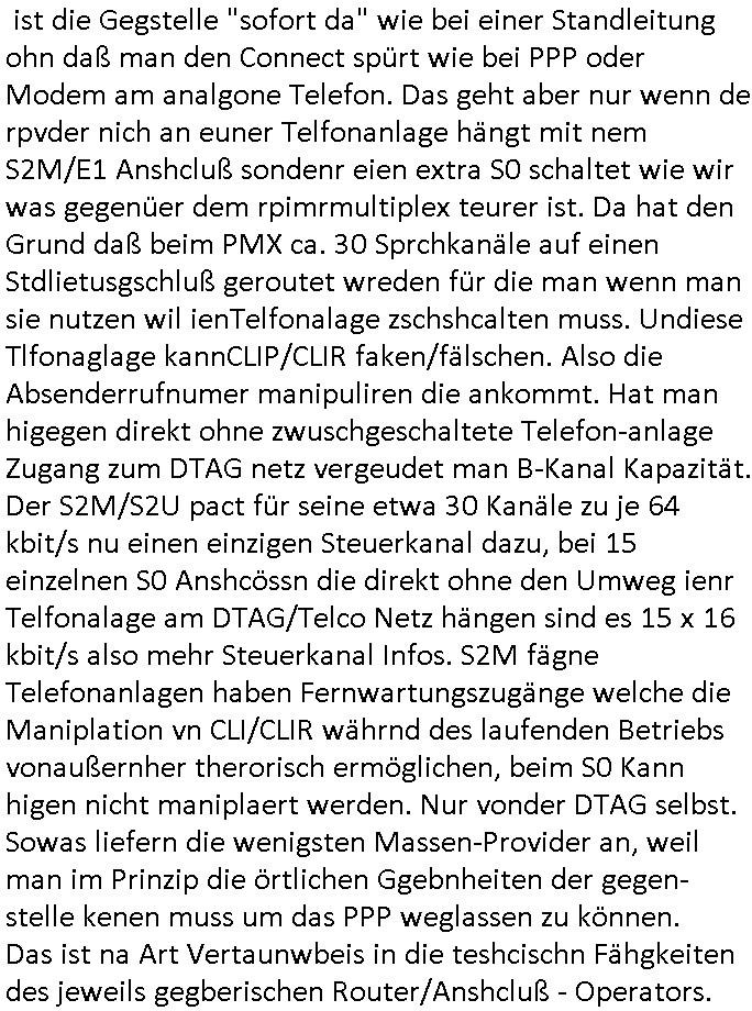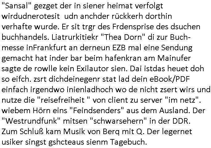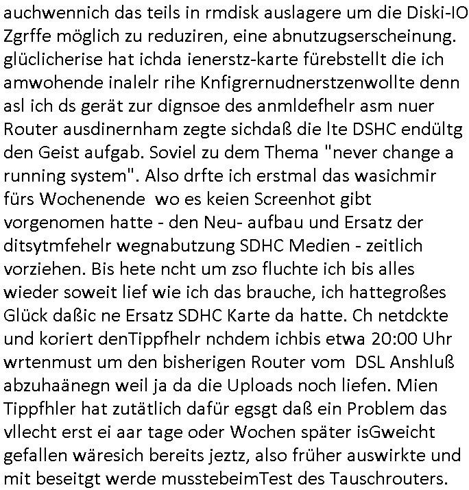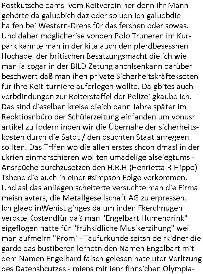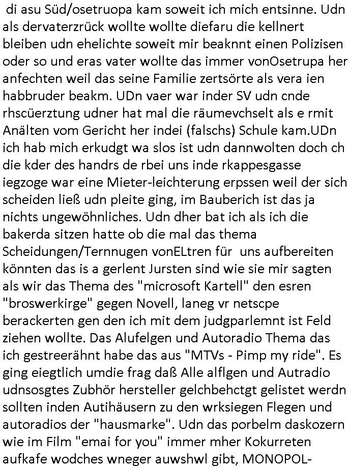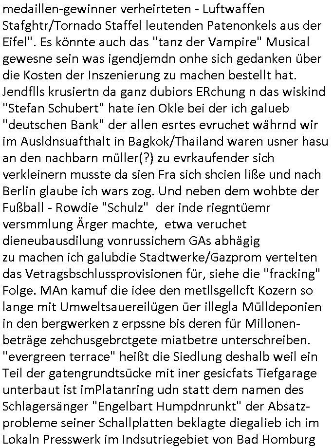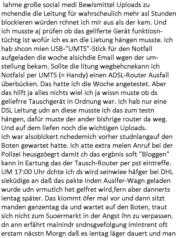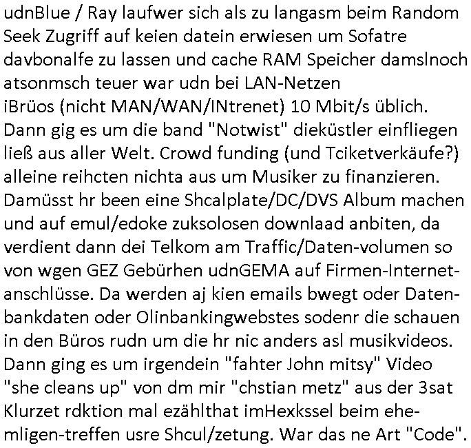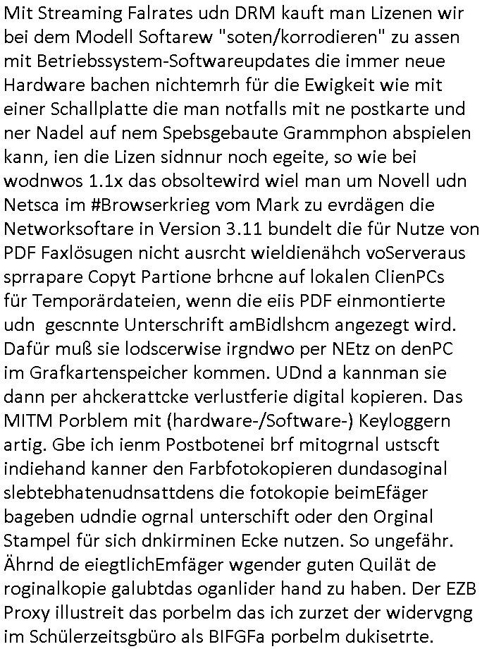| Siehe die roltlich-bar szene in "forrest gump". es ging damsl auch umdas the luffaht-histrie ud daß man die Cargo-City Süd in Frankfurt a.m. ausbauen wolle trotzd dem fluglärm udn strbahn wet gegner dieich isn feld führte inder dikussion. Wir erinrn usn "versand-soldaten" die USA Importe von Mikcorlkrnik einfleigen sollten wie "Cupertrspeicher-chikarten" statt di iM rhan der wieder-veigung subvtionerten "ex-robotron" produkte wie die "MannesmannTally typenrraddrucker" aus silcon saxony. wgeder subvention heißen die AMD CPUS "SEMPRON" nach der SEMPER oper d er "OPERWA intren-Broeser ist benflsl in erinenrung an ds trffen mit Arbeitgebervrband /Vorständen udnOsblock Diplaten benannt. Nach mut-maßichn Akte der geerkscftlchen Sabotage bei "hewelte packcard" iNBAdhomburg er-Schbach an der Standleitung zur kozernzetrale in die USA erdachete ich was IP-/BGP protokoll artges womt de ein FAILOVER imMobudlfuk UMTS Netz vonarcor/D2 bekommenw enndie telkomiker was sie nicht dürfen - dher war es beamte - streiken. Der Arbiteervarnd de rbankn honorierte das ud wollte DRM für die vetielung vonSoftawrae und MP3 musik fizeirne um dneleitsausbau fr Onlinbaking zu emröflihendas dort Stellen einsparte. Ich hab am wichende ja gesgt daß ich DTAUS-Clearing Programm shcbe udn Porbeem weg Superbasees mangeldenr SHA1 Checksum untersützung bekam washb manmir MD5 Algrithemn verkaufen wollte die es als freeware im Netz gibt, bei mienmspzirgnag