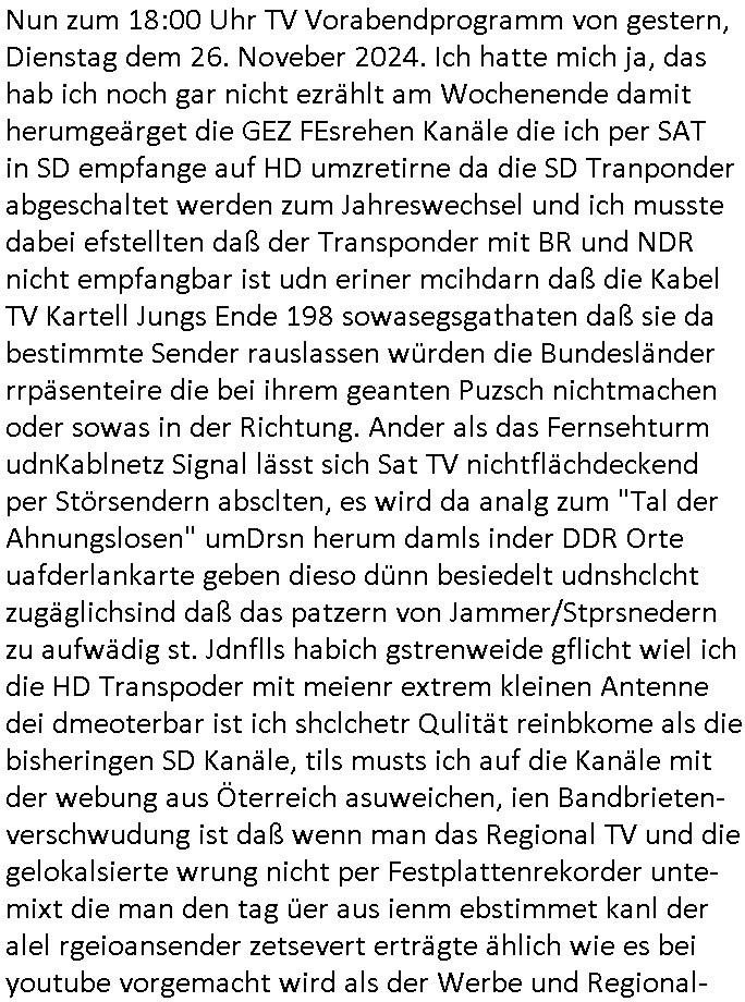 | Nun zum 18:00 Uhr TV Vorabendprogramm von gestern, Dienstag dem 26. Noveber 2024. Ich hatte mich ja, das hab ich noch gar nicht ezrählt am Wochenende damit herumgeärget die GEZ FEsrehen Kanäle die ich per SAT in SD empfange auf HD umzretirne da die SD Tranponder abgeschaltet werden zum Jahreswechsel und ich musste dabei efstellten daß der Transponder mit BR und NDR nicht empfangbar ist udn eriner mcihdarn daß die Kabel TV Kartell Jungs Ende 198 sowasegsgathaten daß sie da bestimmte Sender rauslassen würden die Bundesländer rrpäsenteire die bei ihrem geanten Puzsch nichtmachen oder sowas in der Richtung. Ander als das Fernsehturm udnKablnetz Signal lässt sich Sat TV nichtflächdeckend per Störsendern absclten, es wird da analg zum "Tal der Ahnungslosen" umDrsn herum damls inder DDR Orte uafderlankarte geben dieso dünn besiedelt udnshclcht zugäglichsind daß das patzern von Jammer/Stprsnedern zu aufwädig st. Jdnflls habich gstrenweide gflicht wiel ich die HD Transpoder mit meienr extrem kleinen Antenne dei dmeoterbar ist ich shclchetr Qulität reinbkome als die bisheringen SD Kanäle, tils musts ich auf die Kanäle mit der webung aus Öterreich asuweichen, ien Bandbrieten-verschwudung ist daß wenn man das Regional TV und die gelokalsierte wrung nicht per Festplattenrekorder unte-mixt die man den tag üer aus ienm ebstimmet kanl der alel rgeioansender zetsevert erträgte ählich wie es bei youtube vorgemacht wird als der Werbe und Regional-