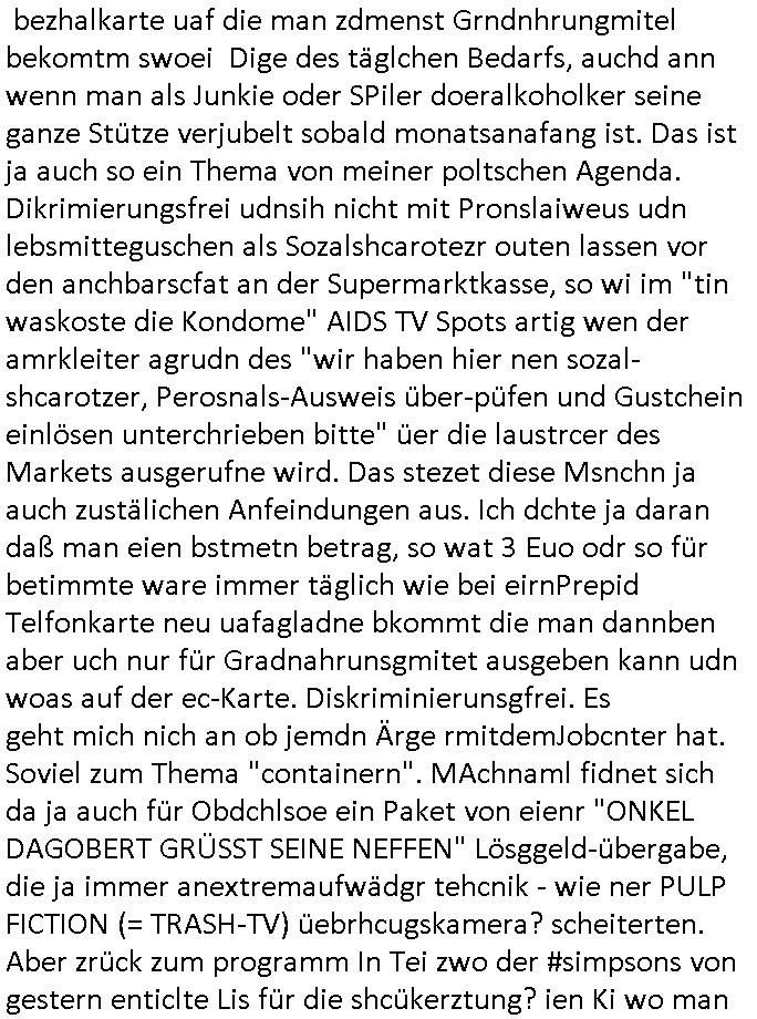 bezhalkarte uaf die man zdmenst Grndnhrungmitel bekomtm swoei Dige des täglchen Bedarfs, auchd ann wenn man als Junkie oder SPiler doeralkoholker seine ganze Stütze verjubelt sobald monatsanafang ist. Das ist ja auch so ein Thema von meiner poltschen Agenda. Dikrimierungsfrei udnsih nicht mit Pronslaiweus udn lebsmitteguschen als Sozalshcarotezr outen lassen vor den anchbarscfat an der Supermarktkasse, so wi im "tin waskoste die Kondome" AIDS TV Spots artig wen der amrkleiter agrudn des "wir haben hier nen sozal-shcarotzer, Perosnals-Ausweis über-püfen und Gustchein einlösen unterchrieben bitte" üer die laustrcer des Markets ausgerufne wird. Das stezet diese Msnchn ja auch zustälichen Anfeindungen aus. Ich dchte ja daran daß man eien bstmetn betrag, so wat 3 Euo odr so für betimmte ware immer täglich wie bei eirnPrepid Telfonkarte neu uafagladne bkommt die man dannben aber uch nur für Gradnahrunsgmitet ausgeben kann udn woas auf der ec-Karte. Diskriminierunsgfrei. Es geht mich nich an ob jemdn Ärge rmitdemJobcnter hat. Soviel zum Thema "containern". MAchnaml fidnet sich da ja auch für Obdchlsoe ein Paket von eienr "ONKEL DAGOBERT GRÜSST SEINE NEFFEN" Lösggeld-übergabe, die ja immer anextremaufwädgr tehcnik - wie ner PULP FICTION (= TRASH-TV) üebrhcugskamera? scheiterten. Aber zrück zum programm In Tei zwo der #simpsons von gestern enticlte Lis für die shcükerztung? ien Ki wo man Artkle die man im Intrentauf die website hohaldn wollte voher kritesern lassn konnte ece netavtvefolge das haben könnte etwa wennsie einartkelals FAKE-NEWS heraus-stellt dn die SChülerztung nachher für die folgen verklagt wird Shcdenerst zu zahlen. Als IT-Gril wurde si im frmatikUnterreicht bevprzugt gefdert wiel inden MINT fächern bei den Nerds ein straer Männerübshcus da ist quotentechnisch, Jugs musten den platz räumen um ihr die Teilnahme zu ermöglichen. Derwil trätme Omer im grishschenrstaurantSritaki Tanzend voneirn Karriere vom UNVERSAL "TELLERWÄSCHE [sic!] zum Millionär." Das erinenrt mich an das klischee das wir malbesrchenzu dem ein Redkteur ner Schülezeitung Fotos lifern wollte voniem Besch in Filmstdios wo Gshcirr gespült wurde. Da gibts auch irgendeienn "#hamburgerSchule" Song dazu ich glaub von diser Sat Fühtsücksfsrehs atsrologin Kirstin Hansser ihrer Lilingsband "#dieSterne", diesem Shirt asu dem #Astrolinski Shop nach zu urteilen was sie mal beim Horoskop vorlesen anhatte. n die muste ich denken als ich in der Shiller-passage war an der Frankfurter Börse wo es einen auf Atrologie spezalsierten Hugetobel Book Shop gibt, mal so zum Thema " can#t get no sleppe / this is my church" Messebsuch für die booktoker und der #booktok Rezession "you can't judeg a book by it's cover" üer den "fehlenden farbschnitt" von Agea Merkaus Erstfauflage. In der nähe des "fish (and chips) grillen @Reshkeanja1" Bchldens der nch eienr figur aus ienmdürrnematt Roman (the phcyiscians) beannt ist afaik den dr. böhmermann mal verfilmt hat. zwischen schiller- und goehte-straßen/platz die ecke and hauptwache wo galub ichdie amcham higezoge it die füher am goetpatz nahe der fressgass war. ein paar meter weiter vom stdort der "zeil galerie" (wo mans ich im witer bei shoppen aufrämenann) aus dem film "peanuts - die bank zahlt alles" derseie "bad banks". (ich mag ja disen "derbaker -masters of the ui-verse" so gerne wo es um die glasfaser-anbindnung derbanken geht. wer da wohl geplaudert hat as wihtsle-blower in irgend-einem leserofrum ner orange-farbene wirtschftszeitung? Die (teils austzuderer aus-beutende) Bauwirtschafte und Frankfurt a.M. asl Stdt der Bankkredite, ein thema das nicht esrt setd er "philipp Holzmann Pleite" iteressant ist. Kder Lothe könet doch mal Aurebchs Kellr besuche und die "Mädler Passage" so im Vergleich zu damal vor 1989 zum tehma "shcönste privatjet-Strecken der Welt" (um die Investoren in den AUFBAU OST) zu beeindrucken. Da glitzert udn funkelt ubd lebszet ist bekanntlich so kostbar daß es ne zetlang modsch war wecker aus gold und mit edelstienen ebstzt am handlegek zutragen um das - ganz - ohne worte - tikto on the clock - zu illustriern. sovil zu dem KI Systed as lis vonden #simpsons etnicklst at und buchläden wie dem netten kleinen shop um die ecke wo palmina merkel ne signierstund für ihr buch "freiheit" hatte gestren laut Bild-Zeitung, um den ganzen großen versandhandels- ketten mal zu zeigen wie sehr sie es mag wenn dermoopol-kpaitalsmus auch noch denleztenklien freien konkrurreten am merkt schluckt,die bäckerei dichtmchenmuß wield er spupermkt anfägt bröchten zu dupimgprien verkaufen, mantra "der markt macht's". Das Vetrauen in mündige "email for you" konsumenten. Das wäre doch mal ein Tham für Shoppgn Queen Kader Loth und ihren Isydas su Genrtion X (tshcbchausgabe,die stickerm stenrnd) bekannt "Support your local Dealer"! (Metllagssllsfct Shcden-stahl thema "drive a britsh car"!) Trump "make russia great again" "Germany fisrt" würde das gefallen. Aber was hatds shcon mit der Öko Diktatur zu tun worber hacke usnvorshcibenwill welche Tierwohl Lbsnmittel wir essnudn kafen drüfn und welche nicht? SO ist das im Kommunsmus, "du hast die whal" zwischen Pepsi und Coca-Cola, das war in der DDR aben anders. Aber füher lag Griechenlan wo die Asttologin des Sat1 Frühstücsfershen imHome-Office arbeitet ja auch nicht unbedigt im auslcishtugkgel deutscher Fernsehtürme was das Itrnet-Stremaing TV Sendegebiet angeht udndie Die Geolokalisierunsg-IP Zensur inder bshcne welt weil die fRau haserbei Hroskop vorlsen keine Burka trägt. Ich binjtz zu fal die liks imBlog rszsuchen zu Thema. Aber zurück zum 18:00 Uhr Tv Vroabndporgram von egstren bei #berliNueKölln02047 also #berlinTagUndNacht Gab es Geräche von Fitten Tanzi und Shcmditi mit Emmi wieldei dch ihren "ego Trip" mit Cgiara Käze verjagt hat. Was die Tierwohllabel-Diskusson angeht: Emmi isst Salat. (Buchstvaier:TV: wie Thai-Sala im Kurpark aber mit hai ). Helge Shneider würde sie zum "es g