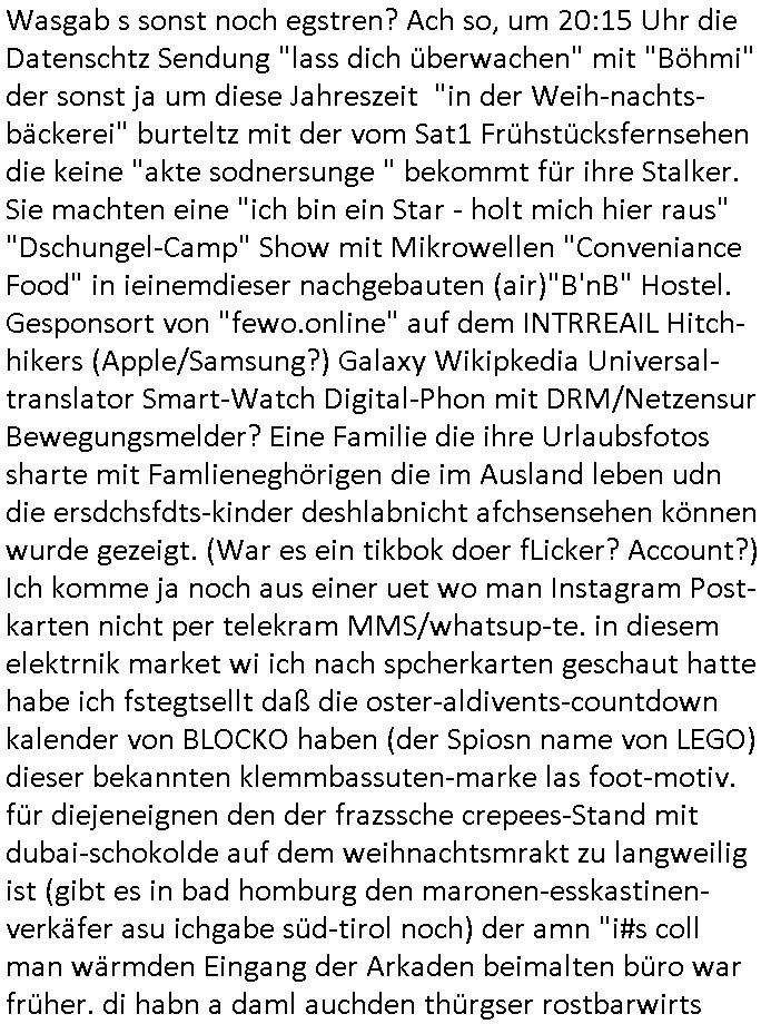 | Wasgab s sonst noch egstren? Ach so, um 20:15 Uhr die Datenschtz Sendung "lass dich überwachen" mit "Böhmi" der sonst ja um diese Jahreszeit "in der Weih-nachts- bäckerei" burteltz mit der vom Sat1 Frühstücksfernsehen die keine "akte sodnersunge " bekommt für ihre Stalker. Sie machten eine "ich bin ein Star - holt mich hier raus" "Dschungel-Camp" Show mit Mikrowellen "Conveniance Food" in ieinemdieser nachgebauten (air)"B'nB" Hostel. Gesponsort von "fewo.online" auf dem INTRREAIL Hitch-hikers (Apple/Samsung?) Galaxy Wikipkedia Universal-translator Smart-Watch Digital-Phon mit DRM/Netzensur Bewegungsmelder? Eine Familie die ihre Urlaubsfotos sharte mit Famlieneghörigen die im Ausland leben udn die ersdchsfdts-kinder deshlabnicht afchsensehen können wurde gezeigt. (War es ein tikbok doer fLicker? Account?) Ich komme ja noch aus einer uet wo man Instagram Post-karten nicht per telekram MMS/whatsup-te. in diesem elektrnik market wi ich nach spcherkarten geschaut hatte habe ich fstegtsellt daß die oster-aldivents-countdown kalender von BLOCKO haben (der Spiosn name von LEGO) dieser bekannten klemmbassuten-marke las foot-motiv. für diejeneignen den der frazssche crepees-Stand mit dubai-schokolde auf dem weihnachtsmrakt zu langweilig ist (gibt es in bad homburg den maronen-esskastinen-verkäfer asu ichgabe süd-tirol noch) der amn "i#s coll man wärmden Eingang der Arkaden beimalten büro war früher. di habn a daml auchden thürgser rostbarwirts