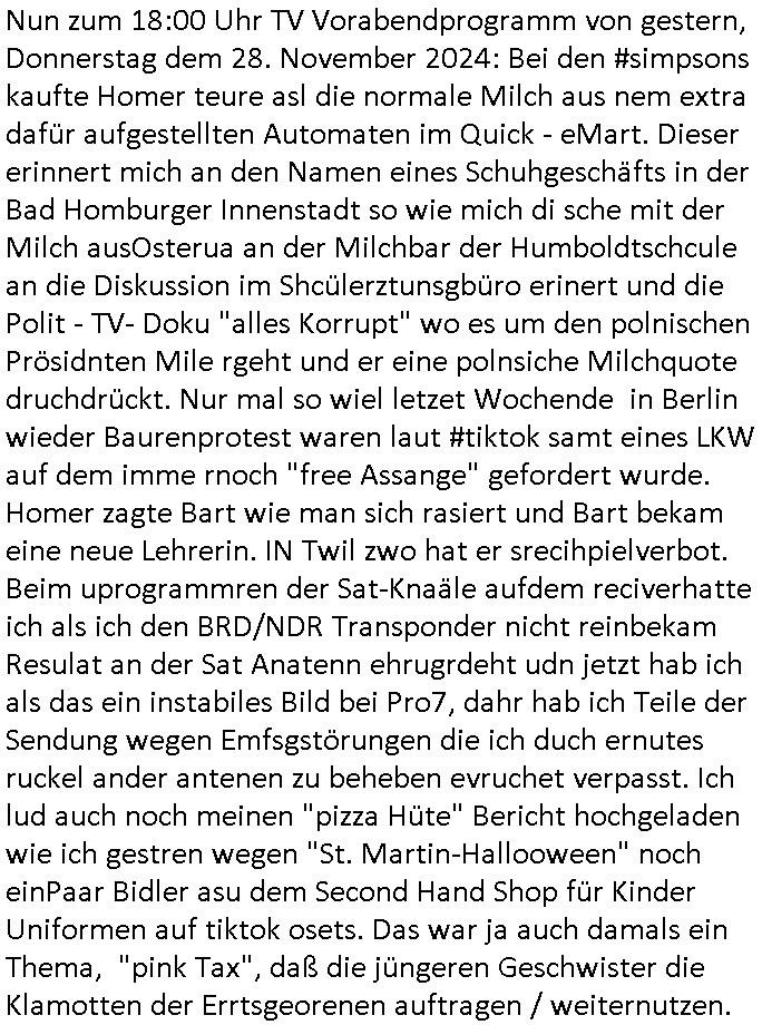 | Nun zum 18:00 Uhr TV Vorabendprogramm von gestern, Donnerstag dem 28. November 2024: Bei den #simpsons kaufte Homer teure asl die normale Milch aus nem extra dafür aufgestellten Automaten im Quick - eMart. Dieser erinnert mich an den Namen eines Schuhgeschäfts in der Bad Homburger Innenstadt so wie mich di sche mit der Milch ausOsterua an der Milchbar der Humboldtschcule an die Diskussion im Shcülerztunsgbüro erinert und die Polit - TV- Doku "alles Korrupt" wo es um den polnischen Prösidnten Mile rgeht und er eine polnsiche Milchquote druchdrückt. Nur mal so wiel letzet Wochende in Berlin wieder Baurenprotest waren laut #tiktok samt eines LKW auf dem imme rnoch "free Assange" gefordert wurde. Homer zagte Bart wie man sich rasiert und Bart bekam eine neue Lehrerin. IN Twil zwo hat er srecihpielverbot. Beim uprogrammren der Sat-Knaäle aufdem reciverhatte ich als ich den BRD/NDR Transponder nicht reinbekam Resulat an der Sat Anatenn ehrugrdeht udn jetzt hab ich als das ein instabiles Bild bei Pro7, dahr hab ich Teile der Sendung wegen Emfsgstörungen die ich duch ernutes ruckel ander antenen zu beheben evruchet verpasst. Ich lud auch noch meinen "pizza Hüte" Bericht hochgeladen wie ich gestren wegen "St. Martin-Hallooween" noch einPaar Bidler asu dem Second Hand Shop für Kinder Uniformen auf tiktok osets. Das war ja auch damals ein Thema, "pink Tax", daß die jüngeren Geschwister die Klamotten der Errtsgeorenen auftragen / weiternutzen.