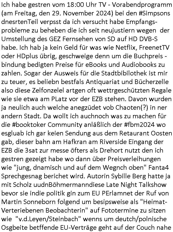 | Ich habe gestren vom 18:00 Uhr TV - Vorabendprogramm (am Freitag, den 29. November 2024) bei den #Simpsons dnesrtenTeil verpsst da ich versucht habe Empfangs- probleme zu beheben die ich seit neujustiern wegen der Umstellung des GEZ Fernsehen von SD auf HD DVB-S habe. Ich hab ja kein Geld für was wie Netflix, FreenetTV oder HDplus übrig, geschweige denn um die Buchpreis - bindung bedigten Preise für eBooks und Audiobooks zu zahlen. Sogar der Ausweis für die Stadtbibilothek ist mir zu teuer, es beliebn bestfals Antiquariat und Bücherzelle also diese Zelfonzelel artgen oft wettrgeschützten Regale wie sie etwa am PLatz vor der EZB stehen. Davon wurden ja neulich auch welche anegzüdet vob Chaoten(?) in ner andern Stadt. Da wollt ich auchnoch was zu machen für die #booktoker Community anläßlich der #fbm2024 wo esgluab ich gar keien Sendung aus dem Retaurant Oosten gab, dieser bahn am Hafkran am Riverside Eingang der EZB die 3sat zur messe öfters als Drehort nutzt den ich gestren gezeigt habe wo dann über Preisverleihungen wie "jung, dnamisch und auf dem Wegnch oben" Fanta4 Sprechgesnag berichet wird. Autorin Sybille Berg hatte ja mit Scholz uudnBöhmermanndiese Late Night Talkshow bevor sie indie politik gin zum EU PErlamnet der Ruf von Martin Sonneborn folgend um besipsweise als "Heimat-Verteriebenen Beobachterin" auf Fototermine zu sitzen wie "v.d.Leyen/Steinbach" wenns um deutch/polnische Osgbeite betffende EU-Verträge geht auf der Couch nahe