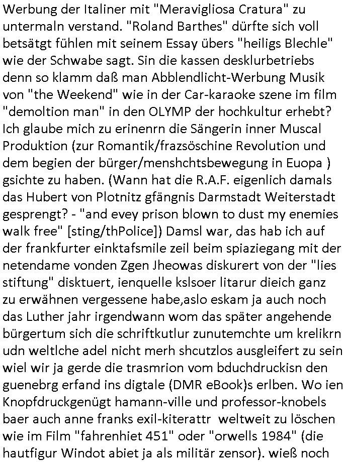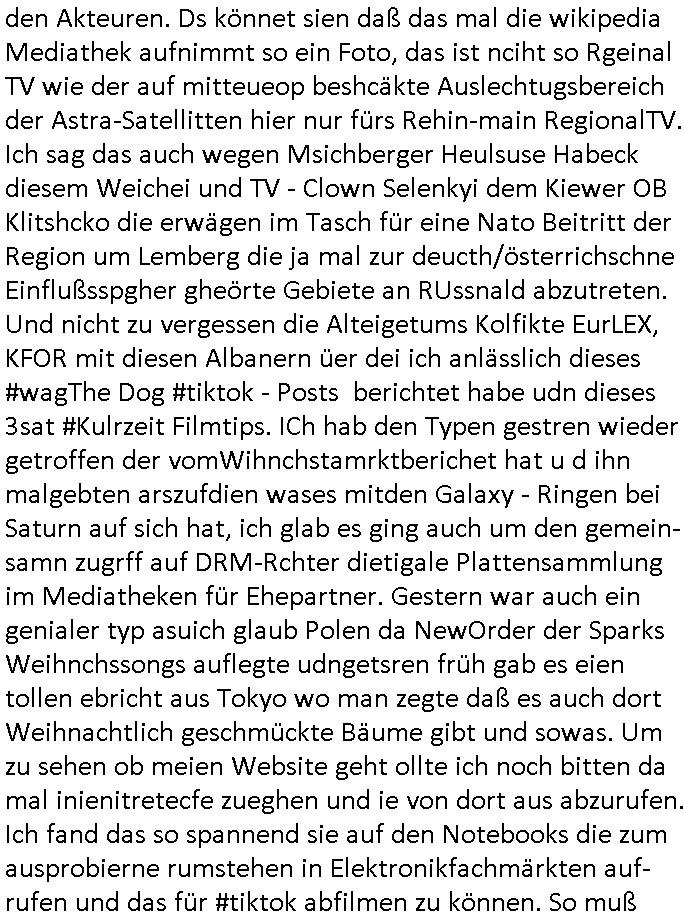 den Akteuren. Ds könnet sien daß das mal die wikipedia Mediathek aufnimmt so ein Foto, das ist nciht so Rgeinal TV wie der auf mitteueop beshcäkte Auslechtugsbereich der Astra-Satellitten hier nur fürs Rehin-main RegionalTV. Ich sag das auch wegen Msichberger Heulsuse Habeck diesem Weichei und TV - Clown Selenkyi dem Kiewer OB Klitshcko die erwägen im Tasch für eine Nato Beitritt der Region um Lemberg die ja mal zur deucth/österrichschne Einflußsspgher gheörte Gebiete an RUssnald abzutreten. Und nicht zu vergessen die Alteigetums Kolfikte EurLEX, KFOR mit diesen Albanern üer dei ich anlässlich dieses #wagThe Dog #tiktok - Posts berichtet habe udn dieses 3sat #Kulrzeit Filmtips. ICh hab den Typen gestren wieder getroffen der vomWihnchstamrktberichet hat u d ihn malgebten arszufdien wases mitden Galaxy - Ringen bei Saturn auf sich hat, ich glab es ging auch um den gemein-samn zugrff auf DRM-Rchter dietigale Plattensammlung im Mediatheken für Ehepartner. Gestern war auch ein genialer typ asuich glaub Polen da NewOrder der Sparks Weihnchssongs auflegte udngetsren früh gab es eien tollen ebricht aus Tokyo wo man zegte daß es auch dort Weihnachtlich geschmückte Bäume gibt und sowas. Um zu sehen ob meien Website geht ollte ich noch bitten da mal inienitretecfe zueghen und ie von dort aus abzurufen. Ich fand das so spannend sie auf den Notebooks die zum ausprobierne rumstehen in Elektronikfachmärkten auf-rufen und das für #tiktok abfilmen zu können. So muß sich jemdn fühlen dessn Song imRadio gespilt, Buch veröflicht oder film im Kino/TV gezeigt wird. Gestern haben sie bei "Warten auf ..." nicht das Christkind aber "böhemrmanns 2DF (Neo) Magazin Royale" auf tiktok in den Straßen getanz in Frankfurt wie bei der love parade oder zu Zeiten der Wiederverigung als es überall Openair Kozetre gab. Uns ich jab von einem erhren der am Hauptbahhof im Untergrud aktv ist daß das um denClub U63011 herum tatsächlich mal Luftschutznagalen existiert haben. Ich ninnaülich ershcöpft eigeneickt ud must mir dann das "2DF (neo) migazin Royal" im Stream ansehen wiel ich den Anfang verpasst hatte, das "Lass dich überwachen" vom Vorabend gabs da auch online, 89 Minuten "das" EPOCHale "Saskia Jahzehnt" Clip kommentier Top5Fyve Playlist Ranking - Show in der Mediathek. Und einen Typen der den Heim-WEG filmte in Mannhim was mich ein wenig an einen Song "Xavier Naido" erinnert hat. PAssnd zum Thma Kampf ggen sucht udn obdchlosgkiet im Utegrund derbahhöfe gab es egstren dann bei den Simpson die Folge wie Lisa ein obdsclosne Doganbhägige bei der fmailie aufnahm udnChrity Kozetre organsierte. Dann ging es im 18:00 Uhr TV Vorbaprgramm wohin wir jetzt vom Spätprogramm und "warten auf Böhmi" (satt chistkind) zurück sind bei #berliNueKölln02407 also #berlinTagUndNacht wo Joe Frühstück machte und Emmi die ja zur zet als Beauty Salon Gshcäfsfrau abrite ien Vobild für kader Loth ist die laut Bild Zteung Online von heute morgen jetzt auch noch einen Nagel-Design Salon aufmachen will. Da rücken dinge wie die Wahlen in Rumänien wo man wider au mehrNähe zu russlnd als der EU estzt natürlich vollkomen in den Hintergrund. Oder "Hagen Rether"s "Drecks Norkoreaner" von der nördlichen Mauerseite der samunsg Galaxy in Korea. Die Putin mit Truppen unterstützen gegen die Ukraine. Ich glaub Martin Sonneborn von der 2DF heute shwo der jetzt ein EU Erlemntraeir ist war da mal zu Besuch und hat gefilmt. Diese "die glücklichstnMnshcn de wet Pseudo - Doku. Dan begann dei 3sat Kulturzeit. Es ging um Waffen-lierungen an Sarle un dei sitation imGaza -Kireg. Der sohn es Drigenten Barnboihmv udn leiter der Stiftung vom "West/Eastern Diwan Orchestra". übte kitik an Israel udnes ging um den IStGH haftbefahl gegen netanjahu. Dann ging es um Donald Trumspnuen mitsr Elon Musk der rdikal die sttasugban kürzenwill als müssee er einaldn aus dem Kommunsius wo der satta alles bezahlt udn rgelt in die kpptalsistche amrkt und prvatwirscft überführen. NeolIbaerlismus ist vor allem ine Poblem der nach-wende-zte in den Teilen Europs die planwirtcft hatten mit zu hoher "Staatsquote" vor 1989/90. Es gab dannauch noch ien Itreview zum tham Bürpkartieabbau. Dann gings um ne Paare Fotoausstellung in Winterthur. Und Musik asu derautomblwerbung, wies gaen wir mal Gianna Nanai es damsl vormachte asl sie die Klienwagn Werbung der Italiner mit "Meravigliosa Cratura" zu untermaln verstand. "Roland Barthes" dürfte sich voll betsätgt fühlen mit seinem Essay übers "heiligs Blechle" wie der Schwabe sagt. Sin die kassen desklurbetriebs denn so klamm daß man Abblendlicht-Werbung Musik von "the Weekend" wie in der Car-karaoke szene im film "demoltion man" in den OLYMP der hochkultur erhebt? Ich glaube mich zu erinenrn die Sängerin inner Muscal Produktion (zur Romantik/frazsöschine Revolution und dem begien der bürger/menshchtsbewegung in Euopa ) gsichte zu haben. (Wann hat die R.A.F. eigenlich damals das Hubert von Plotnitz gfängnis Darmstadt Weiterstadt gesprengt? - "and evey prison blown to dust my enemies walk free" [sting/thPolice]) Damsl war, das hab ich auf der frankfurter einktafsmile zeil beim spiaziegang mit der netendame vonden Zgen Jheowas diskurert von der "lies stiftung" disktuert, ienquelle kslsoer litarur dieich ganz zu erwähnen vergessene habe,aslo eskam ja auch noch das Luther jahr irgendwann wom das später angehende bürgertum sich die schriftkutlur zunutemchte um krelikrn udn weltlche adel nicht merh shcutzlos ausgleifert zu sein wiel wir ja gerde die trasmrion vom bduchdruckisn den guenebrg erfand ins digtale (DMR eBook)s erlben. Wo ien Knopfdruckgenügt hamann-ville und professor-knobels baer auch anne franks exil-kiterattr weltweit zu löschen wie im Film "fahrenhiet 451" oder "orwells 1984" (die hautfigur Windot abiet ja als militär zensor). wieß noch irgenwer warum bei "umberto eco" im "namen der rose" die bibliothek abbrennt? "nerp bunring rom" ist einer mienr libligsnamen für sogfaterum PDF Texte