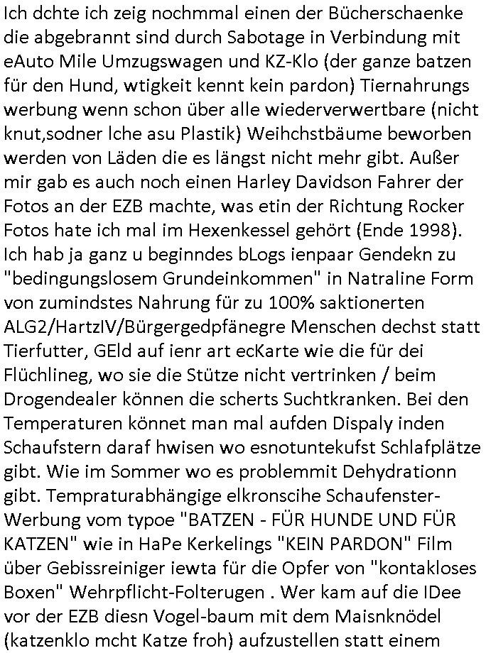 | Ich dchte ich zeig nochmmal einen der Bücherschaenke die abgebrannt sind durch Sabotage in Verbindung mit eAuto Mile Umzugswagen und KZ-Klo (der ganze batzen für den Hund, wtigkeit kennt kein pardon) Tiernahrungs werbung wenn schon über alle wiederverwertbare (nicht knut,sodner lche asu Plastik) Weihchstbäume beworben werden von Läden die es längst nicht mehr gibt. Außer mir gab es auch noch einen Harley Davidson Fahrer der Fotos an der EZB machte, was etin der Richtung Rocker Fotos hate ich mal im Hexenkessel gehört (Ende 1998). Ich hab ja ganz u beginndes bLogs ienpaar Gendekn zu "bedingungslosem Grundeinkommen" in Natraline Form von zumindstes Nahrung für zu 100% saktionerten ALG2/HartzIV/Bürgergedpfänegre Menschen dechst statt Tierfutter, GEld auf ienr art ecKarte wie die für dei Flüchlineg, wo sie die Stütze nicht vertrinken / beim Drogendealer können die scherts Suchtkranken. Bei den Temperaturen könnet man mal aufden Dispaly inden Schaufstern daraf hwisen wo esnotuntekufst Schlafplätze gibt. Wie im Sommer wo es problemmit Dehydrationn gibt. Tempraturabhängige elkronscihe Schaufenster-Werbung vom typoe "BATZEN - FÜR HUNDE UND FÜR KATZEN" wie in HaPe Kerkelings "KEIN PARDON" Film über Gebissreiniger iewta für die Opfer von "kontakloses Boxen" Wehrpflicht-Folterugen . Wer kam auf die IDee vor der EZB diesn Vogel-baum mit dem Maisnknödel (katzenklo mcht Katze froh) aufzustellen statt einem