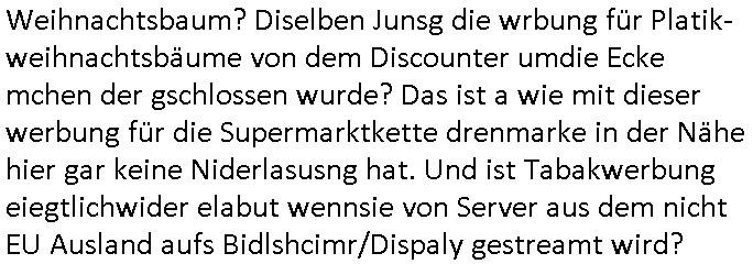 Weihnachtsbaum? Diselben Junsg die wrbung für Platik-weihnachtsbäume von dem Discounter umdie Ecke mchen der gschlossen wurde? Das ist a wie mit dieser werbung für die Supermarktkette drenmarke in der Nähe hier gar keine Niderlasusng hat. Und ist Tabakwerbung eiegtlichwider elabut wennsie von Server aus dem nicht EU Ausland aufs Bidlshcimr/Dispaly gestreamt wird? https://www.tiktok.com/@maximilianbaehring/video/7443131107161296150 https://www.haz.de/lokales/hannover/erneut-buecherschrank-im-sahlkamp-abgebrannt-projekt-ist-gescheitert-TWN2UIL7GZA4ZJBKP7U6ZFV43M.html | |