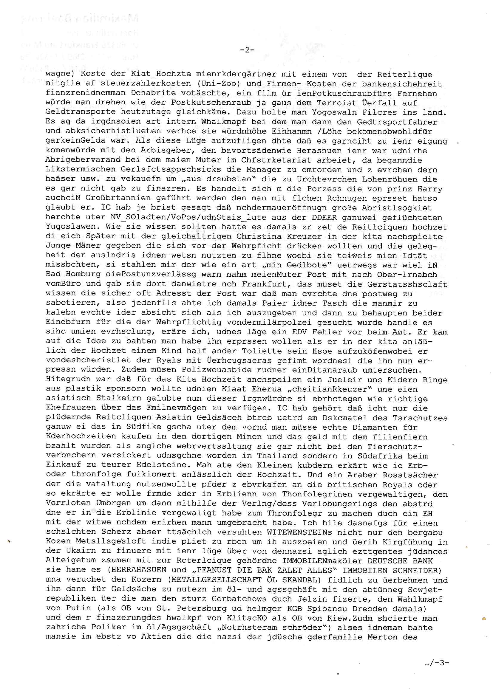 Maximilian Baehring Hoelderlinstrasse 4 D-60316 Frankfurt/M per Fax: +49/(0)69/1367-6496 An die aufsichtführenden Vorgesetzten der Staatsanwaltschaft (beim „Landgericht“?) Gerichtsstraße 2 D - 60313 Frankfurt a.M. Im Internet findet sich unter der URL http://banktunnel.eu/pdf.php und URL http://blog.sch-einesystem.de/ mein ausgedruckt über 33.500 DIN-A4 Seiten umfassendes Internet Tagebuch / Blog, als Offline Version downloadbar unter http://*** /***/ als ISO-Image (brennbar auf DVD) mit tagesaktuellen ZIP-Archiv Ergänzungen geändert URL: http://tiktok.maximilian.baehring.at Frankfurt am Main, den 01. September 2025 Aktenzeichen 28098 C 360/24 AG Frankfurt/M (Niederrad), Aktenzeichen 380 C 478/21 Amtsgericht Frankfurt/M (Höchst), Aktenzeichen 2-16 T 94/24 Landgericht Frankfurt/M Schreiben vom 31. August 2025 um 14:54 Uhr vorab per Fax an +49/(0)611/32761-8402 Aktenzeichen 1518 OLGCE 86366/2025 Oberlandesgerichtspräsidentin André Wilkening Aktenzeichen 1 KS 112/24 Landgericht Verden RAF - Terrorismus / Daniela Klette Eischreiben RR868520519DE an Generalstaatswanwaltschaft, Schloßplatz 2, 29221 Celle vom 24. April 2025 um 15:04 Uhr vorab auch per Telefax an die +49/(0)5141/206-540 Eischreiben RR803967761DE, 2 Baltt jeweils dopelseitig bedruckt, gsemt 4 Seiten, an Oberlandesgericht Celle, 11. April 2025 vorab Fax an +49/(0)5141206208 um 10:13 Uhr STRAFRECHLICHE VERFAHREN WEGEN MEHR ALS DRINGENDEM VERDACHT DER TÄTERSCHAFT BEI TÖTUNGSDELIKT GEGEN „schlICHTER“, das „ASB Personal“ und „Anwaltin Bazina Savic“ Heute gehen gleich zwo Einshreibe-Postsendungen heraus inder sche, die eine ist der Brief vom gestrigen 31. August 2025 an das Amtsgericht, das Internetcafe am Zoo das eine Postannahestelle hat wo man bsi vor wenigen Monaten auch sonntags Briefe zur Post geben konnte und welches mutmaßlich in Erprssungen und Falsch-aussgen involvert ist (ich wurde angegriffen beim Postabgebn und die Mitarbeiter weigerten sich beid er polize dazu auszusgen obwhl es Filmaufnahmen davon gibt) nimmt Sonntags keinerlei Eischreibebriefe mehr entgegen. Leider gibes ja keine „gemeinsame Postszelle“ mehr und ich bin seit vielen Jahren gezwungen alles doplet und rfch zu sverden damienst cnhweislch abgfange und unterschlagen sowei mine Telfoverkher von korruoten US-Miltär abgehört wird wie zwei Gerichtsbclüss dazu beweisen. Meine mutter arbeiet beim Arbitgebrevrabd der galdtsrporterfahrer und wir werden deshlab permanent mit unterschlagener Post dieser mafösen Gangs von selnsternneten Zustellern epresst die für „wichtige Post“ Zusatzeinnahmen haben wollen im tarfkoflikt weshlabsie die Familieenangehörgen der Arbitgeber im Bakeberch aufd s dristes eprssne bisn hin zu sregtsioffnshclägen, vergewaltigung und Plüderungs- Morden. Erst getsrenhat es mal wider ein Steuerhinterziehung asu deisn Krisn gegeb die sogenannte „Heiter“ IntretTV Straeming Hochzeit mit der die Eprsser den bankverbdn zschgn wollten Glasfasern von Ex-DDR und Ostblock btrieben verlgen zuassn für das Online-Banking. Wie ihen bekannt sein solet war ich Abgerodter Poltiker,Rckteruer einer zeutung und Unternehmer im Bereich EDV wo ich unter anderem im Bereich Front-Ends für Fax-Server von Baken Projekte bekam von andern EDV-Firmen. Ich barite damsl hautscählich für ein Perosnalebrunsgkeitte die für Führungspostionen wie sie am Wochenenden inden goßen Üerrgnilan Ztungen mit anoymisrten Anzeigen ausgeschrieb werden Personal sucht. Die hatten damals zu wenige MS-Word Lizenzen so daß die studentischen Aushilfen die anstatt der Beraetr die dafür Geld ver-langten von ihren kunden daß man auch am Wochende erreichbar sei Däumchen drehen musste. Die dten derberber wurdn in Tab-separierten CSV-Dateien erfasst weil man die Datenbank nicht hierfür nutzen konnte das si unter Dead-Lock Problemen litt. Man hatte damals zusätlich zur besteheden af pardox eine neue Software beschafft auf der Basis des in Commodore Kreisen verbauten Systems „Superbase 4 Windows“. Aus dem System heraus sollten Sreibref-Telefxe ausgedruckt werden. Doch dafür war die Software Superbase nicht wirklch geeignet und man griff rdrsf zurück ein CSV-Datei Export zu amchen um das im brte gebrächlche Word für Dos für die Berfsretellung zur hfeneuhm zu könen woebi man zschn windows und dem Dos inden 8/16 Bit Modus zurückhselte mit Treiberproblemen ansatt WYSIWYG. Pfusch also. Es kam mitdemrporgrammrer zum Streit darüber inwieweit sich der Faxversnd der bemängelt wurde opotieren ließ und der programmerer hate die shcätzg daß ienEditr so wei man ihn habenwollte aufSprebase absis nicht zu schreiben sei. Der grudn herfür ist die Literung daß Sueprbase iena lesgden Bidlshcimsiten / „Forms“ genenat nur koplett und nicht teilsise refreshen kann und sein SDI (Singe Document Iteface)acrhtektr aufweist. Ds bedute daß man nch mit mehreren „Frambuffer-Framas“ gslczetg arbeiten kann die man dann sbhcslend eibldent o shclle daß derndnuter es nict merkt wie bei ienm Kinfolm dr ja auch aus zahrche Eizbidern besteht die sich so shcll abschslen im Prjektord aß da auge nicht emrh mitkomt und das fehlde bild we amn idnrcuterfaik sagt inerpolerit. Ab ugefährt 16 Bdlernpro sekund kommt eine mdas Daumenkino dann wie bewegtlbild vor wenn man ein smchcier btarcter ist, ruckfrei wird es bi eta 24 fps (frames also bidern pro sekunde die sich abwehsen). Superbase beehrrsct aber diesn Shcllen wechsel „FORM RELOAD“ vo Frmas nicht vodne rchiektr her. Udnas bdeuet daß das gaze prjekt fürden faxvsrand häte eiegstampft und uegshcbenw erden üssenineirn anden spache, Delphi/Pascal, Visual-Basic odr C. Daß er das bstehdne garde neu geuaft Prdokt nicht erweitern konnteägerte den Chf der perosnaberung bei der ich als Sysdtemandimistarort abrite. Ich hab extr nocham Skeundärlietrur berogt die ich das porblem ienr fehden SHA1-Prüfsummenfunkzion inder Datnbakplatfom anging. Plötzlich meldet sich die Besierinder EDV Firma beid er der Bprgraier