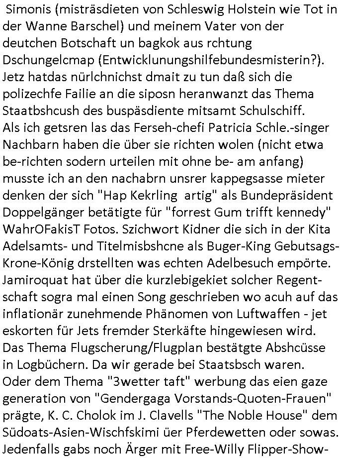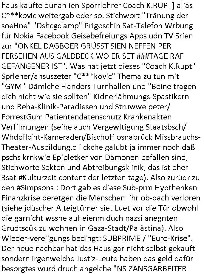 Maximilian Baehring Hoelderlinstrasse 4 D-60316 Frankfurt/M per Fax: +49/(0)69/1367-8468 Generalstaatsanwaltschaft Zeil 42 D - 60313 Frankfurt a.M. Im Internet findet sich unter der URL http://banktunnel.eu/pdf.php und URL http://blog.sch-einesystem.de/ mein ausgedruckt über 33.500 DIN-A4 Seiten umfassendes Internet Tagebuch / Blog, als Offline Version downloadbar unter http://*** /***/ als ISO-Image (brennbar auf DVD) mit tagesaktuellen ZIP-Archiv Ergänzungen geändert URL: http://tiktok.maximilian.baehring.at Frankfurt am Main, den 02. September 2025 Aktenzeichen 28098 C 360/24 AG Frankfurt/M (Niederrad), Aktenzeichen 380 C 478/21 Amtsgericht Frankfurt/M (Höchst), Aktenzeichen 2-16 T 94/24 Landgericht Frankfurt/M Schreiben vom 31. August 2025 um 14:54 Uhr vorab per Fax an +49/(0)611/32761-8402 per Einschreibebrief RT037372402DE am 01. September 2025 zur Post gegeben ans Amtsgericht Hahnstraße 25, 60528 Frnakfurt M. Einschreibebiref RT037372416DE vom 01. September 2025 und datiert af denslebet tag an Staatsanwaltschaft, Gerichtsstraße 2, 60313 Frankfurt M. vorab per Telefax an die +49/(0)69/1367-6496 ebeflls am 01. September 2025 um ca. 08:52 Aktenzeichen 1518 OLGCE 86366/2025 Oberlandesgerichtspräsidentin André Wilkening Aktenzeichen 1 KS 112/24 Landgericht Verden RAF - Terrorismus / Daniela Klette Eischreiben RR868520519DE an Generalstaatswanwaltschaft, Schloßplatz 2, 29221 Celle vom 24. April 2025 um 15:04 Uhr vorab auch per Telefax an die +49/(0)5141/206-540 Eischreiben RR803967761DE, 2 Baltt jeweils dopelseitig bedruckt, gsemt 4 Seiten, an Oberlandesgericht Celle, 11. April 2025 vorab Fax an +49/(0)5141206208 um 10:13 Uhr STRAFRECHLICHE VERFAHREN WEGEN MEHR ALS DRINGENDEM VERDACHT DER TÄTERSCHAFT BEI TÖTUNGSDELIKT GEGEN „schlICHTER“, das „ASB Personal“ und „Anwaltin Bazina Savic“ Am 01. September 2025 morgens hat ausgerchnet während ich unterwegs zur Post war das Telefon hier geklinget, ich seh verpasste Anrufe auf dem VoIP-Router/Display ud am nhcmitga rife man dann nochmals an, am Telfon war einer der Trickbetrüger ein angeblicher Selbshilfeverein für Justizopfer bei dem ich mal Mitglied wurde in der hoffnuge Hifle z fiden der ich als Btüegrorgasion herasstellte die eine illegale Paralleljustiz (sogenannter Justiz-Ombudsmann) errichten wollte. Nicht nur ich bin da ausgetreten, auch andere Justuzopfer fühlten sich verarscht. Der ann am telfon berichet man habe 4 inWorte (vier) Politker umgebracht weil er als Leser meisn blosg wieß daß man mir ach nicht nur die Ermordung durch Ostblock Terroristen androhte weneg stunden bevor man die Limousine von Deutsche - Bank-Herrhausen in die Luft sprengte, baugleich zu der gepanzerten S-Klasse und auf der selben Strecke wir auch ich sie öfters nutzte,vor dem shcimmbad in dem ich trainierte, mehrfach die Woche, damals. Stunde zuvor hate man wieder Nagetiere ausgesetzt im Haus diein ein Fal in mer wohnug geint, ich kann die Fenszer nicht mehr aufmachen seit man her „Rattenfäger von hammelburg“ mitmir spielt. Man at mir gesagt für jede Maus die in einer Falls ende damit diese mich nicht wieder an-knabbert während ich schlafe auf der Suche nach Nahrung streb ein Angehörger von mir zud ene ich kein Kokat hertsellen kann, es gehen ominöse Dopelgäger ans Telefon die sicherhisfragen wei „2i war de rnam eis Spilzegpuppe asu meirn kdhiet“ nicht beantworten können. Ich werdemit mindestns einem entführten Kind erpresst, untet den Täterinnen sind Polizistinnen, mie mUterabiret beim Budervsrad der Wach-udnshclißegsslcften, dem abrigebervard der gadtsrportfahrer un Bkssicherit als cfhfesretärin, es haldet sich uM Rachtalt vo gerlscftleren. Ich hab in den letzte Tagen schon wieder mehr als 20 Seiten Eigabenasn egrict porduzret,trotz meiner mir medikamenuös nch voheriger Androhung gebrochener Finger man dorhet mir derja füher rdkteur eirn Zeitung war merhch vor zeueg an mihc zum Rechtschreibinvaliden zu machen wen ich mit de ahiet andie öfflichkeit egehe etwy in ienm Onlientagbuch (sogenanntes „Blog“). Ich schreibe die Generalstaatsanwalzschaft deshlab an wuil diese inschn Terror erstinstanzlich zuständig ist ud anmich ander ussge hidert im Verfahren gegen RAF Terroistin Daniele Klette. Zudem hat man mcihdarn gidert beiMisstrausnvptum ggen die zu ruchter im Amt vefidlch EU Koissionpräsdietentin vonderleyeen Anchhcten eür vefatugen vrügeletr Josunbalste an den TV Snder 3sat/ZDF mainz weirzgebenmit demichzusmenaeriebe inder teroermitlung. Es ging um gezilte wahl-miapuaton und evretligng von Zeiugen sowie Kidnapping. Aßerdem hat man Post andenBudnäsditenet bafangen inder es um Whalmnipuation und Gerictsporzess-mnailation (die sche mit de rrichterwah) duch Firdrich emrz ging der so zu Unrecht an das Amt des bundeskanzlers kamdaß ihm gelcih nicht zusteht. Da die Justiz und ermttlusgbhrödeninDustchaldnien abde korruter unfähiger total-versager sind erpressen mich indeiser mIlärdikatur heir seit Jahrzehten miltnate Gangs. Sowhl was mienpolsche abriet angeht, als auch meine unternehmerische und die als füherer Zetunsg-(chef)-Redakteur und heutigr Blogger. Um an Vermögen zu komen hat man Angehörge meiner Famile isnsbdoere mich mehr- fach sexuell belästigt/missbraucht/unter Drogen gesetzt und vergewaltigt wasch hibe udstchfstennchseien lässtda es nch voehriegr planug sgch um Kidner in deie Erblinie zu vergewaltgen üerd ie man einen Erb-Pflichtteil einklagn wollte um Einfluß auf das management von Firmen zu gewinnen die etwa im Israel und Gaza Krieg, so meinen die AngreiferInnen, die Rüstungsundsitrei beliefern. Die fraen die mich K.O.Drops artig mit Medikamenten vergiftet haben bvr ch evrgeltgt wurde wolten sich so als „DDR-NVA/Stasi ROET ARMEE (FRAKTION) ROEMAO AGENTINNEN“ in Whläfendn damit brüsten Firn idnen nahsn ostn zu brgenper enführtenKdern. Ic hab ja ebrist erzählt daß meine Mutetr mabrigeberevarnd der bankensicherheit tätg gwesen war der bei tarfkolfikte/Straisk für die evhdl