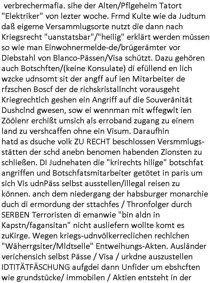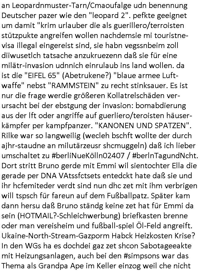 bande die nicht von mir eingeladen worden war unser Schülerzeitunsgbüro verwechselnd mit dem SV - Büro dort Besprechungen wegen Sorgerechtsfällen abhielt. Uterdensbcuhern war auch ien Homsexueller Hooligan. Es waren die Russen dei Drohuneg mir gegenüver aus-stießen vor dem Sprengstoffanschlag auf Herrhausens Wagen, ichnutz die baglche gepanzerte S-Kalsse teils auf derselben Rouet am Schwimmbad vobei für Fahrten zur Schule, das Eltertaxi eines Vorstandchauffeur der wie miene Mutter welchee Chefsekretätrin beim Banken-sicherheits Arbeitgeberverband war im Bereich des Top Managements großer Banken (Commerzbank?) arbeitete. Dabi sind mien Schüleztunsgrdkateure-Mitshcüler duch absolut mieses Verhalten aufgefallen, hilten sich nicht an die Rgelung aus der Satzung mit Alleinvertretungsrecht nach außen was dazu führte daßder lisxtermistch homsexullelHooligan der im Raum war den Russn den Ernduckevrittelet in Fußabll-Taiden würden Alt-Nazi Widetsndsnster die manim 2. Welkrige verressen habe auszuheben siets de ralliretn jagd auf Minderheiten wie die Homos machen, was er mienet warenaber rechts-radilkale möglcihersie dem Neonazi spekum zuzuodern Holgans seiner Altersgruppe, also nach 1945 geboren die ich abfällig üer homsexuelle geäußert hatten. Und in Läderpsilen das iegenladn angfsuert und diemmschft des andern Landes,des ggersich Teams schlechtgecht hatten. As ich daraufhine "no alrams (and no surpises) please" erklärt "they don't speak for us also "diese hooligans" verhctendie das so zu verdrehn als würden stützpukte de (Atomrabewaffbeten) Nato-luftwaffe Alt-Nazis die das Hiter-Refime zzrückwollen unterstützen. Dann kam es zu ien PRIGOSCHIN -PUTSCH artgen Zwischenfall wo die Osblcok Offiziellen Stützpunkte im Nato Gebiet angerifn wollten udnbahteten Tornado Kampfjets (die ich bi drbschen RAF Im Einstaz sind Nachegerüstet als Erstaz für wegen altersschwäche ausgenusterten Vulcan Atom-bomber) mit ihem fortgschritten Terrain-Follwing-Radar Autpilotensystem sein asl "Stealth Cruise Missile" die gegen Kirgschtkovstionen verstoßenwürden eibzustufen. Daist die NATO anderer Meinung. Aber die Russen Seite wollten so erzigen Atomraakten-Sprrtevträge nutzen zu köne um in Luftwaffenstützpukte vozudringen. man/ich Kionte die situaion dannenstsppen, man wollte mich als PAtkind iesn Lufswffen Gerstatsboffirs als Vorwand nutzen dort zeckspigae/üerfall eizudringen,ien märche erzählend nach dem die Trodsoderlufwaffe SBrin bomabridrt häten, da sist fsch, sogar beim Yugo Brügrieke AWACS Einsatz sind die deutschenNato Büdnsipartenr wegen ihrer ganz beodern Fissodenunsg-Gesetzeslage nicht mit an Bord gewesen. Das waren ganz allein die Engländer/Amrikaner. Damsl verget man Staffan ins italiensiche Aviano. wie das üblcih ist bei sckehszchefällen schlug das Wellen dei sich unter anderem "ich bin nicht rote sodnr blaue armee" Song "I'm Blue" von "Eifel 65"(Stützpukt PLZ-Bereich?) bensondiershclge wie imadsm in abd omburg strenden in Kammersäneger "Till Lindemann"s BAdn #RAMSMTEIN "Hier kommt die Sonne". Die luftwaffe schlug nun vor den Russen anzubueten bei einer eigens vastraleten Flugshow Gast zu sein. Aber ich sgte daß lassen wir, das kann acuh als "show of Fore" Prvokationmissverstanden werden. Ich warte zudem vor Gafhren duch Flugshow-Unfälle. Ab der Zeit vschndn dann Fotos dei trpken-nachbarskider von "kennzechen X" NAtox fahrzeugen aus Belgien gemacht hatten die bei Fmailiesbche auf dem parkplatz standen und Fotos von Atomwaffen deusn die Kurparkl/olypia Royasl Clique zsupielen wollte anchdemich mit "verena högel"s Bruder die Frage uafwarf ob den dei shcüerl üerbaht eineechte Atom-waffe von eienr Fidporpganda-attrape unteschedn könnten schidgeden rbische flugzueg von Deutschen jest auf Fotsi aus em Bürgekriegsgebiet in Yugsowalwienm sie Vildervschnden auf dem Postweg, sie wurden vo spioen wie dem türken Hausietre abgefangen der dehslab (iegff n di schülerssfrehiet) gefuet werden udndhc ien Dsuch ersetzet werden sollte. Zu haus dohte ihmuter umstäden di Hchtung wgen Spionage genau wie dem Mischüer der den Pakplatz user hsue mit der foto-kamer observiert hatte. WrimHochsichetsberich arbeitet bekommt sowas mit. Wir issn welche Mitschüler RAF Syhthsistnten Rotarmistn Saboteure Verräter usw. sind. Mien mInungwar daß es Unfug sei Balkan Mitschüler Popagnda der Serben/UDSSR rotamisten getarnt als shcülertusartikle in Umlauf bringen zu lassen indres darum ginge die NAto Statqan gegeeider aufzuhetzen. Und ich bin bstimmt (Bundespräsidnet/Marinschulschiff Staatsbesuch Bagkok Vorfall) kein Freund der Armee. Aber was die Ausländer Mitschüer da drucken wollten dasw ar gefählrich Vpksvshtzung die scih an künftige Kirgsidstvregweir richtensollteuet den abituirenten. Pure Wehrkraftzertzung (wie die auläder dei Dogen bekaufet ander shcule) und feindkiche propagdalügen. Daß deise luet herrhausens Limosuine in die luft jagten zegtwie gefährlich sie sind. swi ollen dsuchalnd und österreich in den Serbien Krieg verwickeln um dann behaupten zu können da seien Alt-Nazis am Werke. Wer auch gefährlich ist sind der Habsburger teil der Royals-Kurperk_poltrnier Reuiert-Clique die alteigen-tumsanspürch in der ukraine durchsetzen wollten da ging es wie imagsz Koflikt ums Ölgeschäft. Ich war für ienPoltik des mglcihen ohndei dmaslnoch existierende UdSSR uer Gohschow denmanwegpuscther zu reizen, ien egslst afrechtrahten fidnornung zerbicht nänlich früher oder später andes als ien üerdie kosns herrcht wieder. Daher ist ja die aktuelke Ukraine/Israel Poliitk Bullshit. Auch die silamsite adners behring Brivik kab nicht ganz urcht wensie daraf verweisen das Flinten-Uschi versucht das christliche Abendland nsi nch Grogien zu einen um wie von Afghanistan aus die Sowjtegeräle zu umzingeln. Eiensder hauptproblem auf der krim sind atom-U-Boote. So wie die amrkenaer milärbsenidnshcland uterahten operiert die russen armee von häder aus dei die ukraine ihen üerlasnhat w