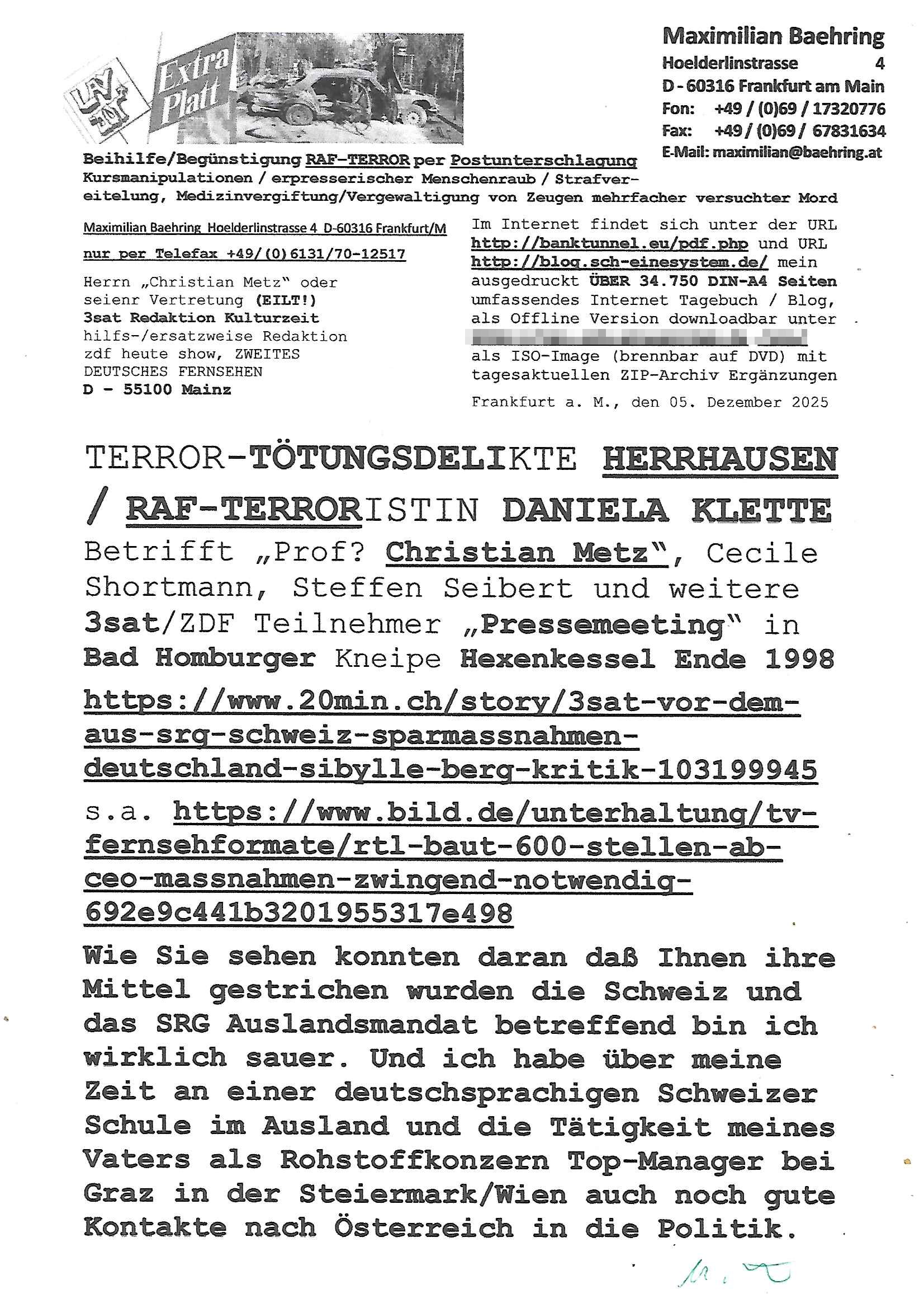 ist doch bestimmt ein Künstler- und kein richtiger Name, Thiel Kollege von Prof. Börne im ARD Tatort Krimi)! Ich habe Sie eben in „Hallo Deutschland“ gesehen im per DVB-S Astra-Sat 11362/H/21999 ohne dafür GEZ-Zwansgabo-Gebühren zu bezahlen auf meinem West-„Russen Receiver“ (der lineares youtube-fernsehen nur ohne mit Internet per Musk-Starlink mit teurel inklusivprepaiddatenvolumen nachkadekarten artig) den ZDF Live-Stream auf meinen alten Röhrenfrensher (anstatt Thin-Film- Transistor-Display: der Tonqualität wegen?) beamt. Da haben sie am 02. Dezember 2025 zwischen 05:00 Uhr und 05:30 Uhr einen Einsatz gehabt der wie üblich beider deutschen Polizei mal wieder voll danebenging, mit einem Typen auf den Gleisen. Kleiner Tipp: Im Modellbau gibt es Sensoren für Personenerfassung und im „auto motor sport TV“ oder so (läzft seit 30 jahren auf vox, ich glaub „Grips mit Autodoktoren“) wurden Bremsassistenz-systeme für Weihnachtsmarkt-Amok-fahrer Modell „Panzersperren für den Platz des himmlischen Friedens“ getestet mit deren Nachrüstung man sowas hätte möglicherweise verhindern können. Ich hatte hier ein paar Meter von der EZB (Europäuschen Zentral Bank) in Frankfurt a.M. entfernt mal ein Frau die mit ihrem Fahrrad vor die Straßenbahn geriet und verunfallte und hab prima Gaffer Fotos schießen und in meinem Online-Tagebuch/[Video-]Blog http://banktunnel.us/pdf.php oder http://blog.sch-einesystem.de und für diejenigeb die bewegtbilder präferieren http://tiktok-maximilian.baehring.at , per SSL/https für geräte die kein http beherrschen auch abrufbar unter der Adresse https://www.zentral-bank.eu/tumblr.com/ veröffentlichen können. Ich hab mal mir Prof. Christian Metz (wie der TV-Geräte Hersteller) von 3sat/ZDF in Mainz, Redaktion Kulturzeit zusammen in der Schülerzeitung der Humbodtschule Bad Homburg zu der wir beide gingen an der Recherche zur Sprengung der gepanzerten S-Klasse lang Limousine des angelch von RAF Terroristen ermordeten Deutsche Bankvorstands Herrhausen im Seedammweg gearbeitet. Der ehemalige Kollege Metz arbeitet laut Sender.an der RWTH Aachen, FÄLLT DOCH IN IHRE ÖRTLCIHE ZUSTÄNDIGKEIT, oder? Ich werde aktuell mit entführtem Kind (tabe lara Riek *19.09.2000) bedroht im Verfahren gegen Terroristin „Daniela Klette“ am OLG Celle nicht auszusagen, mien Post wird abgefangen und die amerkaner hören mit Gerichts-beschluss nach einer Hausdurchsuchung hier mein Telefon ab. Der Gerichtbeschluss findet sich eingescannt bei den tausnden Seiten Prozess-Akten im Blog. Ich hab mich damals auch mit dem Thema „Generalprävention“ per dem was wir heute „social media“ nennen beshcäftigt, beginnd mit „nZSI RAUS grafttis auf OSTPREUSSEN Alteigentum“ meine mich zu erinnern mal mit „Dr. Benecke“ dem Forensiker und Kölner OB Kabdidat der Spaßpartei „die Parte“ des Satiremagazins Titanic unterhalten zuhaben dazu.daß man Straftaten wie „vor den Zug werfen Suizide“ besser im Vorfeld verhindert als sie geschehen zu lassen. Dazu wollte ich Tagebücher und Nachlässe per journalistischer Recherche auswerten, es gibt beispiels-weise Bücher die „Kamikaze Träume“ / „Gedichte die einer schreib bevor er aus dem Hochhaus-fenster sprang“ heißen von „Charles Bukowksi“, bekannt für seine „James Joyce/RTL2 hartes Deutschland“ scripetd reality artigen Obdachslosen-/Trinkerromane Vorlgan für Hollywood Verfilmugen wie „leaving Las Vegas“. mit “Nicholas Cage“ wo es um die Frage geht warum sich jedes jahr zigtausnde Männer bewusst zu Tode trinken oder in [sic!] Züge laufen, Ich hab aktuell knapp 34.750 Seiten (as PDF Dateien downloadbares) Material zusammen-getragen – ALLES ECHT – KEINE ÜBUNG - die ganz dringend beweisgsichert werden müssen da man meine Leitungen/Server per Hackerattacken (auch aufs Stromnetz hier an dem Sreverhägen) lahmzulegen versucht, ich nicht weiß wie lange ich das noch am Laufen halte kann. | |