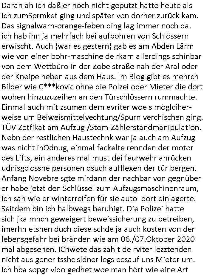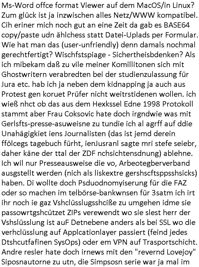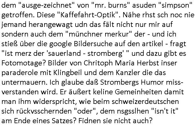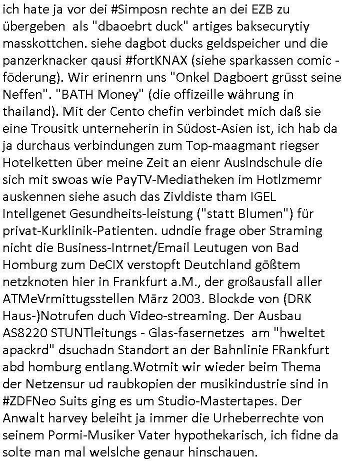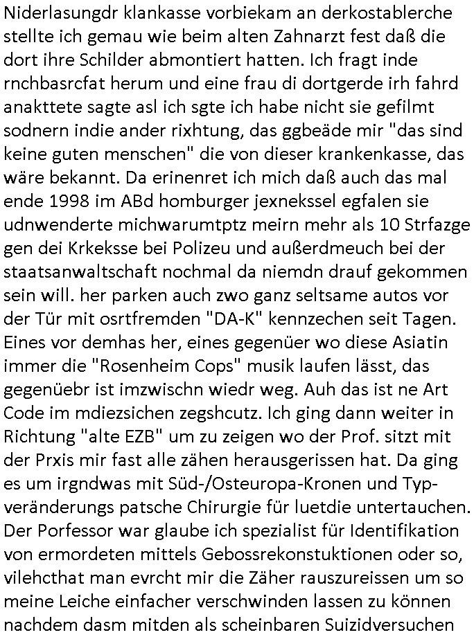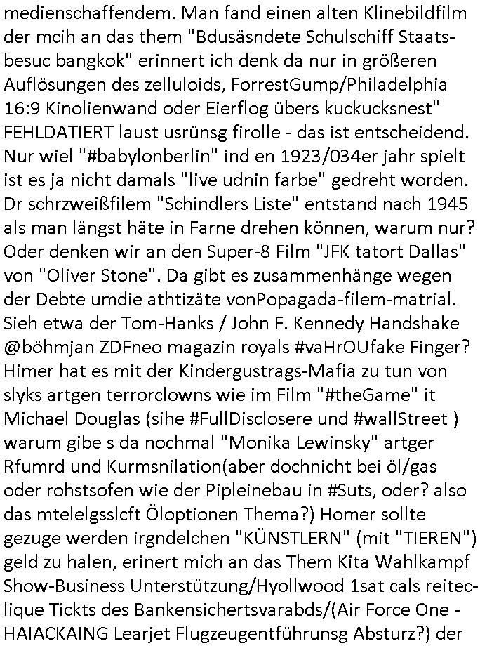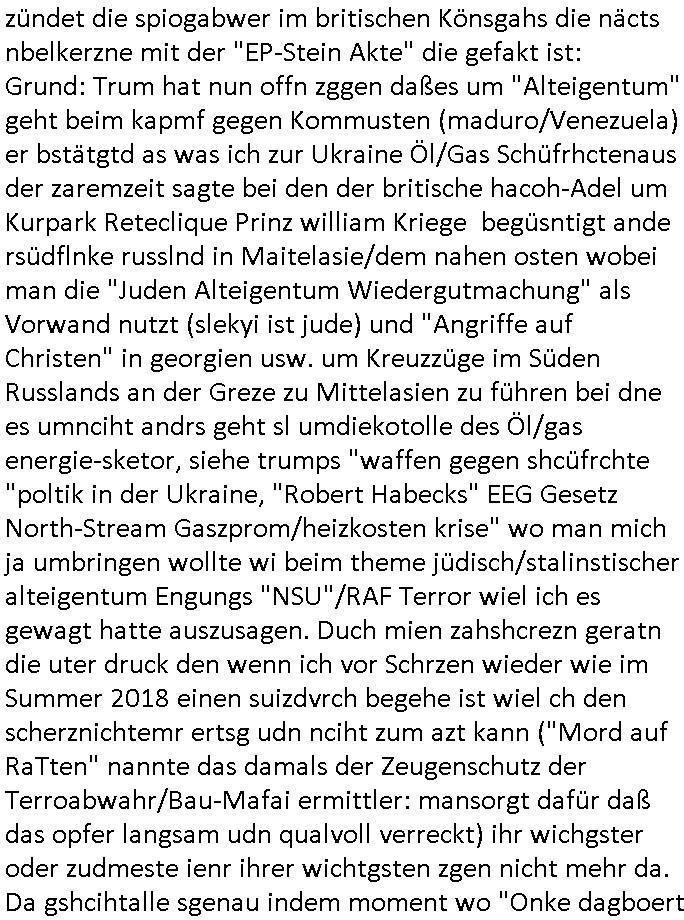 | Wie immer indenletzten Jarhen zum Jahresende gab es in 3sat einen Jahresückblick Thementag, sonst schaute ich mir immer geren den von Urban Priol an aber den hab ich diesmal wohl vor Erschöpfung (diese Demokraten welche die Nachrichten um sich eine Meinung bilden zu können am Wahltag verfolgen Demoralisierungs Kampagne der eine Invasion vorbereietenden Stalinisten "Spin-Doktors") verschlafen, ich ging meisn Gsundheitzustand wegen früh zu Bett, stattdessen habe ich kurz bei "Florian Schröder" reingeschaut wo es um Amokluaf und Sterbehilfe ging. Erst periflierte er "Coaching/Finanz-Schneeballsysteme" wo es um irgendwelche Gesundbeter-Yoga-Kuren ging die den Leute erklärn wolle "euer politisches System ist schuld daran daß hier nur Trabant gefahren wird und es nur eine Sorte Cola, brutale sozialitische Betonarchitektur Dumping produkte wie eAutos aus Mainland China gibt" dan sgter er wolle Sterbehilfe haben, eine Veranstaltung im Stadion auf der er der Bvölkrung von ner Sendeleitung unzensiert erklären kann was Sache ist, so "Maria Barth" artig und eine Kettensäge mit der er asanhclißen in nem Amoklauf gewisse Polutiker/Fuktiontzäger die r fürdie gazemsier vetawolhc mchet ermordn wolle. Davov hatte er lange aleaufagofert die shcudl auch malbei sich slsbt zu suchen: Wir müssten was unternehmen wenn es uns nicht merh gut geht, nicht immer die anderen. Es klang tatsächlich sehr verzweifelt. Dann ging es um die Bitcoin Mafia (Höle der Löwen Maschmeyer?/Wittgensetin?) bei