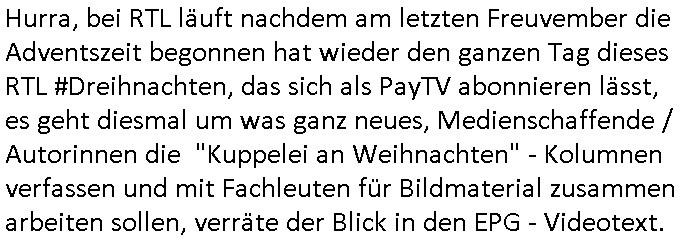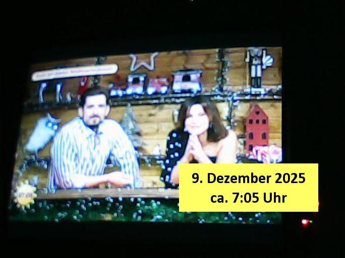 Um mich auf die neue Zeit umzugewöhen hab ich dann schon-mal umgeschaltet auf diesen Programmplatz wo früher das drite Programm vom BR in SD gesendet wurde Volksmusik und sowas.Dort bewirbt Freddy Quinn gerde in einer 0800er Cal-in-Show seine Weihnachtalbum - CDs (Wie bekomme ich die in meinen MP3 player USB-Port?) Wow,die dkenanalsesman kan sogar die passende Stereo Anlage zu dendtaräger mit dazukaufen fehlt nur noch ein Steramingtarif mit bewachtem Ökstrom-Rechenzentrum! Für den Fall das unsere Stasi auf piratebay/eMule meine Playlist mit Protestmusik mit subsvrsiven Texten abhört. Was nützt einem der beste (Modell #Lockerbie) Ghetto Balster wenns nirgendwo mehr Batterien zu kaufen gibt? Anyway: ich fin des ziemlch subtil den füheren Sendeplatz vom BR einen kommerzeilen volksmusik Sender zu geben. https://www.tvinfo.de/fernsehprogramm/2256733483-christoph-sieber-weitermachen https://www.tvinfo.de/fernsehprogramm/2281037465-mtv-in-the-mix http://www.digitalfernsehen.de/news/empfang/satellit/nach-sd-abschaltung-nachfolger-fuer-astra-sendeplatz-des-br-steht-fest-1132452/ https://www.volksmusik.tv/juli-empfang/ | |