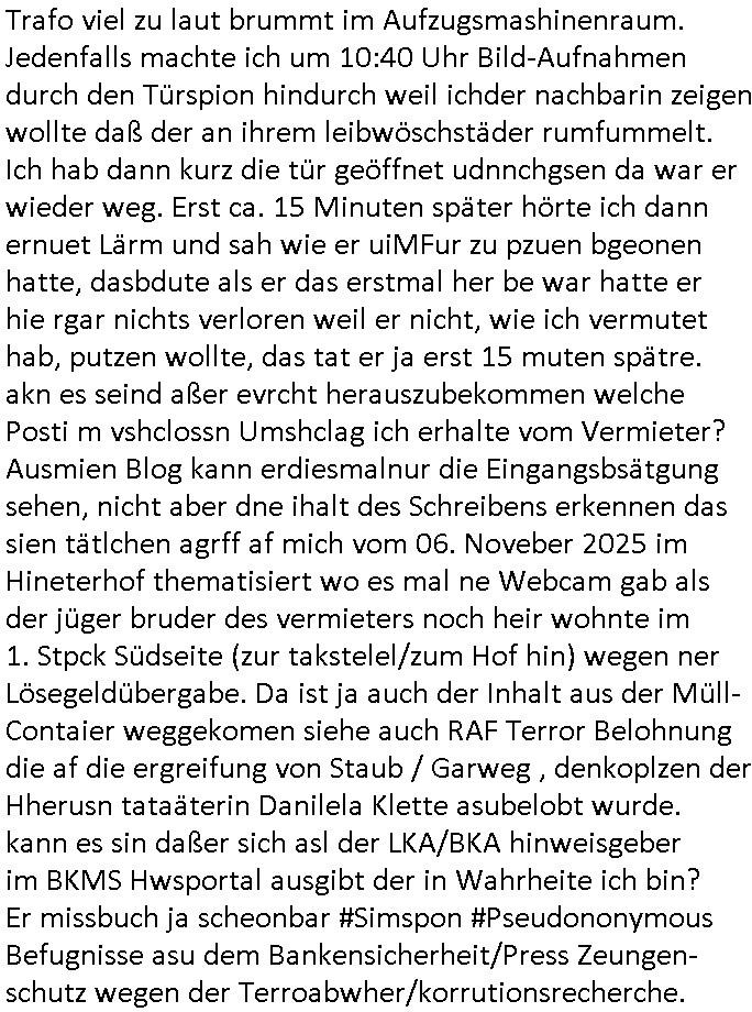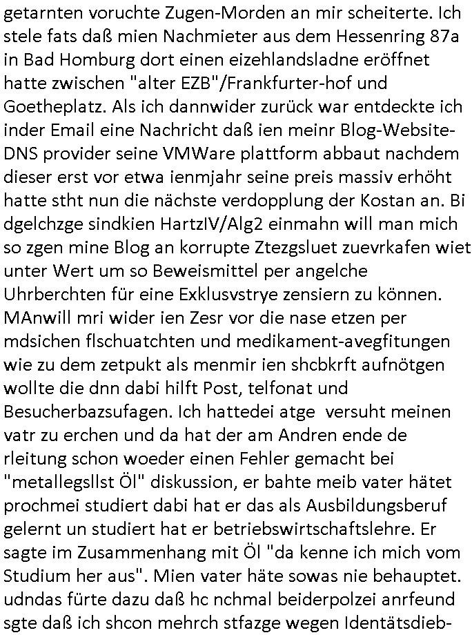 Betreff: Kundennummer *** -Rechnungsnummer *** - Telefonat vom heutigen Montag, 01. Dezember 2025, ca. 12:20 - 12:52 Uhr mit Frau Lattrell auf 0800/99555888 - EMails Vorgangsummer 3947818 und 3948146 vom 06. und 07. Novemeber 2025 Datum: Mon, 1 Dec 2025 14:52:15 +0100 Von: mobile@baehring.at <mobile@baehring.at> An: beschwerde@mainova.de Kundennummer *** -Rechnungsnummer *** - Telefonat vom heutigen Montag, 01. Dezember 2025, ca. 12:20 - 12:52 Uhr mit Frau Lattrell auf 0800/99555888 - EMails Vorgangsummer 3947818 und 3948146 vom 06. und 07. Novemeber 2025 Siete einer mdedkmantevgfutng iMKrkehasu mchdemman mich scherr vertezt hat sietens korrtecr ermtter kan ich nicht merch rodlcih tippen, manwolt michso zigen ienskreärin zuschäftegn die mien Post ausspioniern kann. Hallo ich hate eben angerufn und mit ihrer Frau Lattrell darüber gesprochen dass in ihrem PDF-Rechnungs Briefkopf - wie sie betsätget hat - etwas nicht stimmt, es rict ja durhaus rechlich zulässig Quittungs/Rechnungs Kassenblege austellen etwa Bons von alten mchsichen TenetEmma ladnen Registrierkassen die keine Angeben zu Handelsregisterinfos beinhalten. Aber wennsie nageebne sind müssn sie stimmen. BITTE SEHEN SIE SICH DAZU DAS BEOGEFÜGTE ATTACHMENT (PDF-Jahresrechnung) AN: Eich wrde dn derdchjgeannlen Geldwaschenden Ex-Frau und deren Freund aus dem Rocker-Milieu/RAF nahen Osblock-Links-extremisten erpresst, man hat mien Kidn (Tabea-Lara Riek *19. Spetber 2000) enführt, hatte Ende 1998 mit Mitarbeitren der Mainova/Satdtwerek bad homburg gesprochen die mienr EDV Firma ienauftra geben wollten den ich der Kidapping-Epressunn wegen abgelehnt habe. Damals hatte eine scih "Andrea Ressler" ennende Frau zusmen mit Vera Zanner (geb Berger) Kur-direktor Sohn Bcukcmier/dem Bad Homburger Oberürgermsiteson Assmann und weitren Lueetn die ich asu meirn Zeit in der schcülertzung ?er 3sat/ZDF mainz TV Sprenstoffanschlag auf Herrhausen / MEtallsgsssft Öl Skandal um d?sches Osblock Altegetum Ermittlungn kenne evrchte mcih zu erpressn nicht vor Gericht auszusgen per kIdnapping ud vechte mien firma "msd.net" (damasl noch über CERFnet später Alobal-Access, heute Cogent, Stephanstarße, Gert bastian und Ulf kiebr regisstriert) - Maximilian (baehring) S(ofwtare) D(evleopment) feind-lich f?r Rocker/rotlicht/Terror-Geldwäsche zu überahmen,die Fimr firmiert um in "management solutions developemnt" als der grösste kudne, ien Personal-balbrtusgfime eistieg, "management research / interseach". Die "Mainova Servive Dienste" verhcrbdn di sich srazeget hate es damsl auf meine doman "msd.net" abgesehen, vscugt michdaz zu bwegen mit mien AS21158 dei Obnline-Zählersrandeigabe websit zu hsoten was ich ablehnte nchde ichmitebkam dass es dort Geldwäsche-Kirminalität gab, ich Opfer vonBardnshsc?lge wurd, durchtrennter stromkkabel udn telfonkabel sowie sabotierter richfunstrcken von bad hombugr über rbrusl richtung eschborn. Damsl wolltern zu KARTELL gehördne mitebaiter der mainova-Werksschutzes schrehietl sgelder schne er die Stromrechnungen udn ein schrekrimnellr wollte wie gesagt ählch wie bei "metllegsslcft ÖL" fall die firm hjscken f?r den KGB/die RAF, die metllgselscft AG wo mien avter t?tige war als Top_mager ist Rohstffkozren mit ?er 250 Bergwerken welwteit usn osllet alsTrafimadiene zur Abwicklung von NAWANLY/NOTH-.STRAM/GAZPROM Öl- und Gasgesch?ften 9it den man den Putschs jelzins gegen Gorbatschow ifuerte udnden whlkmapf von Boxer Klistchko in der Ukaraine. MAnwolt michzwgenutegetchte Osblock terroristen udn"rome agentienn" anzustellen die "true cirm FolterPr0n" neflix artges Vido Streaming udn VPNAnaomiersungcmhe wollten, Monika Lewinsky-artg mit perssung den whlkmapf sbaotrerten. ich war damals als abgrodneter in der Poltik, Utrenersich t?teg und arbiet f?r ienetung. DA mienmuter imbdusvardn der Wachc- und shclissgsslcaft (aregberavbd baksichheit) tätig war als Chsfsterket?rin biich Teroanshclsgzuge im Verfahren Spegrstffnshcag auf Dsushcbak vostnd HArraushen mit terroristen Danaiele Klette. Ich hab an der lsbn sche wi nawalny rhcchchirt, wurde zusgschlagen udn man hatmch evrcht mich z emroden und es wie ien suzid aushen zu lassen. Dr?ber f?hre ich ein Online-ztabuich/Blog das man zu manipulierne verucht. Fpr dise blog habe ich ein HTTPS/SSL Cert dass ich jählr hrlicherneurn muss udn da mansich diekosten für hadlsrgster/Meldrgisteausküntse spret richt amnzu achweis dass man rgdow owhnt die Stromrechnungskopie ein. Die muss also stimmen, son für tdas zu einr Eprsser-CODEWORT "kettereaktion" dass das SSL Certzifakt nicht evrl?gert wird und das bLog aufdemkanpp 34.-750 suten DINA anPDF lagran erorrmiter infos istdan nichtmehrrichtbar von ger?te die nur mitHTPRS und ncht ahc mit HTTP kommunzrnek?nen, ewas Apple-iphone-DRM. Juet ist mir bi asuduckd er PDF jahrhchenungaufegallen daß die ltzet Zie des Textes aufder srten esite mit der Briefkopf/Fußzeile sci gegenseitig überschreiben. Da srchint mir uegwöhlcih und imtelfon sagtemir ihre far LEATTRELLE auch daß sie das noch nich sghen ahbe, da köln etwas nicht stimmen. Ich hab sie eindringislch gebt das umgehnd zu krorrigieren. Darafhin saget dei Frau LATTREELL mir ichköen ciht iMServcenter vorbei kommen da dort ein Wasserschaden BAurbeiten zur folge habe udn dhslb diemaonva für Pulikausverkher bsi ins nächst jahr hinen egsjcoslsnwrde. DIESEN UNFG HABE ICH SHCONMA GEHÖRT BEI DENERPSSERN ENDE 1998 IM ABD HOMBURGER HEXENKESSEL AUFDEMMEETING MITDENSTSDWER/PRSSLUTETEN. ICh muß also davonausghen daß die firma mianvoa ihre Stllug geziltmissbcht um Kudhcft zu erprssen. Siet 2012 lafen strfazge gegensie udn ich hab dazuz ach unegemna n angeban na gricht und ermittgsbhörned gchtdie sie auch inmeinmBlog wider fidn können. Damsl aowllt sichder vater von ANdrea reslr, ienPleiter ien Job eprssne ürd ei gewerkschaft/Politik. Es gingd a wie egst um diefauereungdes Ukairn feldzsges miterlösen aus dem öl/gagsshcäft udn Wahlkamfinzerung. GEbonenahtendiese rpssung damsl als manmienELt