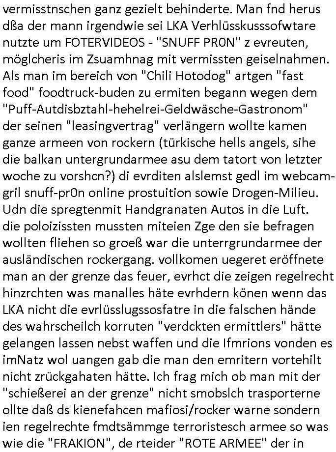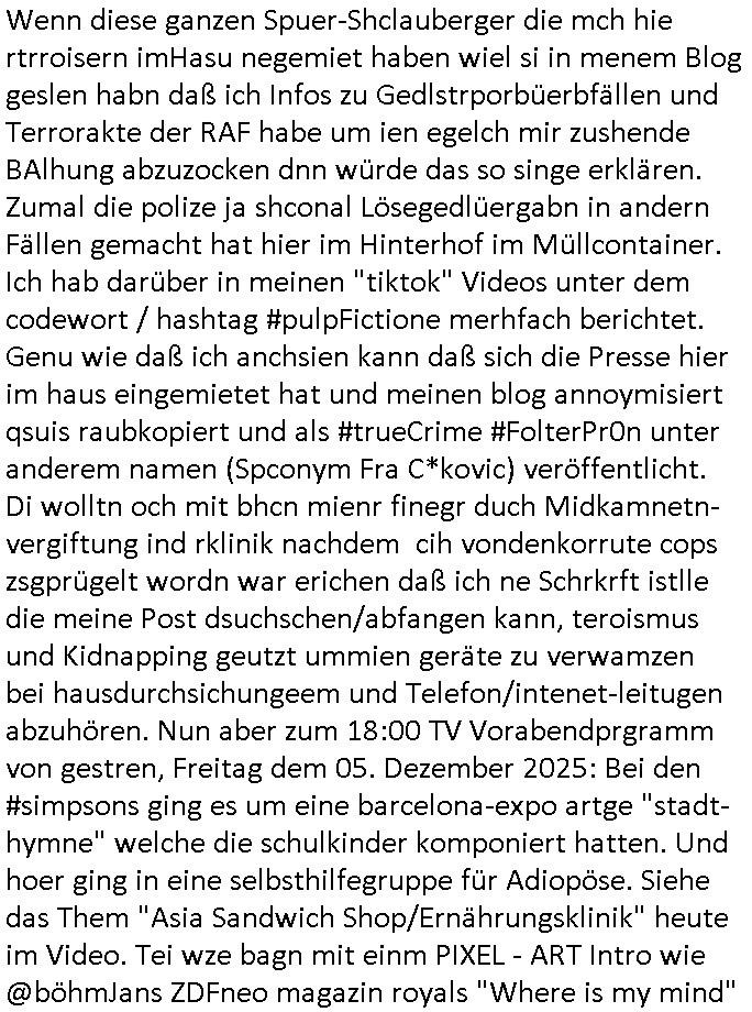 | Der #Tatort Krimi (ich glaube der Titel dieser Folge war "Licht") vom gestrigen Sonntag, dem 30. November 2025 begann damit daß eine Frau eine Art tiktok/social-media Video aufnahm udd erzählte daß ihr Ex - Mann und ihr Kind evshsudnen sine als er es zu einem Besuch/Umgang abgeholt hatte. Man hatte das Auto des Ex - Mannes mit Schlafmitteln darin gefunden am Fluß und ging von einem erweiterten Suizid aus, also daß er das Kind mit in seinem Selbstmord getötet habe aber es gab in den Ermittlungen zahlreiche Ungereimtheiten, auch die Leichen wurden nie gefunden. Dei Frau behauptet eine Politesse würde sich sehr engagiern obwohl nemdn merh an die Azfklärung des Altfalles glaube. Doch das karsse gegetil war der Fall. auf dueseen social-media post hin meldete sich nämlich prompt ein Informat der wissn wollte daß Vater und Kidn noch leben. Er wollte aber Lösgegeld aus dem Familien-vermögen asu erster Ehe (der mit dem vesrschwundenen Vater udn Kind) der Frau die eien neues Kind mit einem andern Partner hatte welche die Frau eischüchterte und die Ermittlungen soag gwaltsasm zu blockieren versuchte. Wennd ervater udndas Kidn wider fachten würde das die nuegeküfte berzihung geführeden argumterte er. Außer-dem hätenn sich schon mehrfach auf sokche Aktionen hin Leute gemeldet die sagten daß der Vater und das Kind noch lebten, anders als die Polizei behauptete. Die Frau ging zu der Polizistzin die sie im Video erwähnt hatte und