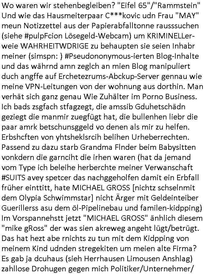 | Ich bin ben um 05:30 Uhr (ich bin siet kurz vor 04:00 Uhr wach) duch sn Screnhsot uetbrochen worden. jedenfalls: Denunziation/Kidpping führte zu Jobverlust/Invalidität. Wobei diese seltsam Sckte es scheinbar auf das Geld des Ex-mannes udn kindesvaters abgesehen hatte genu wie der neue Ehe-mann. Man nutzte quis die not des Kindes-vatrs der umsien Umags-/sorgecht kämpfen musste von allen Seiten her shcmalos aus, acuh von Kollgen welche die Gelegenhiet nutzen daß er im Umgangs-/Sorge-rechtsverfahen denunzieert wurde und von der Mutter mit deren Schdungs-Beute-"Kind" erpsst um an seiner stelle karreire zu machen an ihm vorbei anstatt ihm ion sienr Notsiuation zu helfen. Die Kudesmuterwar mit gezogener waffe inien kidergebusrtag gestürmt nachdem sie eien Tipp von der obdhsclosn frau aus dem Abbruch-haus woder ifmrent getöte wurd ruchterpsuzr erhalten hatte. Man hatte irh gesaht daß das kind möglcherise auf dieser Feier sei. ich entsinne mich nicht richtig ob das richtg war vom tipp her aber es brachte - wohl auch weil es öffentlichkeitswirkug erzeilte - bewegung in die Sache. Übehuat fehte mir im Film die Info isnwiet die gut dortert Josb etwas mit "scoauil-amda / streaming" zu tun hatten, aslo dei jobs umdie der kdiesvatre gebrcht wurde vonsien koleg mit de rneführung. obdi de sienld abschlich ver-filmten um so ine art "TREU CRIEM FOLTER Pr0N" netflix Gassfasermfasi abos verkaufen zu können, als Exklisvtsry! Daß seine intriganten Kollege nur deshalb gutdotierte