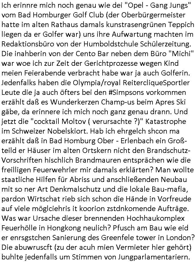 | Ich erinnre mich noch genau wie dei "Opel - Gang Jungs" vom Bad Homburger Golf Club (der Oberbürgermeister hatte im alten Rathaus damals kunstrasengrünen Teppich liegen da er Golfer war) uns ihre Aufwartung machten im Redaktionsbüro von der Humboldstchule Schülerzeitung. Die inahberin von der Cento Bar neben dem Büro "Michi" war woe ich zur Zeit der Gerichtprozesse wegen Kind meien Feierabende verbracht habe war ja auch Golferin. Jedenfalks haben die Olympia/royal ReitercliqueSportler Leute die ja auch öfters bei den #Simpsons vorkommen erzählt daß es Wunderkerzen Champ-us beim Apres Ski gäbe, da erinnere ich mich noch ganz genau drann. Und jetzt die "cocktail Moltov ( verursachte ?)" Katastrophe im Schweizer Nobelskiort. Hab ich ehrgelch shcon ma erzählt daß in Bad Homburg Ober - Erlenbach ein Groß- teild er Häuser im alten Ortskern nicht den Brandschutz- Vorschriften hischlich Brandmauren entsprächen wie die freilligen Feuerwehrler mir damals erklärten? Man wollte staatliche Hilfen für Abriss und anschließenden Neubau mit so ner Art Denkmalschutz und die lokale Bau-mafia, pardon Wirtschat rieb sich schon die Hände in Vorfreude auf viele möglciehris it koorion zstdnkomende Aufträge. Was war Ursache dieser brennenden Hochhaukomplex Feuerhölle in Hongkong neulich? Pfusch am Bau wie eid er enrsgstchen Sanierung des Greenfele tower in London?Die abuwruscft (zu der acuh mien Vermieter hier gehört) buhlte jedenfalls um Stimmen von Jungparlamentariern.