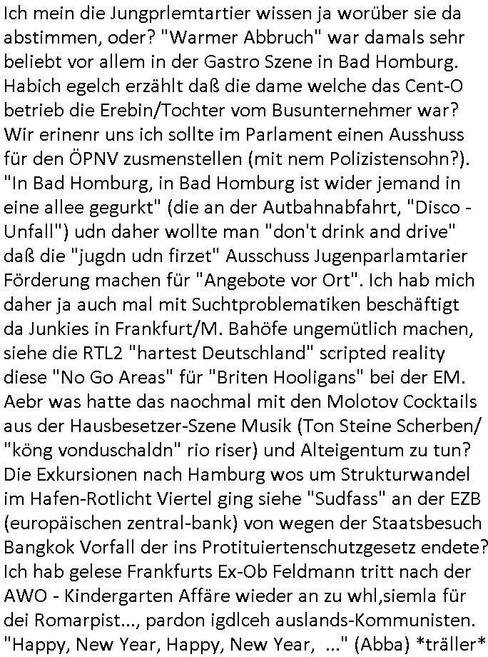 Ich mein die Jungprlemtartier wissen ja worüber sie da abstimmen, oder? "Warmer Abbruch" war damals sehr beliebt vor allem in der Gastro Szene in Bad Homburg. Habich egelch erzählt daß die dame welche das Cent-O betrieb die Erebin/Tochter vom Busunternehmer war? Wir erinenr uns ich sollte im Parlament einen Ausshuss für den ÖPNV zusmenstellen (mit nem Polizistensohn?). "In Bad Homburg, in Bad Homburg ist wider jemand in eine allee gegurkt" (die an der Autbahnabfahrt, "Disco - Unfall") udn daher wollte man "don't drink and drive" daß die "jugdn udn firzet" Ausschuss Jugenparlamtarier Förderung machen für "Angebote vor Ort". Ich hab mich daher ja auch mal mit Suchtproblematiken beschäftigt da Junkies in Frankfurt/M. Bahöfe ungemütlich machen, siehe die RTL2 "hartest Deutschland" scripted reality diese "No Go Areas" für "Briten Hooligans" bei der EM. Aebr was hatte das naochmal mit den Molotov Cocktails aus der Hausbesetzer-Szene Musik (Ton Steine Scherben/ "köng vonduschaldn" rio riser) und Alteigentum zu tun? Die Exkursionen nach Hamburg wos um Strukturwandel im Hafen-Rotlicht Viertel ging siehe "Sudfass" an der EZB (europäischen zentral-bank) von wegen der Staatsbesuch Bangkok Vorfall der ins Protituiertenschutzgesetz endete? Ich hab gelese Frankfurts Ex-Ob Feldmann tritt nach der AWO - Kindergarten Affäre wieder an zu whl,siemla für dei Romarpist..., pardon igdlceh auslands-Kommunisten. "Happy, New Year, Happy, New Year, ..." (Abba) *träller* https://www.bild.de/news/ausland/ermittler-ueberzeugt-feuerfontaene-loeste-das-schweiz-inferno-aus-6957d7ba392c7b91b7cd28d9 https://www.fr.de/frankfurt/zurueck-frankfurter-ex-ob-peter-feldmann-will-in-die-politik-94095189.html | |