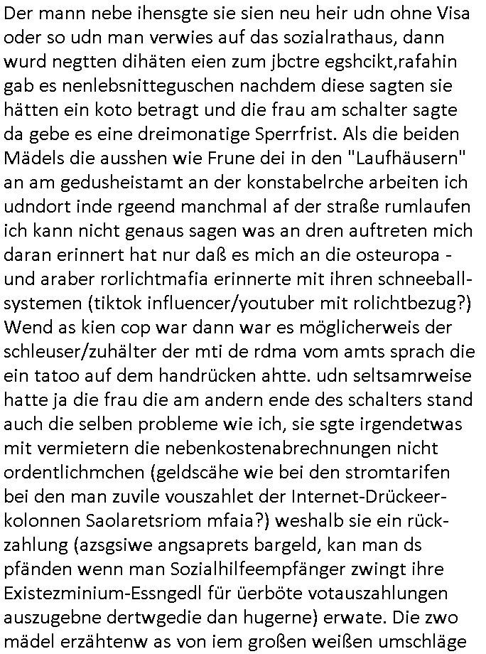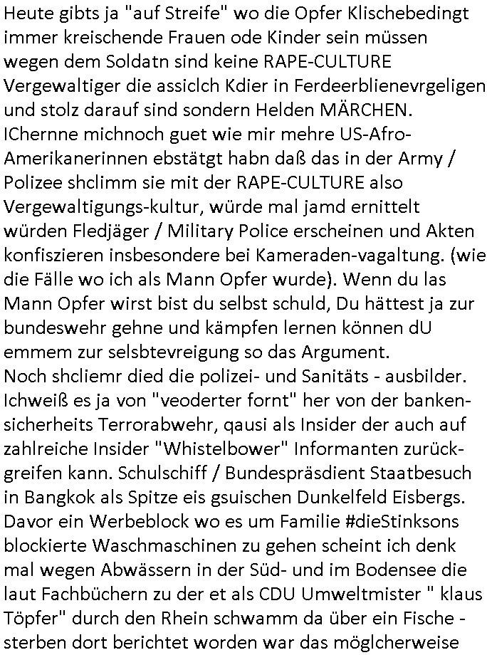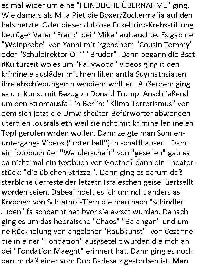 | Als ich gestern zwischen ca. 14:00 Uhr und 14:15 Uhr an der EZB war um ein "lebenszeichen" Video zu drehen für " http://tiktok.maximilian.baehring.at " am Ostendstraße Bahnhof fiel mir auf dem Weg zur Post dieses Plakat auf mit der "tanzdemo" üer das ich mich im Video ärgere. Es wird nälch so gatn als wären Vergwaltigung Kidpping usw. nur straftaten wenn Frauen Opfer sind wärnd manmit duchn Mäner mchnkanwas man will asl Wehrpflichtigen. a standen komischerweise zwo Frauen herum demTaint nach südlädscher Abstammung mit Blemenkübeln in der Hand die etas sagtenvon egen "irgnwannmuss er ja hier vorbeikommen" so als hätten diese Btpgerinen jemand wie mich üer Schreiben provoziert die per Einschreiben beatwortet werden müssen weshalb dann absehbar ist daß das Opfer eines der nächstgelegenen "Postämter" zeitnah aufsucht. Nur wenige Minten vorher war mir nur wege meter enferet ein unformeirter Sicher-heitsdienst-mitarbeiter über den Weg gelaufen den ich wegen seiner Verbindungen zur RZ-schutzgelderpressermafia in wenig guter erinnerung habe. Als ich eben um ca. 03:00 Uhr früh mien Blog updaten will muß ich wider feststelen daß man gezielt meine VPNs mit denen ich die inhalte der mehreren geografisch vneinander entfernt strehenden system abgleiche wi shconegstern nchmittag sabotieret und am Tage zuvor. Fremdstämmige die im deutschem telfonnetz herum sabotieren und an backups im ausland