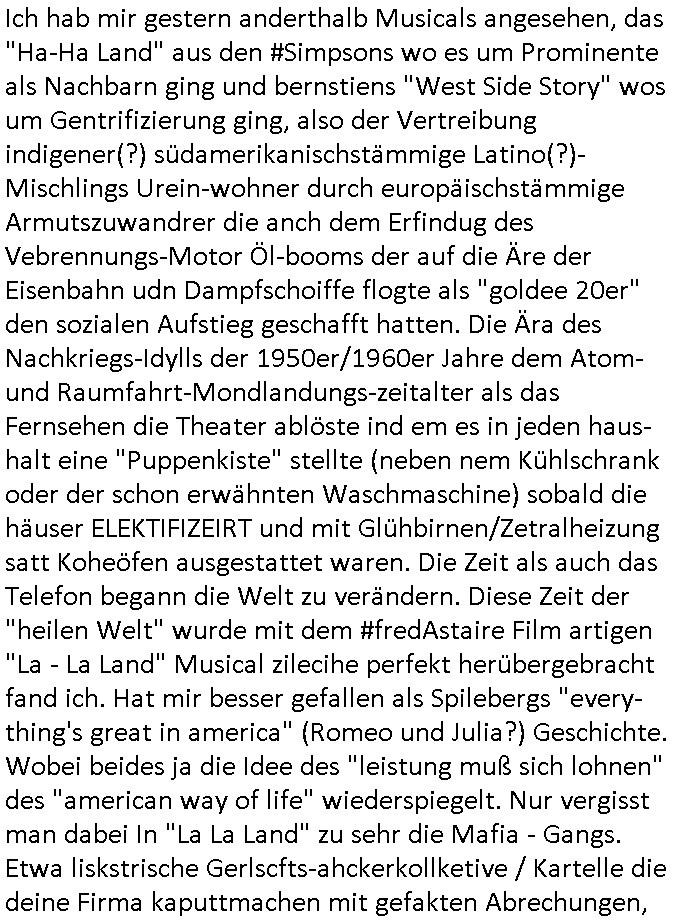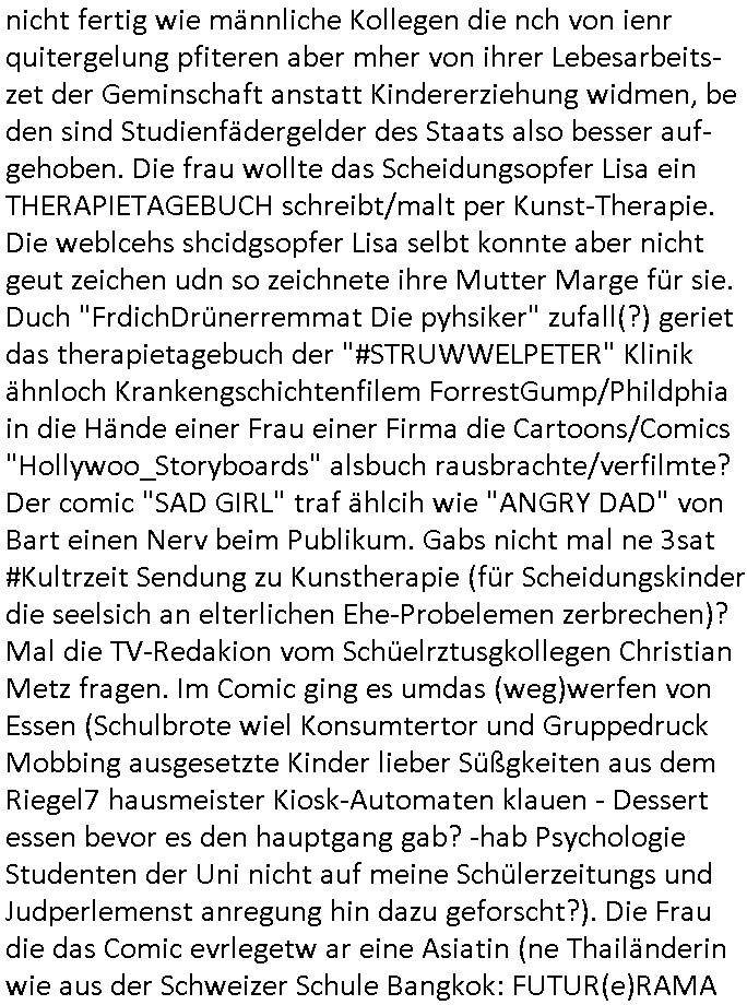 Wen man sieht wie särge in Frachträume galden werden am flughafen, vielleocht erinert sich noch jamdn an die diesbezüglichen Bemerkungen von mir auf dem presse-meeting im Shcüerztusgüro tewa zur Zeit des Mauerfalls. Diese "Musical HAIR" Filmszene "LET THE SUN SHINE IN" auf dem Flughafen. Wir hatten darüber geredet wegen dieser "GOOD MORNING STARSHINE" Kriegs-Reporter. Als wird die "A10 - Thunderbolt" Panzerknacker Fotos und die von der Verladung von "Atomwaffen-träger-systemen" bekommen sollten die abgefangen wurden. (Nicht abspielbare MP3 Datei auf nem iPod-Walkman). Wo es darum ging daß es kein deutschen Tornados sind die Belgrad bombardiert haben sondern wenn britische. In etwa zu der Zeit als #realityBites entstanden ist und #wagTheDog. (Da hatte ich mal irgndwas mit so einer vampyre records firma am Frankfirter hauptbanhof zu tun neben der AIDS-Hilfe, ggebüer ist ein Rockertreff). "Petsi Hohls" der "Booker" des "Gambrinus Musiklokal" (wo "Andrea Ressler" mal gearbeitet hat bevor sei den Hexenkessel amchte) am bad Homburger Fürstbahnhof hatte damals swot sich entsinne mit dem Bruder von Schülerzeitung "Monstermüsli" Autorin "Biggi" Braun irgendne Plattenfirma. Die wollten wie bei Grönemeyer musikvideos auf CD pressen zu einer zet wo noch nicht sicher war welcher Codec-Sandrad/MP4 sich duchsetzt. Damals waren Mutimedia Mixe-mdoe CD Bewegtsvideos rechenleistung ohne spezielle beschleunigerhardware bedingt 320 x 200 noch etwa Breifmarkenformat groß. Udn ikch riet dazu sowas wie youtube casting-shows zur nchschsfpderung aufzumahcn damals in der Redaktion. Die Debatte drehte sich um DRM - Endgeräte / Zensur und um Fan-Intermeforen-Communities. Nur weil wir das Thema "Rchenzentrum Bewchung" streiften. (Wenn man das Sat1 füshtsücskTV beim IP-geoblocking JOYN abfilmt per Webcam vom Schirm und die Moderatorin UNVERSCHLEIERT im IRANischen scoial Media Internet auftaucht per eMule/Dokey Tauschbörsen-Raubstream. Wir erinnern uns: "THE SUN ALWAYS SHINES ON TV" die "you are watching channel FREE" wie in DREI-sat aber auch in "FREE beer" Morning-Show Musiksendung. der ESCHATOLOGISCHE (WELT.tv) "ICH WAR DABEI BERICHT". ( "Sarah Hazel drink and schmink" / "Blumfeld - reflecting skin" respektive "Kelly Clarksons - since you been gone", und auchdie "online hate oma (80)" ketchup - expertin) Jedenfalls ging es dann noch um den "letzten ausweg: Hausnotruf", marge war eingesperrt, amazon ALEKSA hatte sie gekidnappt bei einem "Koch Duell" so ähnlich wie diese "Weihnachtbäckerei" Sendung mit "Marlene Lufen" "das große Knorr kochstudio backen" oder sowas es gab bei Böhmi "SAlaT von der ISS". Und kaum daß Böhmermann Alein Food gegessen hatte das ging es los daß alles gaz seltam wurde auf der Welt/im Fernsehen. Cooro udnsow. Ob es da einen Zusammenhang gibt? Womit wird dann wider bei den siposn waren wo die letzetn Üeröebdnen dermshchist an bord eines Raum-shcffes zu füh aus irhen Hypesflaf Kapslene erwachten. Und es gab einen Unfall mit diesem Replikator Thermo- Mix - Mikrowellending aufdem rsischff. Die "Cranberry" Gelatine erwachte zum leben und tötete die Menschen etwa wie ein Pilz. (ch kenn ienpaar Jnkies aus einer LSD udn Pilzsiche Scukakaheiten Recherche die lachen sich bestimmt marihuankosumabdinegt schepp bei der Idee daß riesige Killerplize die ganze menschheit auslöschen) . Soviel zu den #simpsons . (gab es da nicht mal ne band nicht die, die "Kirsten Hanser" Horoskop Kritik "humans or ancer", die die pilzknöpfe-frisuren zur mode machte, siehe "morlock motors" transformers-männer-spielzeug. Dann #berlinNueKölln02407 / #berlinTagUndNacht wo es mal wieder ein schul benefiz gab (ist die idee dazu mal wieder bei den #simpsons geklaut)? und mike sich per internet einen neuen job suchte. Dann die 3sat Kultur- zeit es ging um "qui vit encore" Lebenszeichen aus Gaza. Dann ging es um Foschun zu EMPATHIE und Krieg. Und Elias Herschels Buch "Schleifen" wo er in sich daranvschte aus eine Esparatao artge "Universalsprache" heraus eine "missverständnisfreie" histrsche weltsichte zu entwckeln. Dann irgendeine "carmina bruna" aufführung. irgend-welche ortswechsel und tobias pilze - gemälde. ein batrag wie man mit einer "zdfneo #Suits theDonna" artgen KI den Tod besiegen könnte (ich muss gerade an die text- zeile "ich war dabei mir ein art von vershwinden ..." denken aus "ich- wie es wirklch war" von "blumfeld"). Dann Musik aus einem Swiss Campari-Soda Werbespot von Grand Jean. "2 Sided Ario press", Musikvideo. Nach dem Werbeblogk dann wieder #berlinNeukölln02407 / #berlinTagUndNacht woe Chiara ihren Onkle Piet warnt daß Raphi es nur auf sein Geld abgesehen habe bei der Hairat. Er soll 14 tage zur Kur. Raphi hat einen schicken blauen Mantel an, hat ihr piet den geschenkt. Chiara wirkte dagagen eher wie ien Stahkocherin aus dem ruhprott in ihrem Glitzer-Outfit gesteren irgendwie. https://tvinfo.de/fernsehprogramm/2290042400-die-simpsons https://tvinfo.de/fernsehprogramm/2290042409-die-simpsons https://tvinfo.de/fernsehprogramm/2269348005-kulturzeit | |