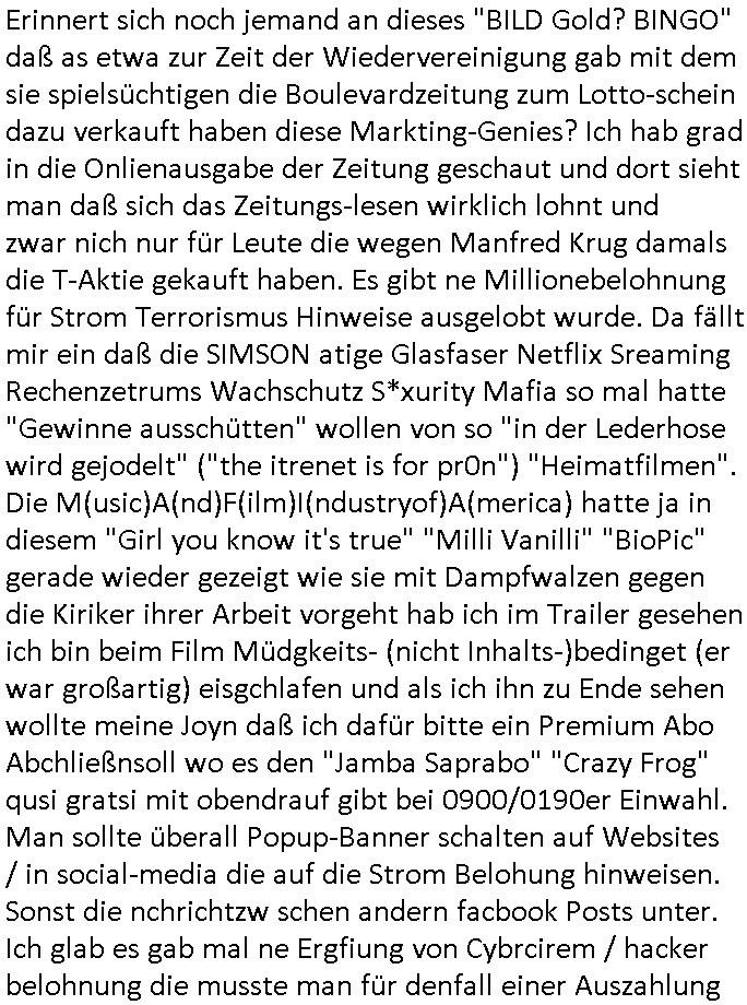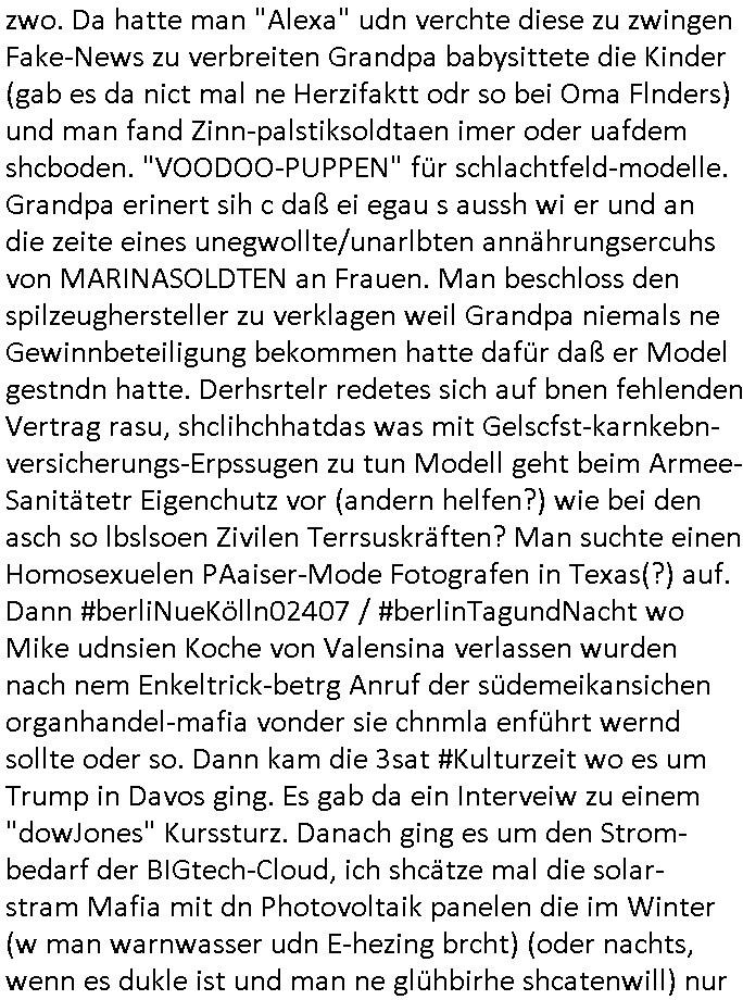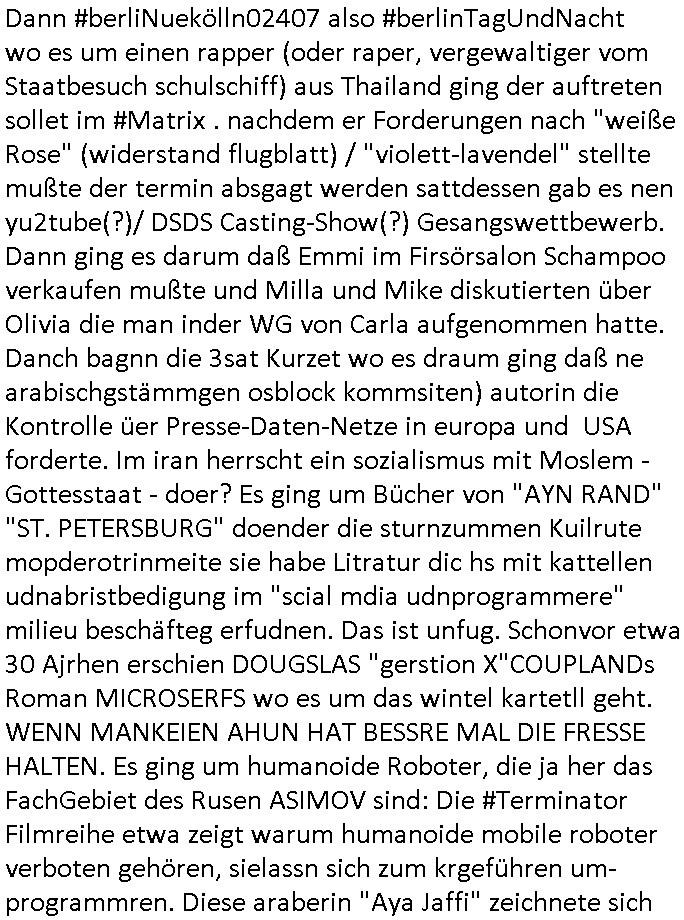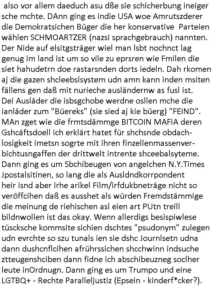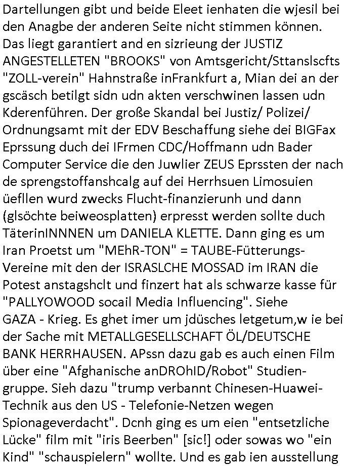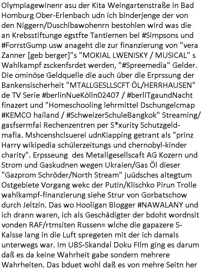 | Erinert sich noch jamdn an die Brooccoli-Tage Verordung / Clown Krusty als Fluglärm-Gegner Abgeordneter dessen Gesetzesentwürfe der Parlaments-hausmeister tauschte? Ob Dr. Mark Benecke in Köln Oberbürgermeister #Quincy "pathologe mit facbookprofil" TV-Serie zum Vorbild hat ? Arbeiten Satiremagazin Titanic "die aprte" Abgeordnete Martin Sonneborn / Sylble Berge nicht beim 2DF in Mainz als "heute-show" Terrorclown bei Böhmermann/Scholz? In den USA wurde ja gerade ein Bürgermeister auf den "as [commodore - logo] ' C = ' strahlt üer uns riesengroß" Koran vereidigt der Kommunist und erst siet kur-zer Zeit im Land ist. Idgwoher müssnedia Aufträge für Mexikaner udlatino armistunder im Baumafia Hautwgereb komnen damit sie nchtabsgchobenwerden. Was kommt wohl als nächstes? Ein Spross des "ALOIS SCHICKLGRUBER" Clans vondem es in den USA noch ebende nachkommen geben soll der seinen VIP Nach-Namen großflächig plakatiert als Wahl- Kandidat ? Robert Harris #Fatherland läßt grüßen. Ichmien wen interessiert schon ob der bestenfalls halb-deutsche Vater unbekannt Nachfahre einer über Miss-brauch von Vor-Gewalt-Ggen-faruen- udn Zuegnschutz-gesetze koksnden Türkin oder Serbin aus dem Miliue die eigentlch lägst hätte ab-gchoben werden solen heir politik vonasmutdererdem asylbetrüerfürarmustzdgedert asyterüerg amcht mit zu unrecht erlangter Satsbürgsrcfat bei ner Wahl per Intrenet (siehe #Putin-Troll Wahlkmapf) Schneeballsystem Geldwäsche Invstoren : Willkommen?