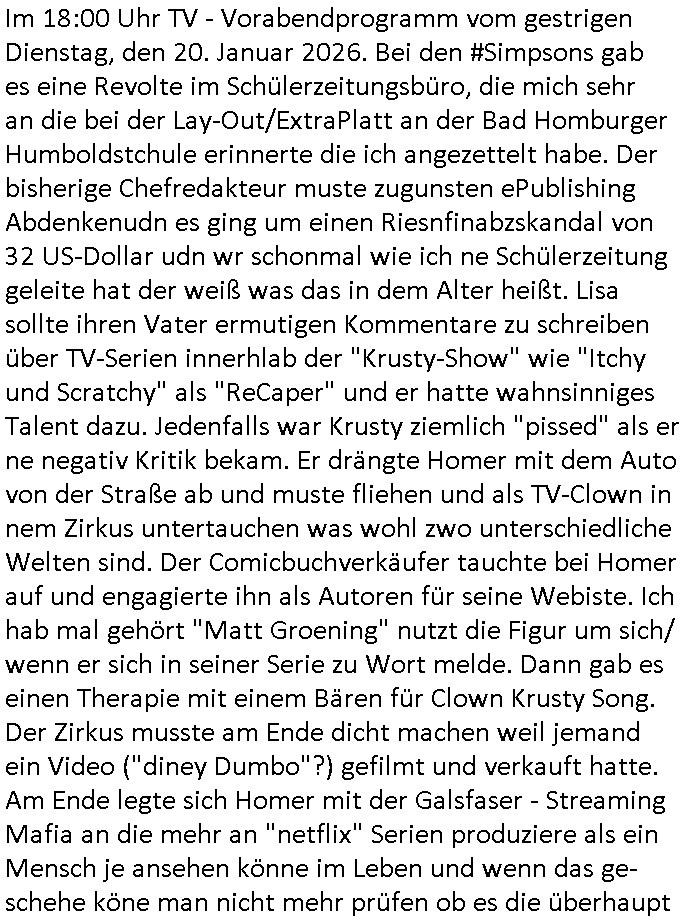 | Nun zum 18:00 Uhr TV - Vorabendprogramm von gestern, Mittwoch dem 28. Januar 2026. Bei den #Simpsons ging es um eine Kollgen Karte für Lenny (lieber über den Berg sein als darunter liegen) auf welcher Burns viel zu groß untersschrieben hatte ohne sich anteulig an den Kosten zu beteiligen. Bunrs shclckte Medikamnte die ihn "sanft" udn "gütig" machten und Smithers fand Hoemr nutze das aus. Als Homer ihn darauf hinwies mußte er zur Strafe die Praktikanten betreuen. Darunter war einer mit einer schwangeren Freundin oder Frau der ihn sehr lobte als seinen Mentor worüber Hoemr sich so geehrt fühlte daß er sich sogar ein neues Klamotten Outfit besorgte. Und Homer machte sich derweil dafür stark daß Burns in dessen Geschäftsidee investiern sollte statt daß jeder ein Stück ner großen Pizza bekommen sollte, die viel zu lange unter einer Wärmelampe liegt, wie bei "Würstl Mütz" am Zoo in Frankfurt am Main wo es eine Wärmelampen Pizzaplatte gab (ich glaub nicht daß die Stücke der Pizza hieß die mit fleisch? damals? "Europa"? dort zu lange liegen, die sind nämlich lecker), sollte jeder ein kleines Stück Pizza bekommen wie bei "krögers brötchen" in den "Louisen Arkaden" nahe meines Büros "Bad Homburg". Es erinerte ein wenig an die Entstehung des Tankstellen Konzern B(ritish)P(etrol) TV-Werbespots "Pizza für Jonas Wagner" . Am Ande lieh sich der Praktikant Geld bei der Fed Tony Wettmafia um einen FoodTruck zu finanzieren und die zwangen ihn dort