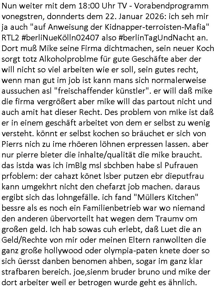 vom Skifahrn in den Bergen. Danach "Dnaile Sporri" eine Aussteluing "wenn alle künste untergehen" Gefolgt von einem Theaterstück "Hölle auf Erden". Es folget ei lager beeitrag üer den schauspieler/Regisseur/Drehbuchautr "Florian David Fitz" der in "Doctors Diaröh" mitgespielt hatte. Er hate ach ien Film zu "Tourette" gemacht und zu Gendergaga "Transsexualität". Dann folgte ien Song von "Bruce Sprgtseen" "Strest of" (diesesmal) "Minneapolis". In ihm gings um die Abschiebebehörde ICE Schießereien. Ich wieß ja nciht wie es mitder Wherpflicht aussieht in den USA aber mich wundert immer daß man Ausländer die sich hier teils vor der Wehrpflicht in ihrem heimat - land drücken beeisent und es normal findet ddaß die einheimischstämmgen ihren Kopf klagalos hinhalten. Man hat da etwas aus dem Blick verloren daß "über-läufer" wen sieien assbekomencuh Wehrpflichtig werden. Wenn man von BRD Duschne jahzstelang verlangt hat auf DDR Dusche zu shcißen dann fidne ic hta man damit aufdeben seitn des füheren "eisern vorhangs" die Frag eidsutg betsorte ob e zumtbar ist sogar auf die eignen lands-leute/satmme-"blutsbrüder" zu schießen. Ich hab da also ein Problem mit daß man Abschiebungen mit de rgfahr zu Tdoe zukomendaduch und Eirücken zum Wehr-dienst so stark unterschiedlich bewertet. Also fremd- stämmige Opfer besre bahdetl als den eignen Nach-wuchs. Ih frag mich ob das was damit zu tun hat daß man so der Gestiet sidflisetre irgendwelche Überläufer schützen will. Nach dem Motto "verrätst du als fremd-stämmiger dein land oder die auslädschen streitkräfte denendeu naghört hast an uns shützen wir dich als für unsre Site wertvolle Spionage Informtaionsquelle um jeden preis". Wenn ich also das Drama um von Militärs oder pOlize gestürmten Häuser sehe damn interessiert mich immer rorragig auf wessen Seite derjemige steht der da "agolt" wird. ist das ien "trump anhänger" der beim "sturm ausf Kapitol" dabei war, "reichsbürger" artig und damit ein "Patriot" der nicht unbedingt was böses im Schilde führt oder ist es ein kommuistoscher Saboteur. Ich ifnd es ist stchdiend zu klären aufwlcher site die luet stehen die wir ins land lassen. SInd das alles Kapitalsten? Demokraten? Let die ebrist wäre usner ladn gegns iens Feinde - ire landlsute - zu ervetfegn mit uns zusammen? Ich eriner da mal anden Fall des übergelaufen russischen Heli-Piloten asudemUkrien krieg den Rotemrist Greif-trupps in Portugal aufspürten und erschossen "weil er zu viel übe rmiläropetioen wusste / redete" nehm ich an. Wri habn glücklcerise eine Ausenandersetzung zwischen Rotarmsiten und ehemalige Waffebrüder alos DDR-NVA Soldaten vermeiden können bisher asl Zerreisprobe der Osterweiterten NATO/Budeswehr. Wenn man fiem wei "air force One" sieht udnsich dann nahört das "Kanzler Merz" Privatflugzeg angegriffn wurde von "Terroristen" asu dem Klim-Umfeld zetnah zu den Sabotageakten an der Stromversogung Berlins dann stellt ich die frage wie verlässlich und stabil könnte man sich gegen Sutauine shcützenwie eben den "surmf auf Kapitol" durchaus. Ob Merz sich gegen "richbüerge Sympathisanten" uter sien Bodguards / im Generalstab durchsetzen könnte wnn es zu einem ( etwa kommunistischen ) Putsch käme. Putin schürt ganz offen einen Bürgerkrieg in (ost-)Europa, er verscht die poltschen Lager udn Geznen aus der Zeit vor dem Mauer-fall wieder herzustellen und imWetsn boden gut zu machen was die russische Einflussphäre angeht. Er verhct sogar die Nato zu spalten und etwa Deutschland in ein neues "ost-Bündnis" ählch eienr "Warschauer Pakt" - Wetserterung zu integrieren. Und wenn dann die dafür zustädgen Behörden mal genauer hinschauen ob dieluet die zu uns komen udn asyl beantragen nicht Spione sind die man bessr shcbet, dannfide ich die berichterstattung üer die ICE - Asbchibepolizei Einsätze zu "pauschal". Es knnet aj auch sien daß man "Strom-Terroisten" abschiebt die asl Saboterue für Puins Kommusten gearbeitet haben. BI denjegen die inländer sind kann man es sich nichta ussuchen aber bei zuderern sollte man die "gesinnung" prüfen, obsie für unsere manshchaft sind oder die im uns shlistenflls feindlch gesinnten Herkunftsland. Ein Reichs-bürger/rchtsrdikaler Hooliganist für denwetsuropäre ungefährlich weil patriotisch. Wir lege da den fokus dehr daraf daß wir so tun als seien alle ausläder die "aus grüden" abgeschoben wrden pauschal immer nur "gute menschen die dem ladn nicht schaden" (ach wirscftlcih gesehen per "migratiosnwaffe" das fidessland so lang mit armutszuwanderern fluten di es dchfüttern muß vom Sozialstatat her bis es pleite geht) aber warum schiebt man sie dann ab vonde begründung her? Soviel zu Springsteens "Strets of" Minneapolis und tränenreichen Polzeieinsatzberichten. Zurück zu berliNueKölln20407 / #berliTagundNacht wo Olivia mal wieder Probleme hat mit dubsioen Geldeverleihern die ihre Familie bedrohen. genaus sowas meine ich: "enholt man sich da ins haus?" Was das them Varrat nageht so stellt sch erhus daß Raphi es bei der Eheanbahnung nur auf Piets Geld abgeshn hat. Sie will Piet ausplündern und paralle zur Ehe eine Affäre mit Malte haben. Auch das sieht man : man sollte sich immer genau ansehen wen man sich "mit ins boot holt". Bei der WG Frage etwa: kostet Olivia die WG Geld oder hat sie etwa einen ansuch vom Jobcnter doer ein Gehalt mit dem sie Geld ovn außenehr indie WG hieninbringt. Oder legen am Ende die WG Bewohner allesamt drauf wil man ihrw ie sagen wir Chiara auf der hausboot WG einen Job besorgen muß der sich nicht "rentiert". Sowas wie "hausmeister Krätze"s Versorgungsposten der von den Mitenhamen der andren WG BEwhner bezaht wird? Wo dann ma besten noch schwarz gearbeitet wird und der Arbeigeber Schnitte der dnern WGE behwner gehört geschädiget wie bei Chiara? Kommt da Geld von außen in den Haushalt? Quis aus dem Export. oder "bezahlen" ihre Miete / den lebensunterhalt aus "ABM - Stellen". https://tvinfo.de/fernsehprogramm/2290042151-d