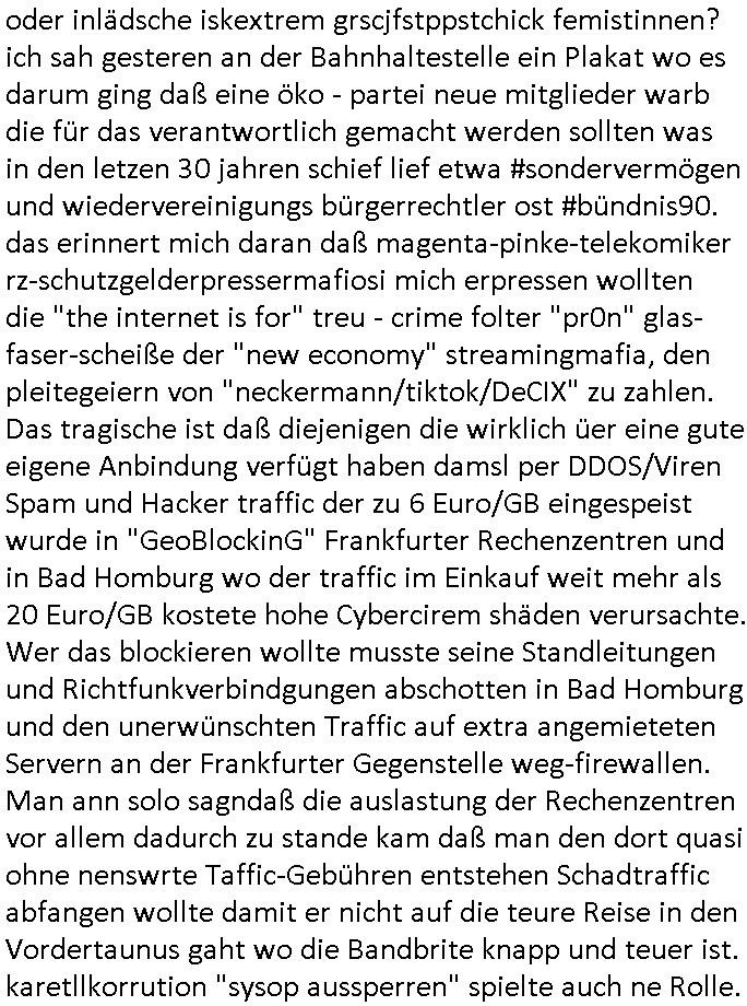 oder inlädsche iskextrem grscjfstppstchick femistinnen? ich sah gesteren an der Bahnhaltestelle ein Plakat wo es darum ging daß eine öko - partei neue mitglieder warb die für das verantwortlich gemacht werden sollten was in den letzen 30 jahren schief lief etwa #sondervermögen und wiedervereinigungs bürgerrechtler ost #bündnis90. das erinnert mich daran daß magenta-pinke-telekomiker rz-schutzgelderpressermafiosi mich erpressen wollten die "the internet is for" treu - crime folter "pr0n" glas-faser-scheiße der "new economy" streamingmafia, den pleitegeiern von "neckermann/tiktok/DeCIX" zu zahlen. Das tragische ist daß diejenigen die wirklich üer eine gute eigene Anbindung verfügt haben damsl per DDOS/Viren Spam und Hacker traffic der zu 6 Euro/GB eingespeist wurde in "GeoBlockinG" Frankfurter Rechenzentren und in Bad Homburg wo der traffic im Einkauf weit mehr als 20 Euro/GB kostete hohe Cybercirem shäden verursachte. Wer das blockieren wollte musste seine Standleitungen und Richtfunkverbindgungen abschotten in Bad Homburg und den unerwünschten Traffic auf extra angemieteten Servern an der Frankfurter Gegenstelle weg-firewallen. Man ann solo sagndaß die auslastung der Rechenzentren vor allem dadurch zu stande kam daß man den dort quasi ohne nenswrte Taffic-Gebühren entstehen Schadtraffic abfangen wollte damit er nicht auf die teure Reise in den Vordertaunus gaht wo die Bandbrite knapp und teuer ist. karetllkorrution "sysop aussperren" spielte auch ne Rolle. | |