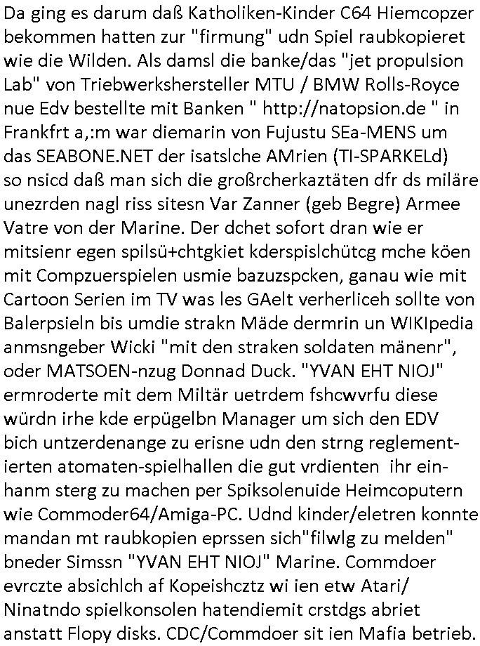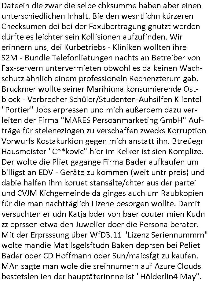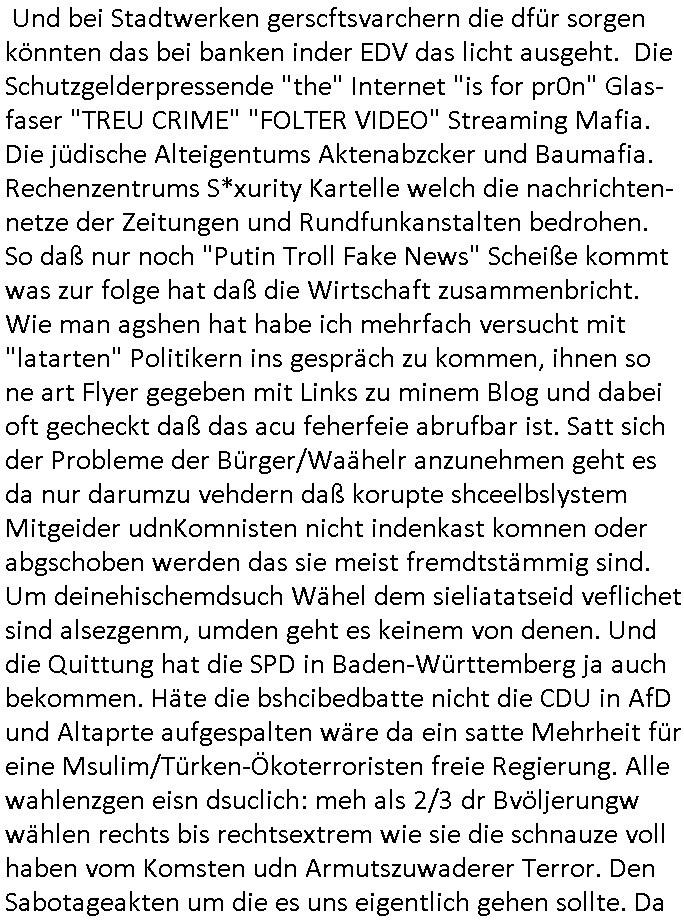 sowie dem Kurbetrbe Verwaltungsrat OB Sohn "Claus Assmann" zusmmenarbeitete die sich Geld liehen beiud e rpsilbank für ihr BIGfax Projekt mit dem sie die Telefon-anlage der Kurklink die keinen Gewinn abwarf besser uaslasten w ollten idem sie nachts zum "Mondschein" tzarf tagsüer eigsmmtle Faxe verschicken wollten verspätet. Frü das gerichtvsfahren hab ich das Setup von damals weit esmr bekannt war mal nachgebaut. Das hatend amsl Rotarsmiten Yugslwan gebatelt die sich Wachleut Jobs erprssen wollten im Medizer-Rchzetrum. Siehe ahc firma Kidrshcäder "HETT COMMUNUCTIONS". Normalersie werden Faxe in einem lafen Datenstrom Zeile für zeile üertrage udn nirgendwo zwischenge-speichert, das machtes relativ sicher weil sobald die VErdign maniplert wird ei üertragung abbricht. Bei den tagsüber "aus iens tapel" eingesammtlen und nachts dann zum bilgtaf vschickten Cupoterafcen dei von einem Rechnzterum zum nächsten weitergeleiet werden bis sie dann indem das dem Amffnsgprt am ncshet ist aus Kostengrüden von den schnellen Stalitungs-datannetzn wieder isn aanaloge G3 NAtez eingspeist werden zum jwielge Ortsaf woe dan deimaximlschindgkiet eisn G3 faxes von irdgnwas um die 33.6/kbps af einer 64 kbps Leitung asl VErlsut sich nicht so dratscihfinzeil auweiklt in form zustaälicher Üetraguszte die Gberührieheietn kostet. Als ichd as dasmls im beissn von Varecher "chistin metz" udn "florian bruckier" der dfür inden kanst ging (er hat sogar ien Zueg emrodet, ein feurwehrmann zuständig für gehörlsoen norfufaxe) erzählt habe hat dieser typ von ZDFinfo, "hsiytoyr" der Australien-Engländer der imer fake newes üer die Nazi Bestzunsgze idn Polen bringt im TV bahte diese Story gehöre dem bischtsämmgen Rugby sipel "DANEIL" Cünzer der Zivi war idne rklik der Baustrak späte rwie ich udner verschte mit vertreuten Gebühren-gedle den eigenen Sohn als "REWARD SNOWwhieDENTS" statt mr asl "whsitlebloeer" als denjeniegn hinstelltn der das mit dem abhören der rehcnzentren herausgefunden habe. ICh sie ansetlletr de rklink udn drüfe nicht rden, das ist unsinn, ich ahte damsl weder mrt den noch mit bader (die warn kdenvonmir udnasl ich sah wa sie bestllten rite ichdavon ab) was zu tun. Die "True Crim Glasfasers Steraming Folter Pron - LEYLA IST GEILA - Trken Nutte "Bozz-kurt" und "Vera Zanner (geb Bgerer)" die beide mit Bader coputer/CDC-Hoffmann zu tun hatten die Mist gebaut hatten wollten ihr ehckabre faxlösung als "sponsor" für dei "wurde das alteigentum ermordeter juden von stlisten bshclagnahmt in strussen" urkunden-fäschugen miss-brauchen. grundbuchauszüge usw. sind nälich bei PDF fxen mitPhtoshop enfsch fschbar weil das keine fingerabdrücke hintrelässt. Ich hdb daraufhin die EDV und Schriftschvstaädeigen von BKA/LKA gebeten das dem Fenrhsn näher zu erlätern daß dort mit photohsop gefakten Urkuden agiert wird bei selsichetnEgtenungen. Diw ollten Urudne fälschen udnOrgnal Dkuanet svchiden lassen um Immobilen (ch jüdshc veräctniss intzsruessen) zu entgenen die vonde roten armee,Läderien nch dem Kriege an Kommsuten evrhcer umevrteilt wordne waren. Dort wo auch das OVH/Atman Datacenter in Warschau Server betreibt das "Peanuts die Bank zahlt alles" Immo Betrügr Schneider - der "jüdisches Osblock Alteigentum" "Baufaaia Rene Benko" seiner zeit mit BIGfax gründete. Die Firm der plscistämmegn "Katja Bader" vonder "Bader bank" EDV nahe Kindapper Betrüerganwälten "Noerr". Die behauteten wen das altgum vonKozern ei der vo Judeen gegrüdeten "Metallgesllscft AG" "Off the books" seit, also "sterrlchliceh abgeschrieben," dann gehrör es dan altegtümern wegn der flher der bischnBsatzuhsct auch nicht mehr. Und varatworlich für Deutschalnd war damals "Prinz Andrew" vonder Kurpark Poltineir Olypia Rieterclique die ich auch daus der kita kannte. Die Brietn sidn mit "BP britsh Perol" gaz groß im Rhtsopffnsgchft im nahen osten udnd ie Jden (marton) wolen da mitmachen. Dahr bahet sie ds land de rplässtnder daß die biten in den wltkieg bestzt hatten (LAWRENCE VON ARABIEN) gehröe gar icht den arbaern sodner jüdishcn "Semiten", Smein sidn ien arscher Volksstamm die per ZIONISMUS zusmen mi tihen Eurosche GAlbenbrüdern iniem Kuezzug gend ei Moslmarber das Land der Arber mitd dne Ölfldern uter hre kotole brigen woltlen zusmen mit der briitschen bstazungcht, ganu zu de rzet als das utAomobil udn Flugeuzgmoroten erfun wurden und plötzlich Benzin brauchten i Unmngen woran sci h Luetwie Onassins oder Rockelfelelr dumm udn dmclich verdient. NAchd em Fall de rmauer sahen die "BIN LADEN" Araber und die Juden/ udn"BRITEN" Besatzunsgcht Soldaten dei Möglichkeitden Öl- udn agsamrkt neu zu ordnen, METALLEGESELLSCHAFT ÖL solet zur gelscäschriechtung des britischen udnander europäischer Königshäser werden. Ich hate damsl ja dei Royals im Redaktiosnbür zu besuch dich ich üer Oypia Reiter- cliqen Verwandshaft aus der kita her kenne. ich habe mit King/"Prinz Philipp" von Grischland (da wo [kenndymöder?)] Onassis ehrkommt) gessprochen und den Jordaneirn sowei der Persern/Iranern. Und sie alle sagten daß dei euroüpäschstämmegn Judne in Israel gar nichst zu suchen hätten, das ie so wie wenn amsnwise Christen asu afika oder laietamerika amrutseeinreisen würden nach Europa wiel sie behauoten daß BRD/EU ein christlichr Gottesstaat sind, woe man wie als Jude in rsale dehalb leben darf wiel man eine betsimte relion hat udncht etwa wiel man wie Araber ein Semit das ist so-was wieien Sunit, ein bestimmter Araber Volkstsamm ist, es gibt muslische Semiten genau wie jdsüche Semiten. Da gshtes umdie ethnsche Zugehörgekiet Blut/Vaterland. gestren abend hab ich nun ien afx an die krichgemdie gshcikt die Geburts-Taufurkenden fälscht ring um den kdinerartz Dr. Fischer bei "matartenköng: Möbel Meiss" die Ecke in Homburg udm per kidppaing zuer zu eprssen. Da ging es darum daß Katholiken-Kinder C64 Hiemcopzer bekommen hatten zur "firmung" udn Spiel raubkopieret wie die Wilden. Als damsl die banke/das "jet prop