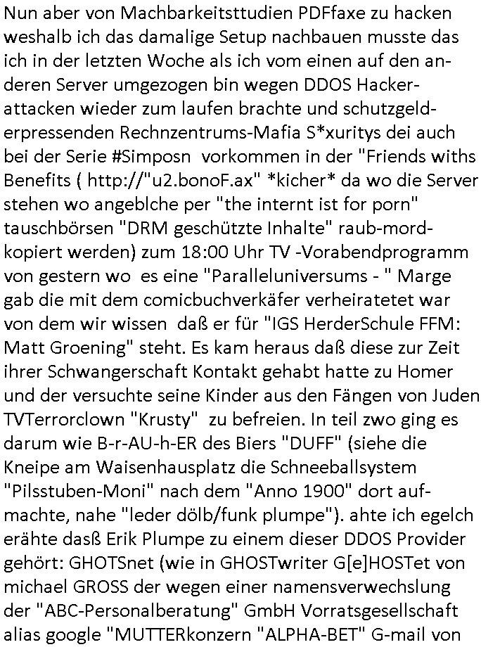 | Nun aber von Machbarkeitsttudien PDFfaxe zu hacken weshalb ich das damalige Setup nachbauen musste das ich in der letzten Woche als ich vom einen auf den an-deren Server umgezogen bin wegen DDOS Hacker-attacken wieder zum laufen brachte und schutzgeld-erpressenden Rechnzentrums-Mafia S*xuritys dei auch bei der Serie #Simposn vorkommen in der "Friends withs Benefits ( http://"u2.bonoF.ax" *kicher* da wo die Server stehen wo angeblche per "the internt ist for porn" tauschbörsen "DRM geschützte Inhalte" raub-mord-kopiert werden) zum 18:00 Uhr TV -Vorabendprogramm von gestern wo es eine "Paralleluniversums - " Marge gab die mit dem comicbuchverkäfer verheiratetet war von dem wir wissen daß er für "IGS HerderSchule FFM: Matt Groening" steht. Es kam heraus daß diese zur Zeit ihrer Schwangerschaft Kontakt gehabt hatte zu Homer und der versuchte seine Kinder aus den Fängen von Juden TVTerrorclown "Krusty" zu befreien. In teil zwo ging es darum wie B-r-AU-h-ER des Biers "DUFF" (siehe die Kneipe am Waisenhausplatz die Schneeballsystem "Pilsstuben-Moni" nach dem "Anno 1900" dort auf-machte, nahe "leder dölb/funk plumpe"). ahte ich egelch erähte dasß Erik Plumpe zu einem dieser DDOS Provider gehört: GHOTSnet (wie in GHOSTwriter G[e]HOSTet von michael GROSS der wegen einer namensverwechslung der "ABC-Personalberatung" GmbH Vorratsgesellschaft alias google "MUTTERkonzern "ALPHA-BET" G-mail von