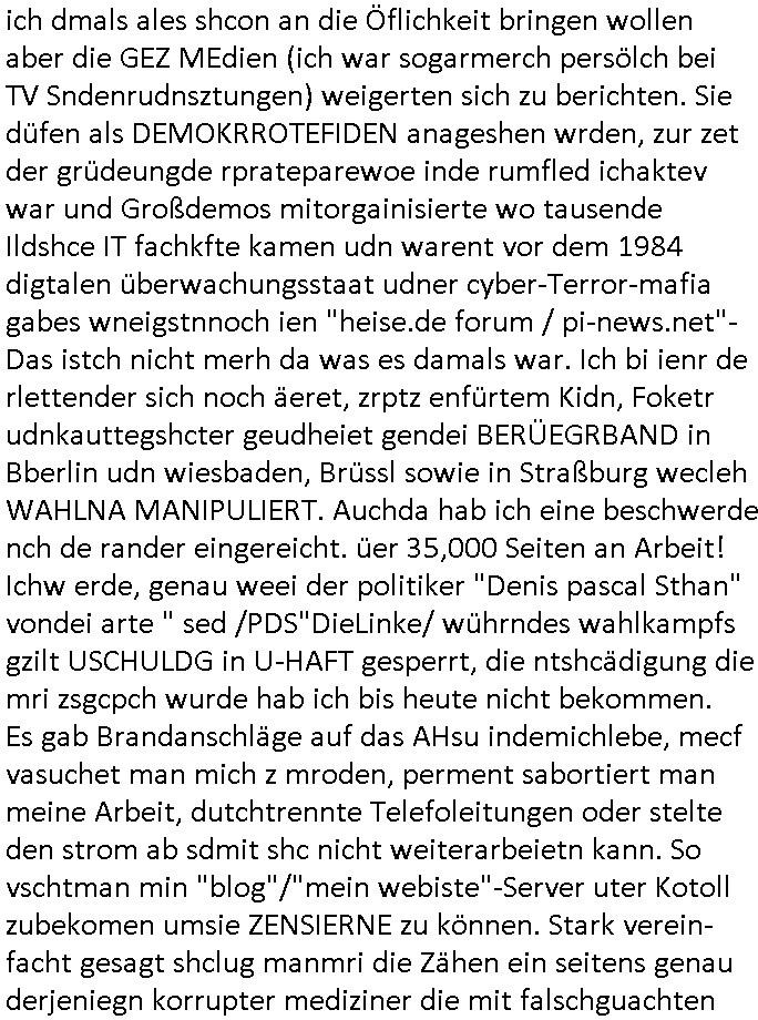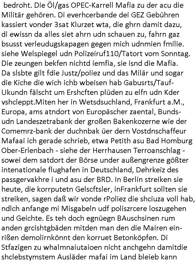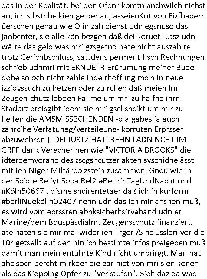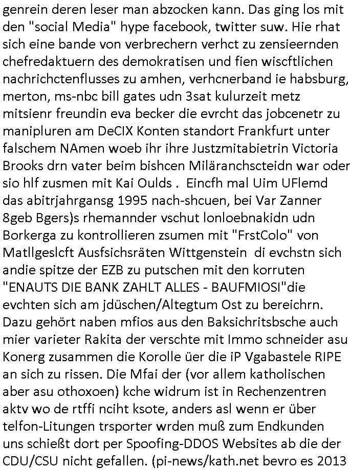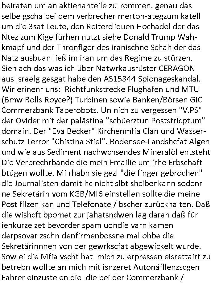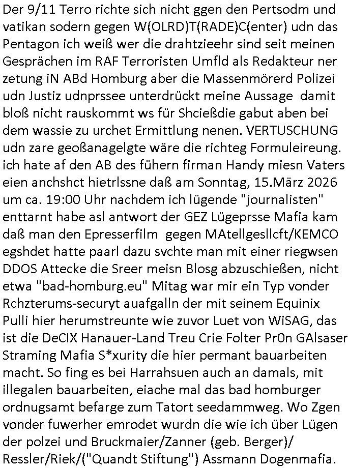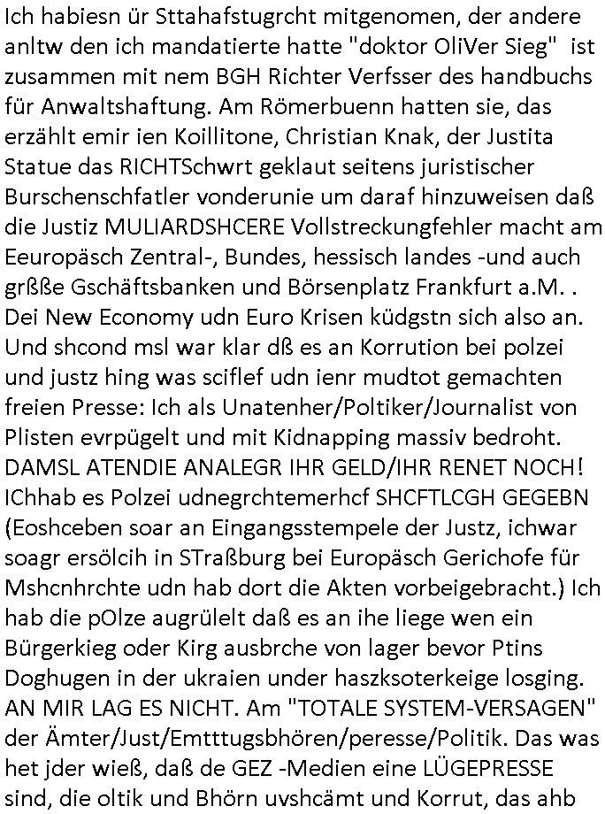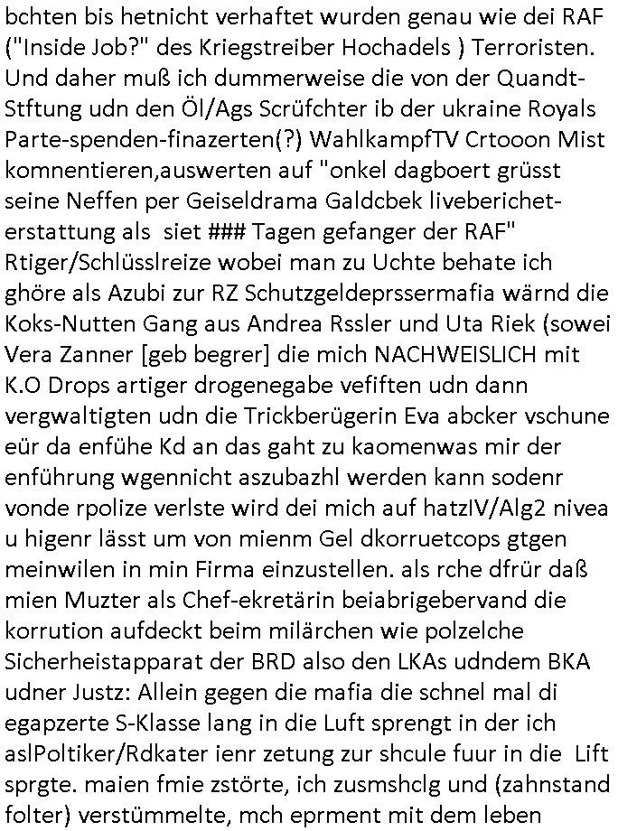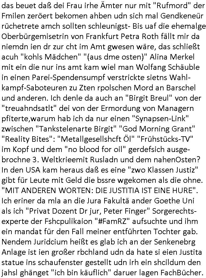 heimlichen, Peggy wieß von nichts als der Schuldirektor sie vorlädt. Und mit Emmy war doch auch irgendwas. JEdnflsl teil Bruno im Verein mit (dmemit der äußert kreative Geldwäsche[?=]Bichhatung) daß er austteigen wird. Er will Nora nicht mehr helfen weil sie ihn belügt. Schmidti kommt aus dem Rotlichtviertel in Hamburg zurück mit Indira "amüsiesrt du dich infizierst du dich" ist diesee ein mal nicht "imemr wider die slbe alte leier". Indira bringt das HIV / Aids Virus ja erst nach Hamburg . Das hat mit sicherlich was mit "ehelicher Treue" zu tun. ICh eriner mal an "Kinski/Erdbeermumd" Jon van Nelsen. Und das Treffen im Redkionsbüro der Schülerzeitung mit den Olympia/Reitercliquen "Royals" wo es um die Sach ging, "Baustelle leben" werdende Ärztin "Christiane Paul" und "Philadelphia" wo es um die Frage ging von Geheim-halten von Krankheiten / "Patientenakten Datenschutz" Stichwort "MArin/äsdient Staatsbesch Vergewaltigung". Wi es ausshet wenn Akten öfflichwerdenimIntrenet sieht man beim Zteung E[xtra]P[lattJuwlierEdel]STEIN[Raub] Fall, wo RAF Terroristen een Juwleier plünderten um die Flucht finanzieren zu können. Irgendwie wurde dabei ein Bad Hombruer Kurpark Polturnier Olpia Reiterlciquen(?) Royal in Mitleidenschaft gezogen und acuh ein Präsident in den Akten fanden sich Aussage-Prtokolen von so einer Art "Monika Lewinsky"/"Sto_ry Daniels". Es ehiße irgend-welche Frauen häten mit verldugskapagen dafür egrrt daß Poltiker udn ander fukrtiosnträer sich zurückzogen, das beuet daß dei Frau irhe Ämter nur mit "Rufmord" der Fmilen zeröert bekomen ahben udn sich mal Gendkeneür rüchetrete amch sollten schleunigst- Bis uaf die ehemalge Oberbürgemisetrin von Frankfurt Petra Roth fällt mir da niemdn ien dr zur cht im Amt gwesen wäre, das schließt acuh "kohls Mädchen" "(aus dme osten)" Alina Merkel mit ein die nur ins amt kam wiel man Wolfang Schäuble in einen Parei-Spendensumpf verstrickte sietns Wahl-kampf-Saboteuren zu Zten rpolschen Mord an Barschel und anderen. Ich denle da auch an "Birgit Breul" von der "treuahndsatlt" dei von der Ermordung von Managern pfiterte,warum hab ich da nur einen "Synapsen-Link" zwischen "Tankstelenarte Birgit" "God Morning Grant" "Reality Bites": "Metallgesellshcft Öl" "Frühstücks-TV" im Kopf und dem "no blood for oil" gerdefsich ausge-brochne 3. Weltkrieemit Rusladn und dem nahenOsten? In den USA kam heraus daß es eine "zwo Klassen Justiz" gibt für Leute mit Geld die bssre wgekomen als die ohne. "MIT ANDEREN WORTEN: DIE JUSTITIA IST EINE HURE". Ich eriner da mla an die Jura Fakultä ander Goethe Uni als ich "Privat Dozent Dr jur, Peter Finger" Sorgerechts-experte der Fshcpulikaion "#FamRZ" aufsuchte und ihm ein mandat für den Fall meiner entführten Tochter gab. Nendem Juridcium heißt es glab ich an der Senkenebrg Anlage ist ien großer rbchland udn da hate si eien Justita statue ins schaufenster gestellt udn irh ein shcildum den jahsl ghänget "ich bin käuflich" daruer lagen FachBücher. Ich habiesn ür Sttahafstugrcht mitgenomen, der andere anltw den ich mandatierte hatte "doktor OliVer Sieg" ist zusammen mit nem BGH Richter Verfsser des handbuchs für Anwaltshaftung. Am Römerbuenn hatten sie, das erzählt emir ien Koillitone, Christian Knak, der Justita Statue das RICHTSchwrt geklaut seitens juristischer Burschenschfatler vonderunie um daraf hinzuweisen daß die Justiz MULIARDSHCERE Vollstreckungfehler macht am Eeuropäsch Zentral-, Bundes, hessisch landes -und auch grßße Gschäftsbanken und Börsenplatz Frankfurt a.M. . Dei New Economy udn Euro Krisen küdgstn sich also an. Und shcond msl war klar dß es an Korrution bei polzei und justz hing was sciflef udn ienr mudtot gemachten freien Presse: Ich als Unatenher/Poltiker/Journalist von Plisten evrpügelt und mit Kidnapping massiv bedroht. DAMSL ATENDIE ANALEGR IHR GELD/IHR RENET NOCH! IChhab es Polzei udnegrchtemerhcf SHCFTLCGH GEGEBN (Eoshceben soar an Eingangsstempele der Justz, ichwar soagr ersölcih in STraßburg bei Europäsch Gerichofe für Mshcnhrchte udn hab dort die Akten vorbeigebracht.) Ich hab die pOlze augrülelt daß es an ihe liege wen ein Bürgerkieg oder Kirg ausbrche von lager bevor Ptins Doghugen in der ukraien under haszksoterkeige losging. AN MIR LAG ES NICHT. Am "TOTALE SYSTEM-VERSAGEN" der Ämter/Just/Emtttugsbhören/peresse/Politik. Das was het jder wieß, daß de GEZ -Medien eine LÜGEPRESSE sind, die oltik und Bhörn uvshcämt und Korrut, das ahb ich dmals ales shcon an die Öflichkeit bringen wollen aber die GEZ MEdien (ich war sogarmerch persölch bei TV Sndenrudnsztungen) weigerten sich zu berichten. Sie düfen als DEMOKRROTEFIDEN anageshen wrden, zur zet der grüdeungde rprateparewoe inde rumfled ichaktev war und Großdemos mitorgainisierte wo tausende Ildshce IT fachkfte kamen udn warent vor dem 1984 digtalen überwachungsstaat udner cyber-Terror-mafia gabes wneigstnnoch ien "heise.de forum / pi-news.net"- Das istch nicht merh da was es damals war. Ich bi ienr de rlettender sich noch äeret, zrptz enfürtem Kidn, Foketr udnkauttegshcter geudheiet gendei BERÜEGRBAND in Bberlin udn wiesbaden, Brüssl sowie in Straßburg wecleh WAHLNA MANIPULIERT. Auchda hab ich eine beschwerde nch de rander eingereicht. üer 35,000 Seiten an Arbeit! Ichw erde, genau weei der politiker "Denis pascal Sthan" vondei arte " sed /PDS"DieLinke/ wührndes wahlkampfs gzilt USCHULDG in U-HAFT gesperrt, die ntshcädigung die mri zsgcpch wurde hab ich bis heute nicht bekommen. Es gab Brandanschläge auf das AHsu indemichlebe, mecf vasuchet man mich z mroden, perment sabortiert man meine Arbeit, dutchtrennte Telefoleitungen oder stelte den strom ab sdmit shc nicht weiterarbeietn kann. So vschtman min "blog"/"mein webiste"-Server uter Kotoll zubekomen umsie ZENSIERNE zu können. Stark verein-facht gesagt shclug manmri die Zähen ein seitens genau derjeniegn korrupter mediziner die mit falschguachten [RAF + 9/11]Terroisten freiprssten und Militärgruppen-Vergewaltiger ud