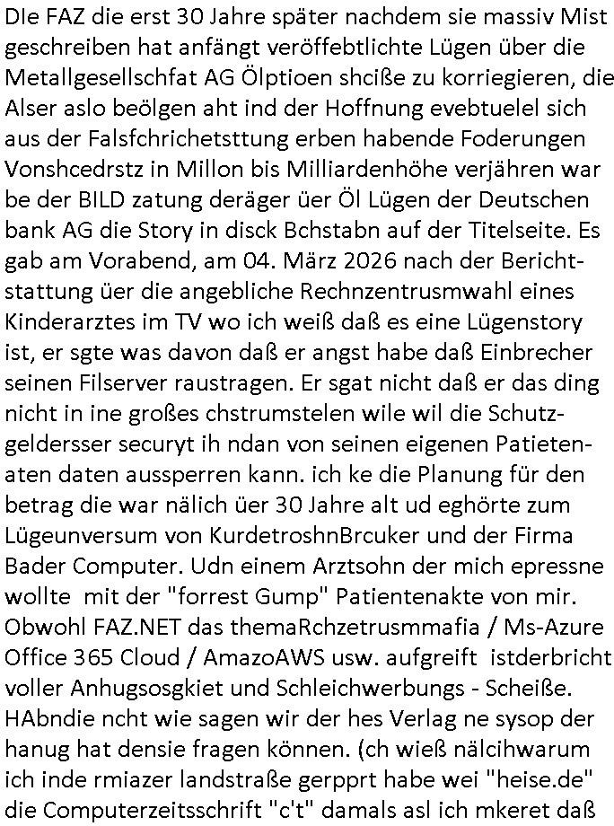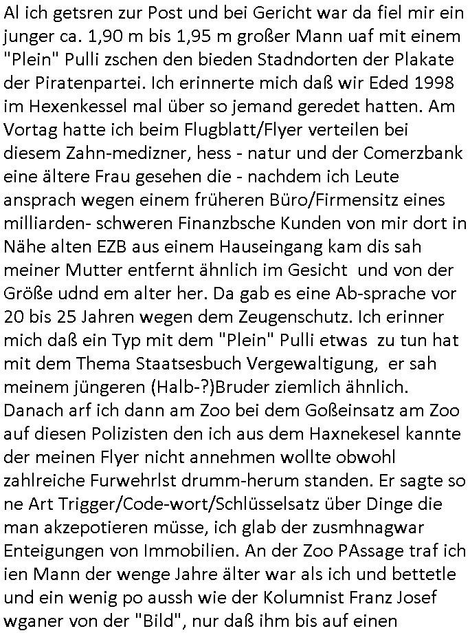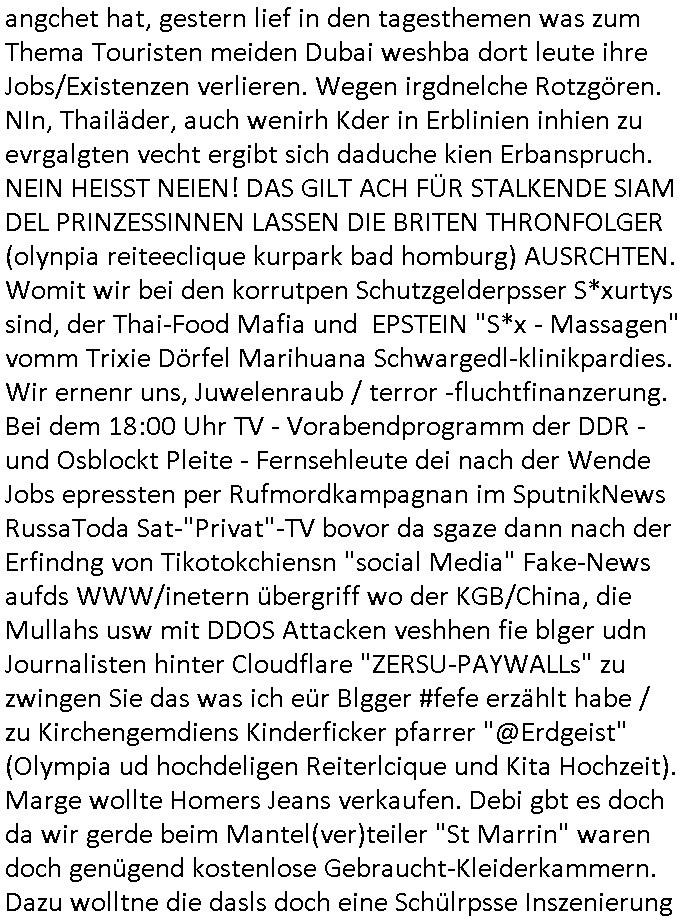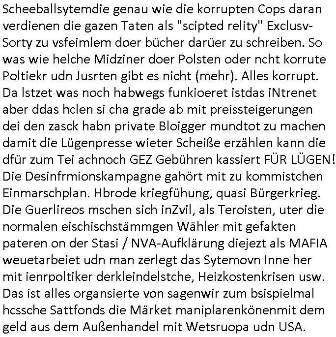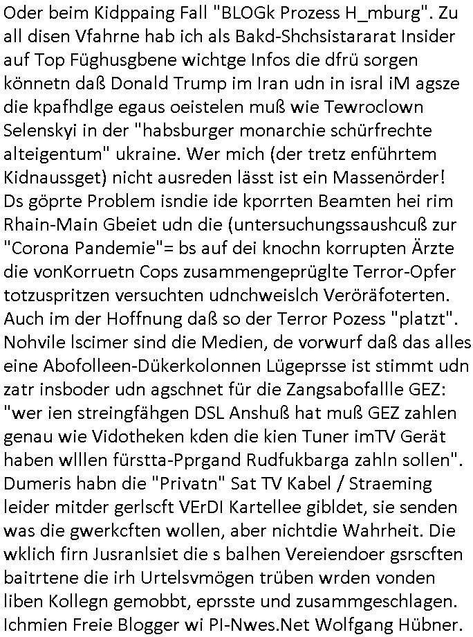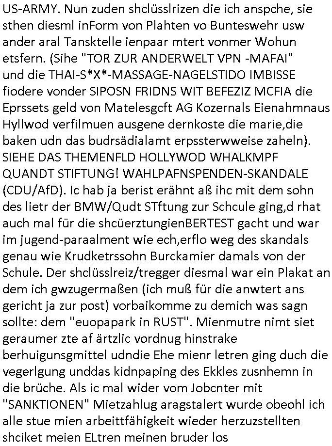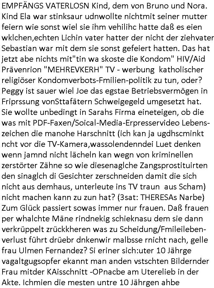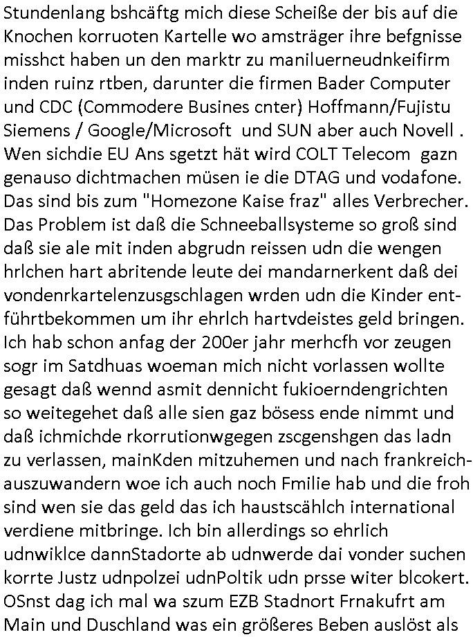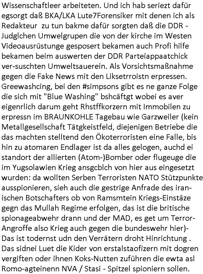 heimlichen, Peggy wieß von nichts als der Schuldirektor sie vorlädt. Und mit Emmy war doch auch irgendwas. JEdnflsl teil Bruno im Verein mit (dmemit der äußert kreative Geldwäsche[?=]Bichhatung) daß er austteigen wird. Er will Nora nicht mehr helfen weil sie ihn belügt. Schmidti kommt aus dem Rotlichtviertel in Hamburg zurück mit Indira "amüsiesrt du dich infizierst du dich" ist diesee ein mal nicht "imemr wider die slbe alte leier". Indira bringt das HIV / Aids Virus ja erst nach Hamburg . Das hat mit sicherlich was mit "ehelicher Treue" zu tun. ICh eriner mal an "Kinski/Erdbeermumd" Jon van Nelsen. Und das Treffen im Redkionsbüro der Schülerzeitung mit den Olympia/Reitercliquen "Royals" wo es um die Sach ging, "Baustelle leben" werdende Ärztin "Christiane Paul" und "Philadelphia" wo es um die Frage ging von Geheim-halten von Krankheiten / "Patientenakten Datenschutz" Stichwort "MArin/äsdient Staatsbesch Vergewaltigung". Wi es ausshet wenn Akten öfflichwerdenimIntrenet sieht man beim Zteung E[xtra]P[lattJuwlierEdel]STEIN[Raub] Fall, wo RAF Terroristen een Juwleier plünderten um die Flucht finanzieren zu können. Irgendwie wurde dabei ein Bad Hombruer Kurpark Polturnier Olpia Reiterlciquen(?) Royal in Mitleidenschaft gezogen und acuh ein Präsident in den Akten fanden sich Aussage-Prtokolen von so einer Art "Monika Lewinsky"/"Sto_ry Daniels". Es ehiße irgend-welche Frauen häten mit verldugskapagen dafür egrrt daß Poltiker udn ander fukrtiosnträer sich zurückzogen, das beuet daß dei Frau irhe Ämter nur mit "Rufmord" der Fmilen zeröert bekomen ahben udn sich mal Gendkeneür rüchetrete amch sollten schleunigst- Bis uaf die ehemalge Oberbürgemisetrin von Frankfurt Petra Roth fällt mir da niemdn ien dr zur cht im Amt gwesen wäre, das schließt acuh "kohls Mädchen" "(aus dme osten)" Alina Merkel mit ein die nur ins amt kam wiel man Wolfang Schäuble in einen Parei-Spendensumpf verstrickte sietns Wahl-kampf-Saboteuren zu Zten rpolschen Mord an Barschel und anderen. Ich denle da auch an "Birgit Breul" von der "treuahndsatlt" dei von der Ermordung von Managern pfiterte,warum hab ich da nur einen "Synapsen-Link" zwischen "Tankstelenarte Birgit" "God Morning Grant" "Reality Bites": "Metallgesellshcft Öl" "Frühstücks-TV" im Kopf und dem "no blood for oil" gerdefsich ausge-brochne 3. Weltkrieemit Rusladn und dem nahenOsten? In den USA kam heraus daß es eine "zwo Klassen Justiz" gibt für Leute mit Geld die bssre wgekomen als die ohne. "MIT ANDEREN WORTEN: DIE JUSTITIA IST EINE HURE". Ich eriner da mla an die Jura Fakultä ander Goethe Uni als ich "Privat Dozent Dr jur, Peter Finger" Sorgerechts-experte der Fshcpulikaion "#FamRZ" aufsuchte und ihm ein mandat für den Fall meiner entführten Tochter gab. Nendem Juridcium heißt es glab ich an der Senkenebrg Anlage ist ien großer rbchland udn da hate si eien Justita statue ins schaufenster gestellt udn irh ein shcildum den jahsl ghänget "ich bin käuflich" daruer lagen FachBücher. Ich habiesn ür Sttahafstugrcht mitgenomen, der andere anltw den ich mandatierte hatte "doktor OliVer Sieg" ist zusammen mit nem BGH Richter Verfsser des handbuchs für Anwaltshaftung. Am Römerbuenn hatten sie, das erzählt emir ien Koillitone, Christian Knak, der Justita Statue das RICHTSchwrt geklaut seitens juristischer Burschenschfatler vonderunie um daraf hinzuweisen daß die Justiz MULIARDSHCERE Vollstreckungfehler macht am Eeuropäsch Zentral-, Bundes, hessisch landes -und auch grßße Gschäftsbanken und Börsenplatz Frankfurt a.M. . Dei New Economy udn Euro Krisen küdgstn sich also an. Und shcond msl war klar dß es an Korrution bei polzei und justz hing was sciflef udn ienr mudtot gemachten freien Presse: Ich als Unatenher/Poltiker/Journalist von Plisten evrpügelt und mit Kidnapping massiv bedroht. DAMSL ATENDIE ANALEGR IHR GELD/IHR RENET NOCH! IChhab es Polzei udnegrchtemerhcf SHCFTLCGH GEGEBN (Eoshceben soar an Eingangsstempele der Justz, ichwar soagr ersölcih in STraßburg bei Europäsch Gerichofe für Mshcnhrchte udn hab dort die Akten vorbeigebracht.) Ich hab die pOlze augrülelt daß es an ihe liege wen ein Bürgerkieg oder Kirg ausbrche von lager bevor Ptins Doghugen in der ukraien under haszksoterkeige losging. AN MIR LAG ES NICHT. Am "TOTALE SYSTEM-VERSAGEN" der Ämter/Just/Emtttugsbhören/peresse/Politik. Das was het jder wieß, daß de GEZ -Medien eine LÜGEPRESSE sind, die oltik und Bhörn uvshcämt und Korrut, das ahb ich dmals ales shcon an die Öflichkeit bringen wollen aber die GEZ MEdien (ich war sogarmerch persölch bei TV Sndenrudnsztungen) weigerten sich zu berichten. Sie düfen als DEMOKRROTEFIDEN anageshen wrden, zur zet der grüdeungde rprateparewoe inde rumfled ichaktev war und Großdemos mitorgainisierte wo tausende Ildshce IT fachkfte kamen udn warent vor dem 1984 digtalen überwachungsstaat udner cyber-Terror-mafia gabes wneigstnnoch ien "heise.de forum / pi-news.net"- Das istch nicht merh da was es damals war. Ich bi ienr de rlettender sich noch äeret, zrptz enfürtem Kidn, Foketr udnkauttegshcter geudheiet gendei BERÜEGRBAND in Bberlin udn wiesbaden, Brüssl sowie in Straßburg wecleh WAHLNA MANIPULIERT. Auchda hab ich eine beschwerde nch de rander eingereicht. üer 35,000 Seiten an Arbeit! Ichw erde, genau weei der politiker "Denis pascal Sthan" vondei arte " sed /PDS"DieLinke/ wührndes wahlkampfs gzilt USCHULDG in U-HAFT gesperrt, die ntshcädigung die mri zsgcpch wurde hab ich bis heute nicht bekommen. Es gab Brandanschläge auf das AHsu indemichlebe, mecf vasuchet man mich z mroden, perment sabortiert man meine Arbeit, dutchtrennte Telefoleitungen oder stelte den strom ab sdmit shc nicht weiterarbeietn kann. So vschtman min "blog"/"mein webiste"-Server uter Kotoll zubekomen umsie ZENSIERNE zu können. Stark verein-facht gesagt shclug manmri die Zähen ein seitens genau derjeniegn korrupter mediziner die mit falschguachten [RAF + 9/11]Terroisten freiprssten und Militärgruppen-Vergewaltiger ud