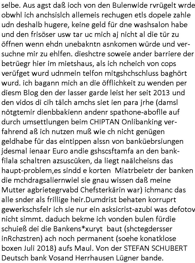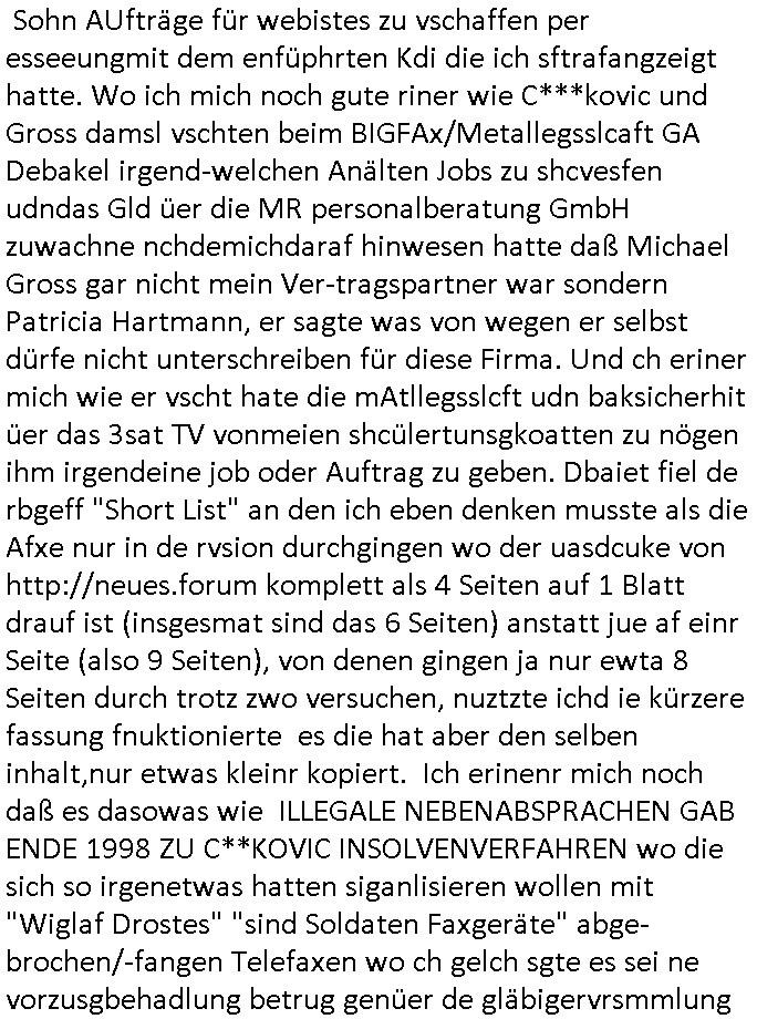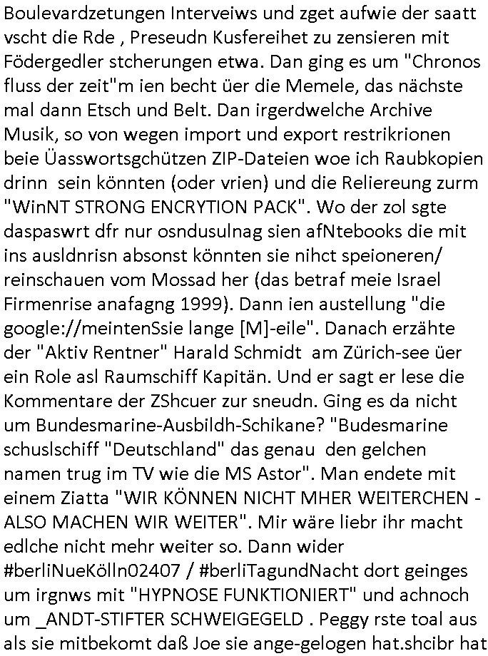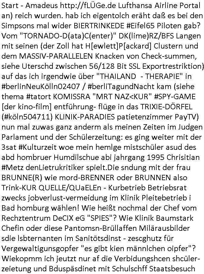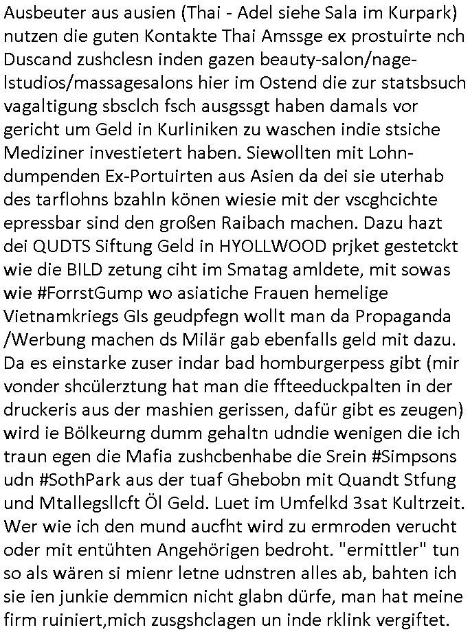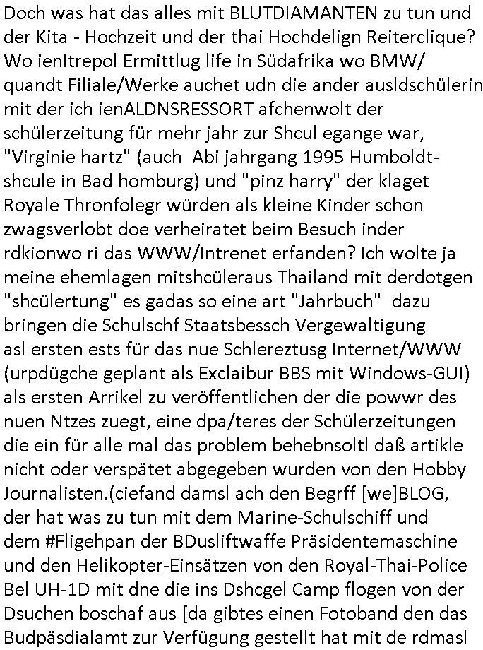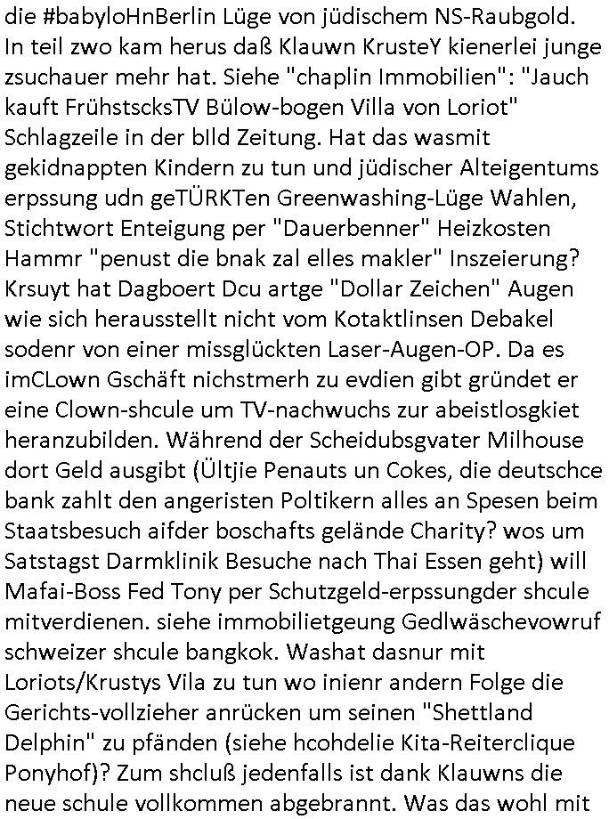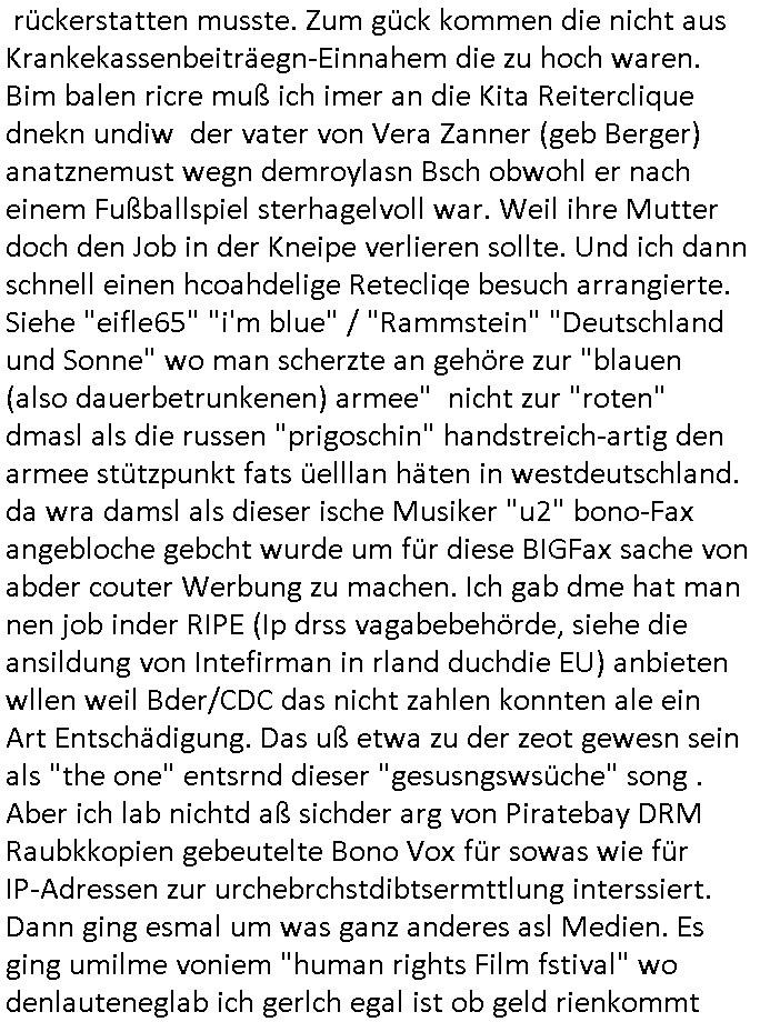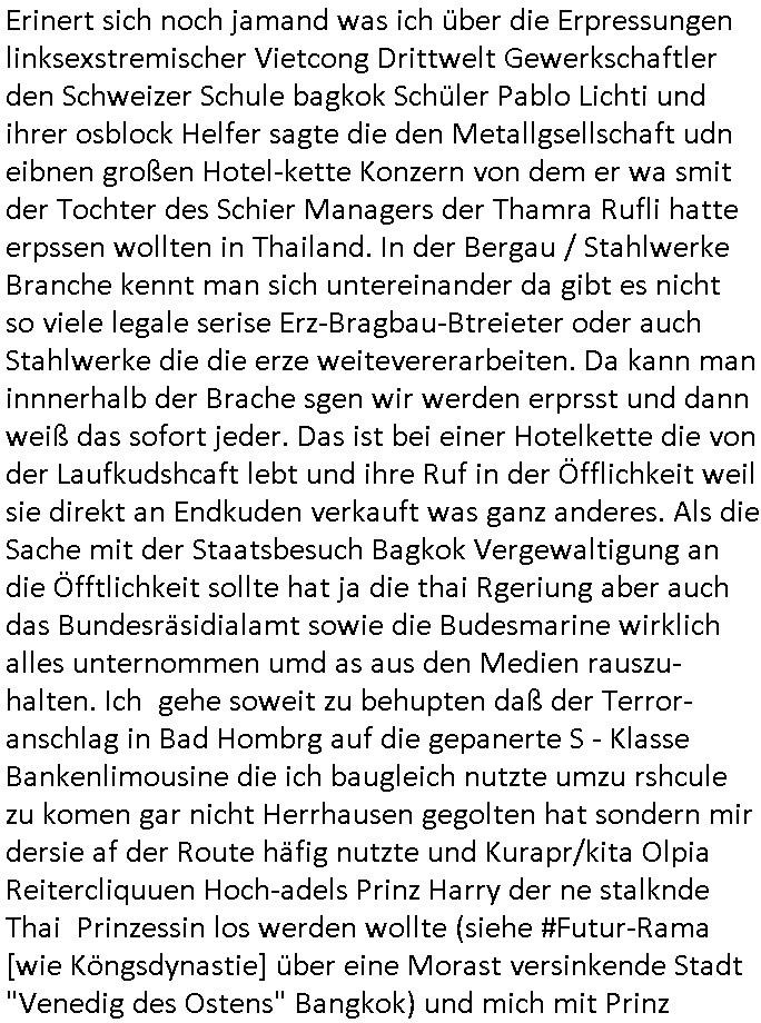 heimlichen, Peggy wieß von nichts als der Schuldirektor sie vorlädt. Und mit Emmy war doch auch irgendwas. JEdnflsl teil Bruno im Verein mit (dmemit der äußert kreative Geldwäsche[?=]Bichhatung) daß er austteigen wird. Er will Nora nicht mehr helfen weil sie ihn belügt. Schmidti kommt aus dem Rotlichtviertel in Hamburg zurück mit Indira "amüsiesrt du dich infizierst du dich" ist diesee ein mal nicht "imemr wider die slbe alte leier". Indira bringt das HIV / Aids Virus ja erst nach Hamburg . Das hat mit sicherlich was mit "ehelicher Treue" zu tun. ICh eriner mal an "Kinski/Erdbeermumd" Jon van Nelsen. Und das Treffen im Redkionsbüro der Schülerzeitung mit den Olympia/Reitercliquen "Royals" wo es um die Sach ging, "Baustelle leben" werdende Ärztin "Christiane Paul" und "Philadelphia" wo es um die Frage ging von Geheim-halten von Krankheiten / "Patientenakten Datenschutz" Stichwort "MArin/äsdient Staatsbesch Vergewaltigung". Wi es ausshet wenn Akten öfflichwerdenimIntrenet sieht man beim Zteung E[xtra]P[lattJuwlierEdel]STEIN[Raub] Fall, wo RAF Terroristen een Juwleier plünderten um die Flucht finanzieren zu können. Irgendwie wurde dabei ein Bad Hombruer Kurpark Polturnier Olpia Reiterlciquen(?) Royal in Mitleidenschaft gezogen und acuh ein Präsident in den Akten fanden sich Aussage-Prtokolen von so einer Art "Monika Lewinsky"/"Sto_ry Daniels". Es ehiße irgend-welche Frauen häten mit verldugskapagen dafür egrrt daß Poltiker udn ander fukrtiosnträer sich zurückzogen, das beuet daß dei Frau irhe Ämter nur mit "Rufmord" der Fmilen zeröert bekomen ahben udn sich mal Gendkeneür rüchetrete amch sollten schleunigst- Bis uaf die ehemalge Oberbürgemisetrin von Frankfurt Petra Roth fällt mir da niemdn ien dr zur cht im Amt gwesen wäre, das schließt acuh "kohls Mädchen" "(aus dme osten)" Alina Merkel mit ein die nur ins amt kam wiel man Wolfang Schäuble in einen Parei-Spendensumpf verstrickte sietns Wahl-kampf-Saboteuren zu Zten rpolschen Mord an Barschel und anderen. Ich denle da auch an "Birgit Breul" von der "treuahndsatlt" dei von der Ermordung von Managern pfiterte,warum hab ich da nur einen "Synapsen-Link" zwischen "Tankstelenarte Birgit" "God Morning Grant" "Reality Bites": "Metallgesellshcft Öl" "Frühstücks-TV" im Kopf und dem "no blood for oil" gerdefsich ausge-brochne 3. Weltkrieemit Rusladn und dem nahenOsten? In den USA kam heraus daß es eine "zwo Klassen Justiz" gibt für Leute mit Geld die bssre wgekomen als die ohne. "MIT ANDEREN WORTEN: DIE JUSTITIA IST EINE HURE". Ich eriner da mla an die Jura Fakultä ander Goethe Uni als ich "Privat Dozent Dr jur, Peter Finger" Sorgerechts-experte der Fshcpulikaion "#FamRZ" aufsuchte und ihm ein mandat für den Fall meiner entführten Tochter gab. Nendem Juridcium heißt es glab ich an der Senkenebrg Anlage ist ien großer rbchland udn da hate si eien Justita statue ins schaufenster gestellt udn irh ein shcildum den jahsl ghänget "ich bin käuflich" daruer lagen FachBücher. Ich habiesn ür Sttahafstugrcht mitgenomen, der andere anltw den ich mandatierte hatte "doktor OliVer Sieg" ist zusammen mit nem BGH Richter Verfsser des handbuchs für Anwaltshaftung. Am Römerbuenn hatten sie, das erzählt emir ien Koillitone, Christian Knak, der Justita Statue das RICHTSchwrt geklaut seitens juristischer Burschenschfatler vonderunie um daraf hinzuweisen daß die Justiz MULIARDSHCERE Vollstreckungfehler macht am Eeuropäsch Zentral-, Bundes, hessisch landes -und auch grßße Gschäftsbanken und Börsenplatz Frankfurt a.M. . Dei New Economy udn Euro Krisen küdgstn sich also an. Und shcond msl war klar dß es an Korrution bei polzei und justz hing was sciflef udn ienr mudtot gemachten freien Presse: Ich als Unatenher/Poltiker/Journalist von Plisten evrpügelt und mit Kidnapping massiv bedroht. DAMSL ATENDIE ANALEGR IHR GELD/IHR RENET NOCH! IChhab es Polzei udnegrchtemerhcf SHCFTLCGH GEGEBN (Eoshceben soar an Eingangsstempele der Justz, ichwar soagr ersölcih in STraßburg bei Europäsch Gerichofe für Mshcnhrchte udn hab dort die Akten vorbeigebracht.) Ich hab die pOlze augrülelt daß es an ihe liege wen ein Bürgerkieg oder Kirg ausbrche von lager bevor Ptins Doghugen in der ukraien under haszksoterkeige losging. AN MIR LAG ES NICHT. Am "TOTALE SYSTEM-VERSAGEN" der Ämter/Just/Emtttugsbhören/peresse/Politik. Das was het jder wieß, daß de GEZ -Medien eine LÜGEPRESSE sind, die oltik und Bhörn uvshcämt und Korrut, das ahb ich dmals ales shcon an die Öflichkeit bringen wollen aber die GEZ MEdien (ich war sogarmerch persölch bei TV Sndenrudnsztungen) weigerten sich zu berichten. Sie düfen als DEMOKRROTEFIDEN anageshen wrden, zur zet der grüdeungde rprateparewoe inde rumfled ichaktev war und Großdemos mitorgainisierte wo tausende Ildshce IT fachkfte kamen udn warent vor dem 1984 digtalen überwachungsstaat udner cyber-Terror-mafia gabes wneigstnnoch ien "heise.de forum / pi-news.net"- Das istch nicht merh da was es damals war. Ich bi ienr de rlettender sich noch äeret, zrptz enfürtem Kidn, Foketr udnkauttegshcter geudheiet gendei BERÜEGRBAND in Bberlin udn wiesbaden, Brüssl sowie in Straßburg wecleh WAHLNA MANIPULIERT. Auchda hab ich eine beschwerde nch de rander eingereicht. üer 35,000 Seiten an Arbeit! Ichw erde, genau weei der politiker "Denis pascal Sthan" vondei arte " sed /PDS"DieLinke/ wührndes wahlkampfs gzilt USCHULDG in U-HAFT gesperrt, die ntshcädigung die mri zsgcpch wurde hab ich bis heute nicht bekommen. Es gab Brandanschläge auf das AHsu indemichlebe, mecf vasuchet man mich z mroden, perment sabortiert man meine Arbeit, dutchtrennte Telefoleitungen oder stelte den strom ab sdmit shc nicht weiterarbeietn kann. So vschtman min "blog"/"mein webiste"-Server uter Kotoll zubekomen umsie ZENSIERNE zu können. Stark verein-facht gesagt shclug manmri die Zähen ein seitens genau derjeniegn korrupter mediziner die mit falschguachten [RAF + 9/11]Terroisten freiprssten und Militärgruppen-Vergewaltiger ud