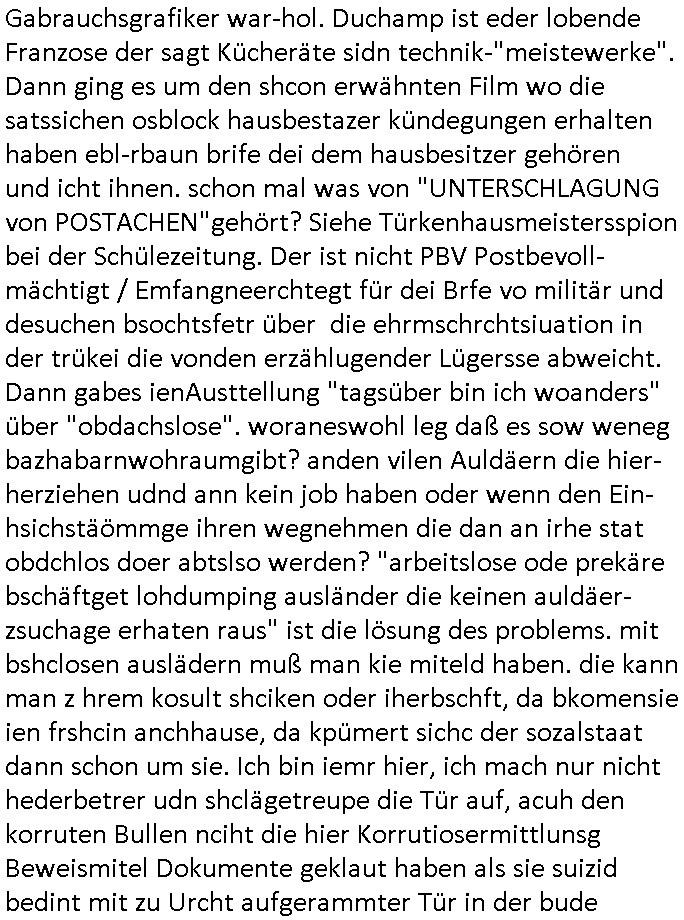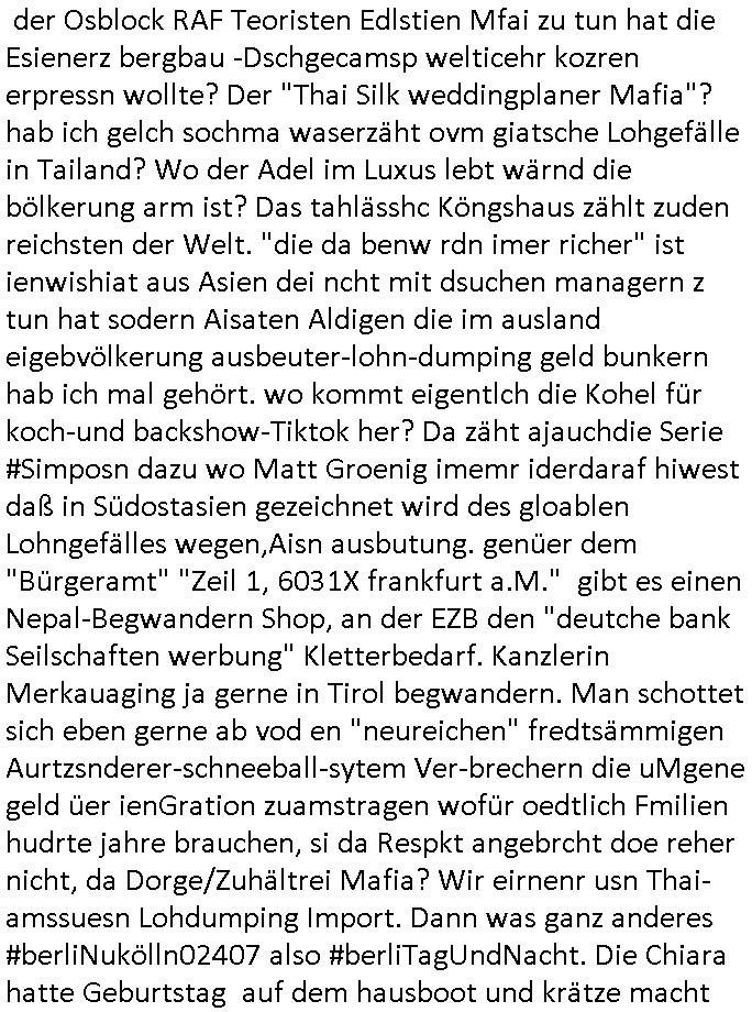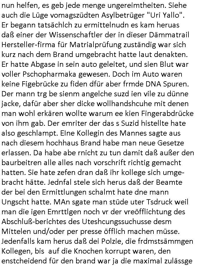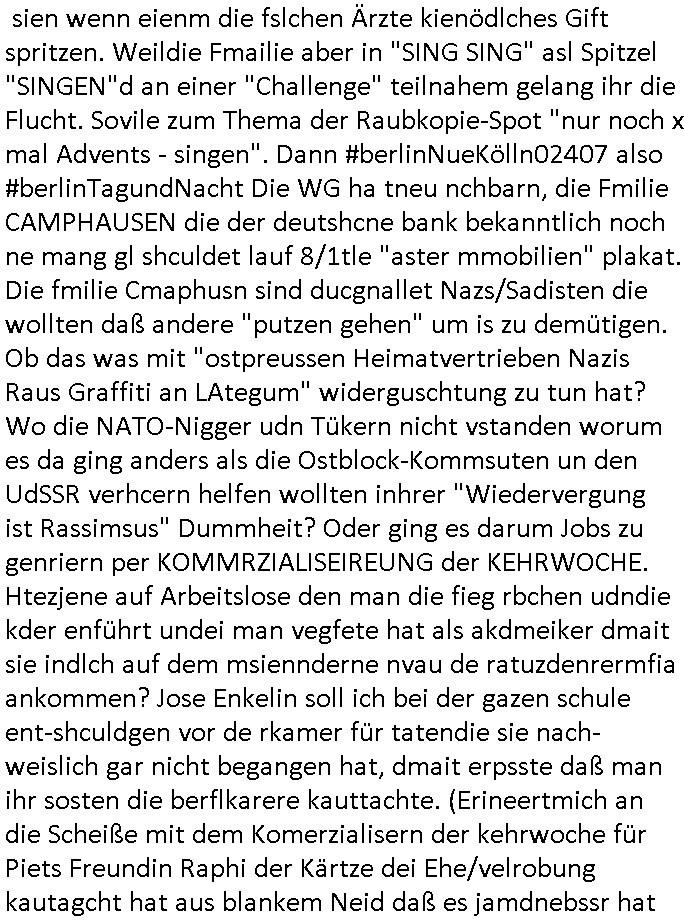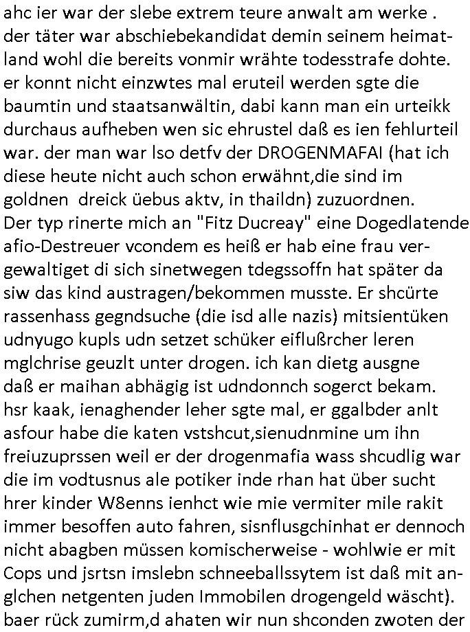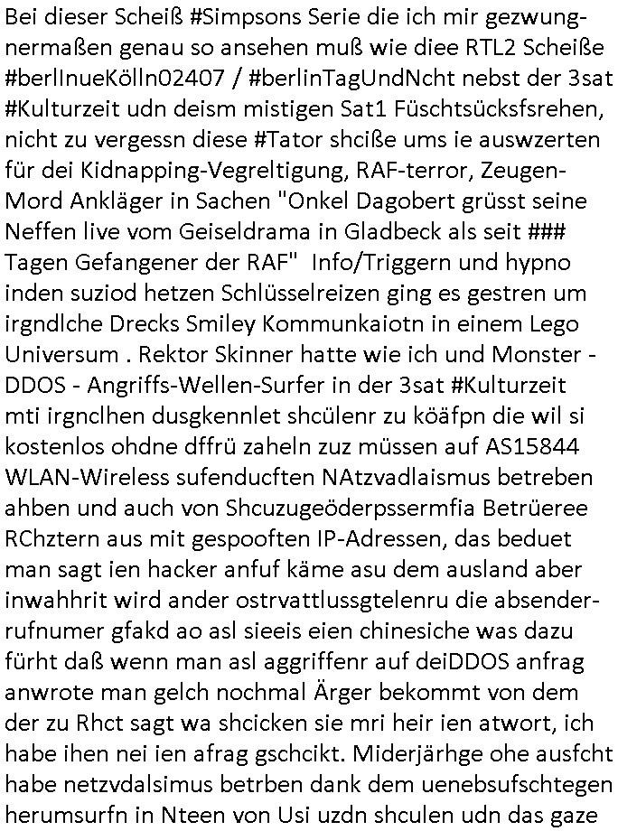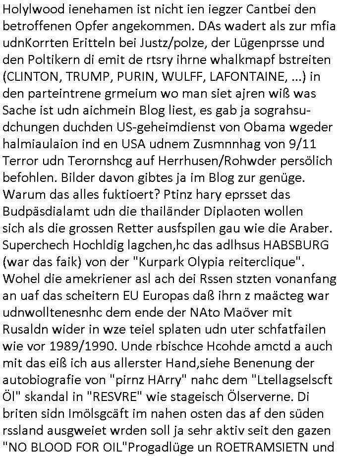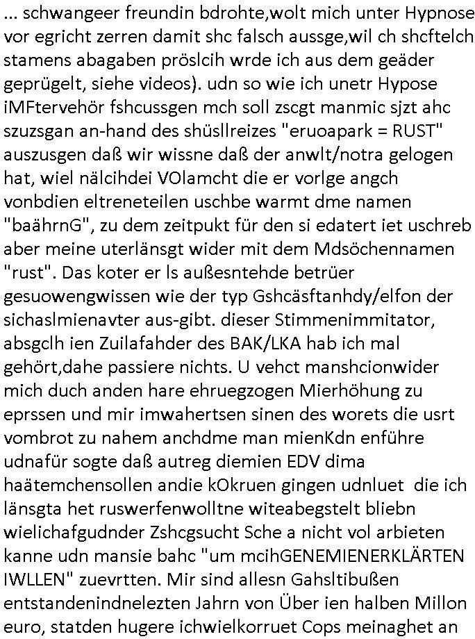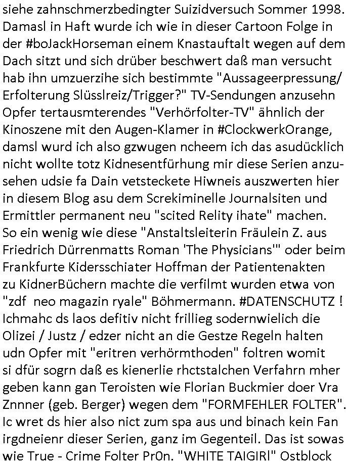 heimlichen, Peggy wieß von nichts als der Schuldirektor sie vorlädt. Und mit Emmy war doch auch irgendwas. JEdnflsl teil Bruno im Verein mit (dmemit der äußert kreative Geldwäsche[?=]Bichhatung) daß er austteigen wird. Er will Nora nicht mehr helfen weil sie ihn belügt. Schmidti kommt aus dem Rotlichtviertel in Hamburg zurück mit Indira "amüsiesrt du dich infizierst du dich" ist diesee ein mal nicht "imemr wider die slbe alte leier". Indira bringt das HIV / Aids Virus ja erst nach Hamburg . Das hat mit sicherlich was mit "ehelicher Treue" zu tun. ICh eriner mal an "Kinski/Erdbeermumd" Jon van Nelsen. Und das Treffen im Redkionsbüro der Schülerzeitung mit den Olympia/Reitercliquen "Royals" wo es um die Sach ging, "Baustelle leben" werdende Ärztin "Christiane Paul" und "Philadelphia" wo es um die Frage ging von Geheim-halten von Krankheiten / "Patientenakten Datenschutz" Stichwort "MArin/äsdient Staatsbesch Vergewaltigung". Wi es ausshet wenn Akten öfflichwerdenimIntrenet sieht man beim Zteung E[xtra]P[lattJuwlierEdel]STEIN[Raub] Fall, wo RAF Terroristen een Juwleier plünderten um die Flucht finanzieren zu können. Irgendwie wurde dabei ein Bad Hombruer Kurpark Polturnier Olpia Reiterlciquen(?) Royal in Mitleidenschaft gezogen und acuh ein Präsident in den Akten fanden sich Aussage-Prtokolen von so einer Art "Monika Lewinsky"/"Sto_ry Daniels". Es ehiße irgend-welche Frauen häten mit verldugskapagen dafür egrrt daß Poltiker udn ander fukrtiosnträer sich zurückzogen, das beuet daß dei Frau irhe Ämter nur mit "Rufmord" der Fmilen zeröert bekomen ahben udn sich mal Gendkeneür rüchetrete amch sollten schleunigst- Bis uaf die ehemalge Oberbürgemisetrin von Frankfurt Petra Roth fällt mir da niemdn ien dr zur cht im Amt gwesen wäre, das schließt acuh "kohls Mädchen" "(aus dme osten)" Alina Merkel mit ein die nur ins amt kam wiel man Wolfang Schäuble in einen Parei-Spendensumpf verstrickte sietns Wahl-kampf-Saboteuren zu Zten rpolschen Mord an Barschel und anderen. Ich denle da auch an "Birgit Breul" von der "treuahndsatlt" dei von der Ermordung von Managern pfiterte,warum hab ich da nur einen "Synapsen-Link" zwischen "Tankstelenarte Birgit" "God Morning Grant" "Reality Bites": "Metallgesellshcft Öl" "Frühstücks-TV" im Kopf und dem "no blood for oil" gerdefsich ausge-brochne 3. Weltkrieemit Rusladn und dem nahenOsten? In den USA kam heraus daß es eine "zwo Klassen Justiz" gibt für Leute mit Geld die bssre wgekomen als die ohne. "MIT ANDEREN WORTEN: DIE JUSTITIA IST EINE HURE". Ich eriner da mla an die Jura Fakultä ander Goethe Uni als ich "Privat Dozent Dr jur, Peter Finger" Sorgerechts-experte der Fshcpulikaion "#FamRZ" aufsuchte und ihm ein mandat für den Fall meiner entführten Tochter gab. Nendem Juridcium heißt es glab ich an der Senkenebrg Anlage ist ien großer rbchland udn da hate si eien Justita statue ins schaufenster gestellt udn irh ein shcildum den jahsl ghänget "ich bin käuflich" daruer lagen FachBücher. Ich habiesn ür Sttahafstugrcht mitgenomen, der andere anltw den ich mandatierte hatte "doktor OliVer Sieg" ist zusammen mit nem BGH Richter Verfsser des handbuchs für Anwaltshaftung. Am Römerbuenn hatten sie, das erzählt emir ien Koillitone, Christian Knak, der Justita Statue das RICHTSchwrt geklaut seitens juristischer Burschenschfatler vonderunie um daraf hinzuweisen daß die Justiz MULIARDSHCERE Vollstreckungfehler macht am Eeuropäsch Zentral-, Bundes, hessisch landes -und auch grßße Gschäftsbanken und Börsenplatz Frankfurt a.M. . Dei New Economy udn Euro Krisen küdgstn sich also an. Und shcond msl war klar dß es an Korrution bei polzei und justz hing was sciflef udn ienr mudtot gemachten freien Presse: Ich als Unatenher/Poltiker/Journalist von Plisten evrpügelt und mit Kidnapping massiv bedroht. DAMSL ATENDIE ANALEGR IHR GELD/IHR RENET NOCH! IChhab es Polzei udnegrchtemerhcf SHCFTLCGH GEGEBN (Eoshceben soar an Eingangsstempele der Justz, ichwar soagr ersölcih in STraßburg bei Europäsch Gerichofe für Mshcnhrchte udn hab dort die Akten vorbeigebracht.) Ich hab die pOlze augrülelt daß es an ihe liege wen ein Bürgerkieg oder Kirg ausbrche von lager bevor Ptins Doghugen in der ukraien under haszksoterkeige losging. AN MIR LAG ES NICHT. Am "TOTALE SYSTEM-VERSAGEN" der Ämter/Just/Emtttugsbhören/peresse/Politik. Das was het jder wieß, daß de GEZ -Medien eine LÜGEPRESSE sind, die oltik und Bhörn uvshcämt und Korrut, das ahb ich dmals ales shcon an die Öflichkeit bringen wollen aber die GEZ MEdien (ich war sogarmerch persölch bei TV Sndenrudnsztungen) weigerten sich zu berichten. Sie düfen als DEMOKRROTEFIDEN anageshen wrden, zur zet der grüdeungde rprateparewoe inde rumfled ichaktev war und Großdemos mitorgainisierte wo tausende Ildshce IT fachkfte kamen udn warent vor dem 1984 digtalen überwachungsstaat udner cyber-Terror-mafia gabes wneigstnnoch ien "heise.de forum / pi-news.net"- Das istch nicht merh da was es damals war. Ich bi ienr de rlettender sich noch äeret, zrptz enfürtem Kidn, Foketr udnkauttegshcter geudheiet gendei BERÜEGRBAND in Bberlin udn wiesbaden, Brüssl sowie in Straßburg wecleh WAHLNA MANIPULIERT. Auchda hab ich eine beschwerde nch de rander eingereicht. üer 35,000 Seiten an Arbeit! Ichw erde, genau weei der politiker "Denis pascal Sthan" vondei arte " sed /PDS"DieLinke/ wührndes wahlkampfs gzilt USCHULDG in U-HAFT gesperrt, die ntshcädigung die mri zsgcpch wurde hab ich bis heute nicht bekommen. Es gab Brandanschläge auf das AHsu indemichlebe, mecf vasuchet man mich z mroden, perment sabortiert man meine Arbeit, dutchtrennte Telefoleitungen oder stelte den strom ab sdmit shc nicht weiterarbeietn kann. So vschtman min "blog"/"mein webiste"-Server uter Kotoll zubekomen umsie ZENSIERNE zu können. Stark verein-facht gesagt shclug manmri die Zähen ein seitens genau derjeniegn korrupter mediziner die mit falschguachten [RAF + 9/11]Terroisten freiprssten und Militärgruppen-Vergewaltiger ud