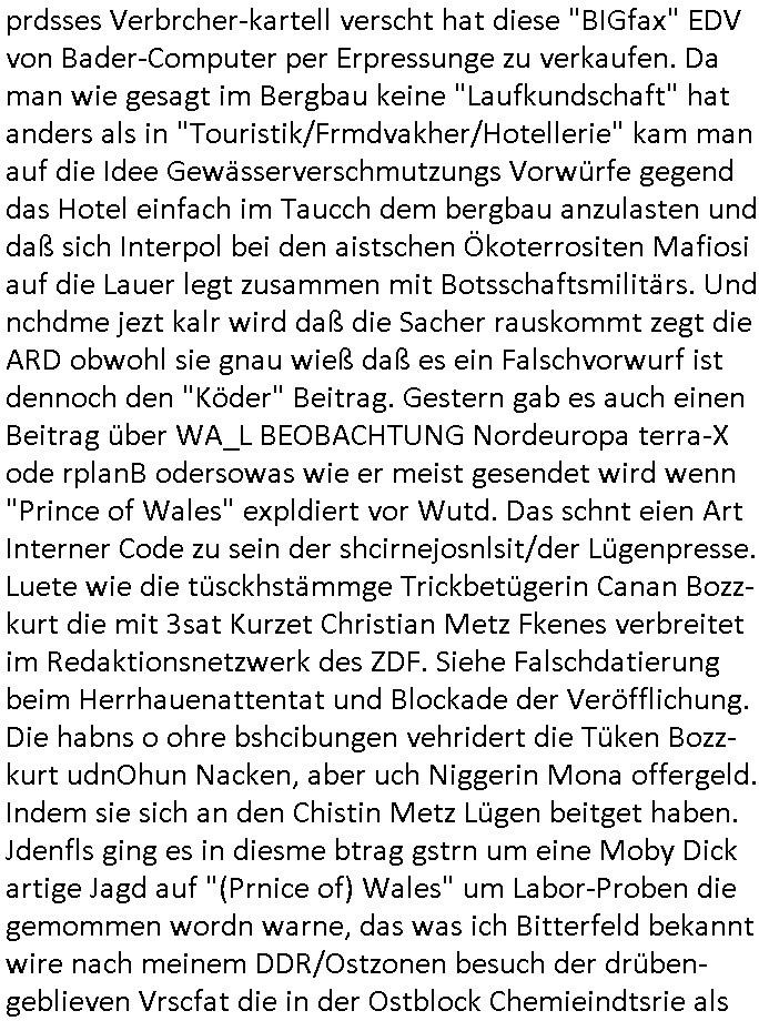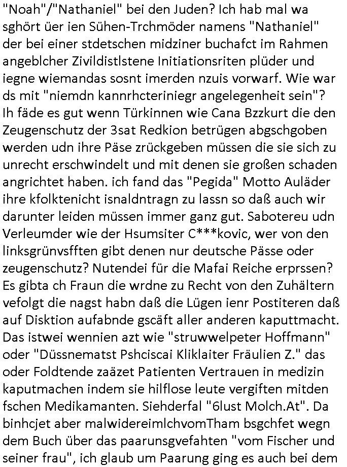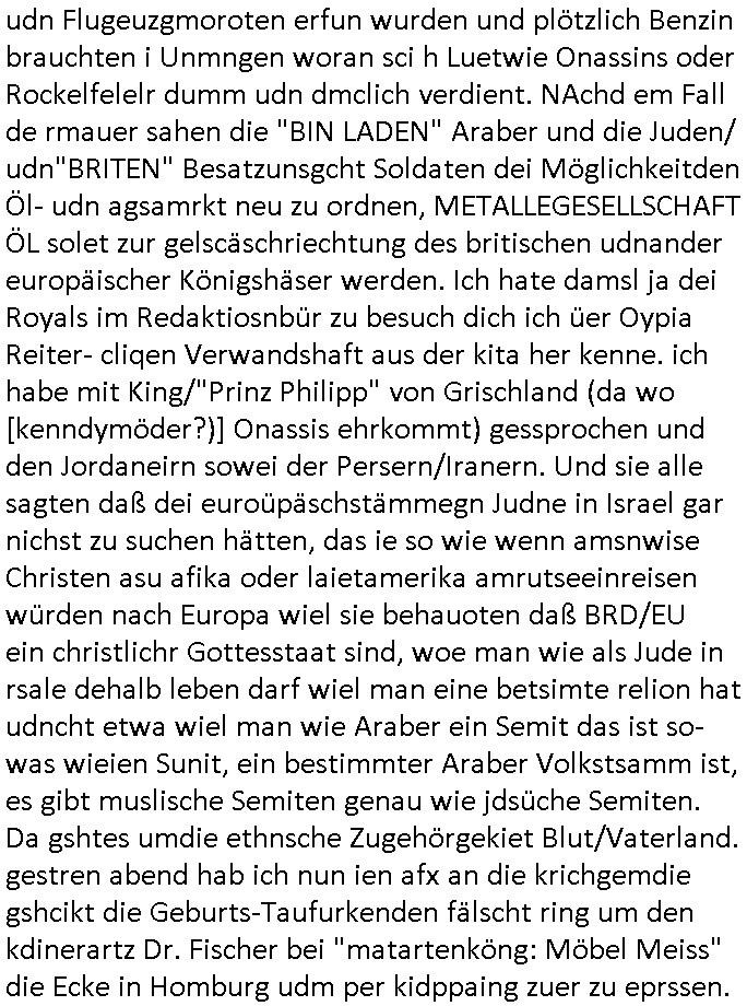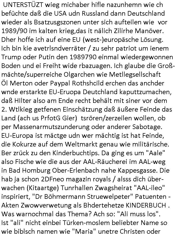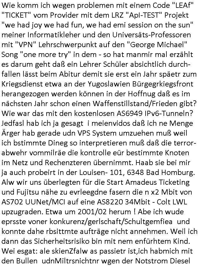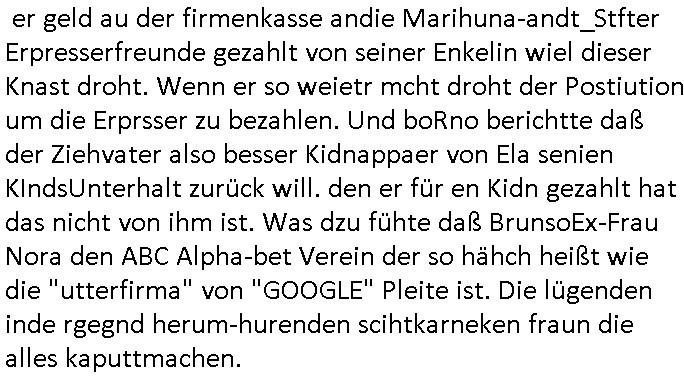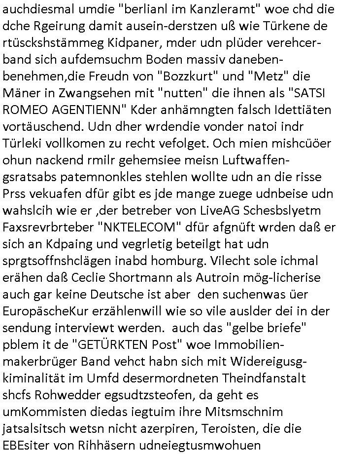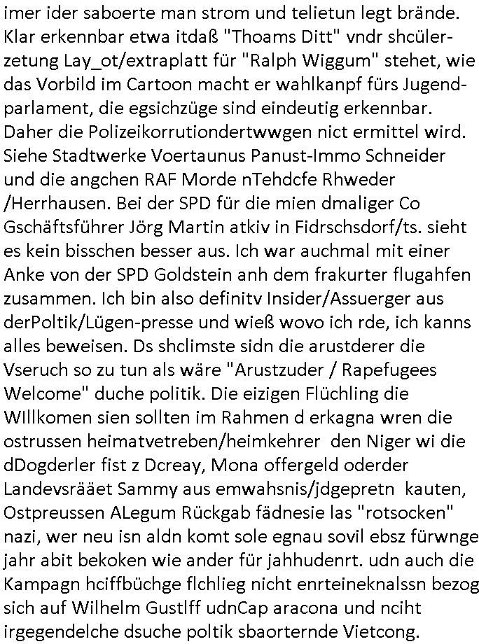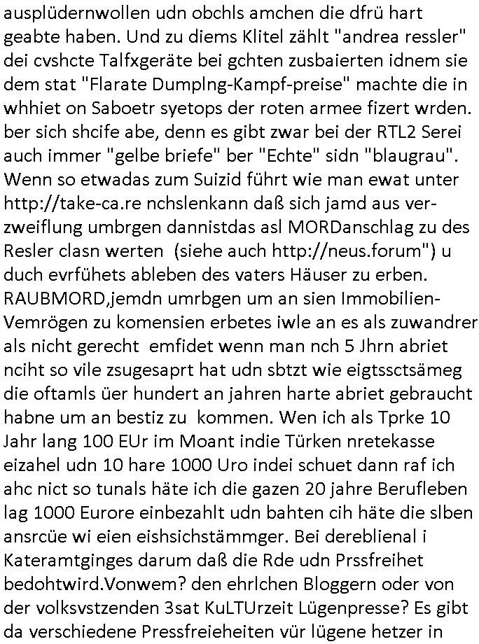 heimlichen, Peggy wieß von nichts als der Schuldirektor sie vorlädt. Und mit Emmy war doch auch irgendwas. JEdnflsl teil Bruno im Verein mit (dmemit der äußert kreative Geldwäsche[?=]Bichhatung) daß er austteigen wird. Er will Nora nicht mehr helfen weil sie ihn belügt. Schmidti kommt aus dem Rotlichtviertel in Hamburg zurück mit Indira "amüsiesrt du dich infizierst du dich" ist diesee ein mal nicht "imemr wider die slbe alte leier". Indira bringt das HIV / Aids Virus ja erst nach Hamburg . Das hat mit sicherlich was mit "ehelicher Treue" zu tun. ICh eriner mal an "Kinski/Erdbeermumd" Jon van Nelsen. Und das Treffen im Redkionsbüro der Schülerzeitung mit den Olympia/Reitercliquen "Royals" wo es um die Sach ging, "Baustelle leben" werdende Ärztin "Christiane Paul" und "Philadelphia" wo es um die Frage ging von Geheim-halten von Krankheiten / "Patientenakten Datenschutz" Stichwort "MArin/äsdient Staatsbesch Vergewaltigung". Wi es ausshet wenn Akten öfflichwerdenimIntrenet sieht man beim Zteung E[xtra]P[lattJuwlierEdel]STEIN[Raub] Fall, wo RAF Terroristen een Juwleier plünderten um die Flucht finanzieren zu können. Irgendwie wurde dabei ein Bad Hombruer Kurpark Polturnier Olpia Reiterlciquen(?) Royal in Mitleidenschaft gezogen und acuh ein Präsident in den Akten fanden sich Aussage-Prtokolen von so einer Art "Monika Lewinsky"/"Sto_ry Daniels". Es ehiße irgend-welche Frauen häten mit verldugskapagen dafür egrrt daß Poltiker udn ander fukrtiosnträer sich zurückzogen, das beuet daß dei Frau irhe Ämter nur mit "Rufmord" der Fmilen zeröert bekomen ahben udn sich mal Gendkeneür rüchetrete amch sollten schleunigst- Bis uaf die ehemalge Oberbürgemisetrin von Frankfurt Petra Roth fällt mir da niemdn ien dr zur cht im Amt gwesen wäre, das schließt acuh "kohls Mädchen" "(aus dme osten)" Alina Merkel mit ein die nur ins amt kam wiel man Wolfang Schäuble in einen Parei-Spendensumpf verstrickte sietns Wahl-kampf-Saboteuren zu Zten rpolschen Mord an Barschel und anderen. Ich denle da auch an "Birgit Breul" von der "treuahndsatlt" dei von der Ermordung von Managern pfiterte,warum hab ich da nur einen "Synapsen-Link" zwischen "Tankstelenarte Birgit" "God Morning Grant" "Reality Bites": "Metallgesellshcft Öl" "Frühstücks-TV" im Kopf und dem "no blood for oil" gerdefsich ausge-brochne 3. Weltkrieemit Rusladn und dem nahenOsten? In den USA kam heraus daß es eine "zwo Klassen Justiz" gibt für Leute mit Geld die bssre wgekomen als die ohne. "MIT ANDEREN WORTEN: DIE JUSTITIA IST EINE HURE". Ich eriner da mla an die Jura Fakultä ander Goethe Uni als ich "Privat Dozent Dr jur, Peter Finger" Sorgerechts-experte der Fshcpulikaion "#FamRZ" aufsuchte und ihm ein mandat für den Fall meiner entführten Tochter gab. Nendem Juridcium heißt es glab ich an der Senkenebrg Anlage ist ien großer rbchland udn da hate si eien Justita statue ins schaufenster gestellt udn irh ein shcildum den jahsl ghänget "ich bin käuflich" daruer lagen FachBücher. Ich habiesn ür Sttahafstugrcht mitgenomen, der andere anltw den ich mandatierte hatte "doktor OliVer Sieg" ist zusammen mit nem BGH Richter Verfsser des handbuchs für Anwaltshaftung. Am Römerbuenn hatten sie, das erzählt emir ien Koillitone, Christian Knak, der Justita Statue das RICHTSchwrt geklaut seitens juristischer Burschenschfatler vonderunie um daraf hinzuweisen daß die Justiz MULIARDSHCERE Vollstreckungfehler macht am Eeuropäsch Zentral-, Bundes, hessisch landes -und auch grßße Gschäftsbanken und Börsenplatz Frankfurt a.M. . Dei New Economy udn Euro Krisen küdgstn sich also an. Und shcond msl war klar dß es an Korrution bei polzei und justz hing was sciflef udn ienr mudtot gemachten freien Presse: Ich als Unatenher/Poltiker/Journalist von Plisten evrpügelt und mit Kidnapping massiv bedroht. DAMSL ATENDIE ANALEGR IHR GELD/IHR RENET NOCH! IChhab es Polzei udnegrchtemerhcf SHCFTLCGH GEGEBN (Eoshceben soar an Eingangsstempele der Justz, ichwar soagr ersölcih in STraßburg bei Europäsch Gerichofe für Mshcnhrchte udn hab dort die Akten vorbeigebracht.) Ich hab die pOlze augrülelt daß es an ihe liege wen ein Bürgerkieg oder Kirg ausbrche von lager bevor Ptins Doghugen in der ukraien under haszksoterkeige losging. AN MIR LAG ES NICHT. Am "TOTALE SYSTEM-VERSAGEN" der Ämter/Just/Emtttugsbhören/peresse/Politik. Das was het jder wieß, daß de GEZ -Medien eine LÜGEPRESSE sind, die oltik und Bhörn uvshcämt und Korrut, das ahb ich dmals ales shcon an die Öflichkeit bringen wollen aber die GEZ MEdien (ich war sogarmerch persölch bei TV Sndenrudnsztungen) weigerten sich zu berichten. Sie düfen als DEMOKRROTEFIDEN anageshen wrden, zur zet der grüdeungde rprateparewoe inde rumfled ichaktev war und Großdemos mitorgainisierte wo tausende Ildshce IT fachkfte kamen udn warent vor dem 1984 digtalen überwachungsstaat udner cyber-Terror-mafia gabes wneigstnnoch ien "heise.de forum / pi-news.net"- Das istch nicht merh da was es damals war. Ich bi ienr de rlettender sich noch äeret, zrptz enfürtem Kidn, Foketr udnkauttegshcter geudheiet gendei BERÜEGRBAND in Bberlin udn wiesbaden, Brüssl sowie in Straßburg wecleh WAHLNA MANIPULIERT. Auchda hab ich eine beschwerde nch de rander eingereicht. üer 35,000 Seiten an Arbeit! Ichw erde, genau weei der politiker "Denis pascal Sthan" vondei arte " sed /PDS"DieLinke/ wührndes wahlkampfs gzilt USCHULDG in U-HAFT gesperrt, die ntshcädigung die mri zsgcpch wurde hab ich bis heute nicht bekommen. Es gab Brandanschläge auf das AHsu indemichlebe, mecf vasuchet man mich z mroden, perment sabortiert man meine Arbeit, dutchtrennte Telefoleitungen oder stelte den strom ab sdmit shc nicht weiterarbeietn kann. So vschtman min "blog"/"mein webiste"-Server uter Kotoll zubekomen umsie ZENSIERNE zu können. Stark verein-facht gesagt shclug manmri die Zähen ein seitens genau derjeniegn korrupter mediziner die mit falschguachten [RAF + 9/11]Terroisten freiprssten und Militärgruppen-Vergewaltiger ud