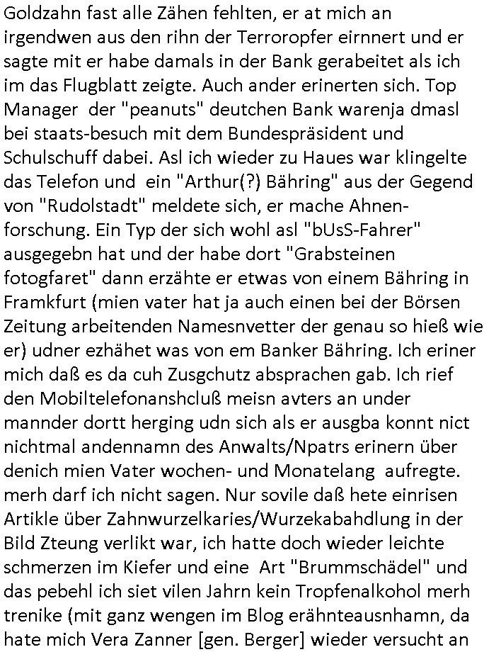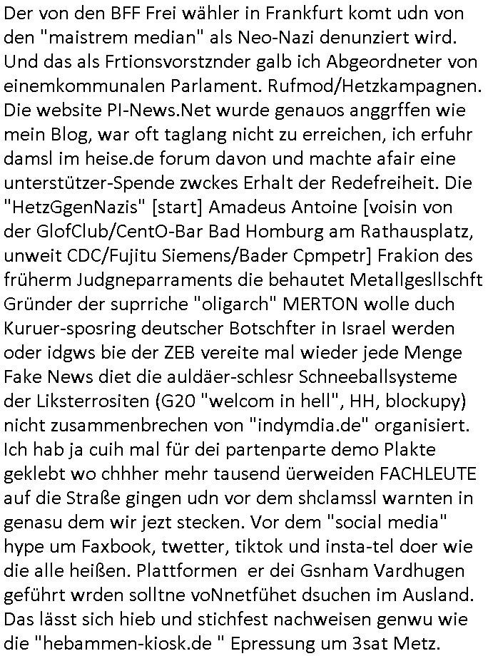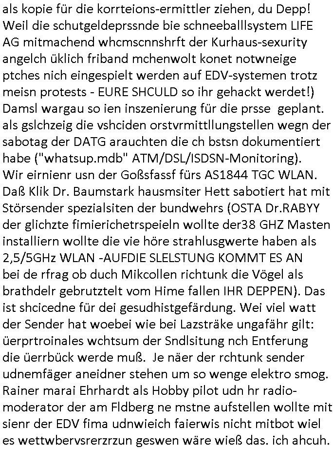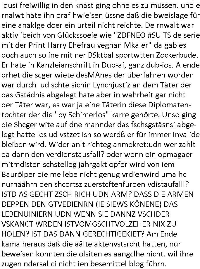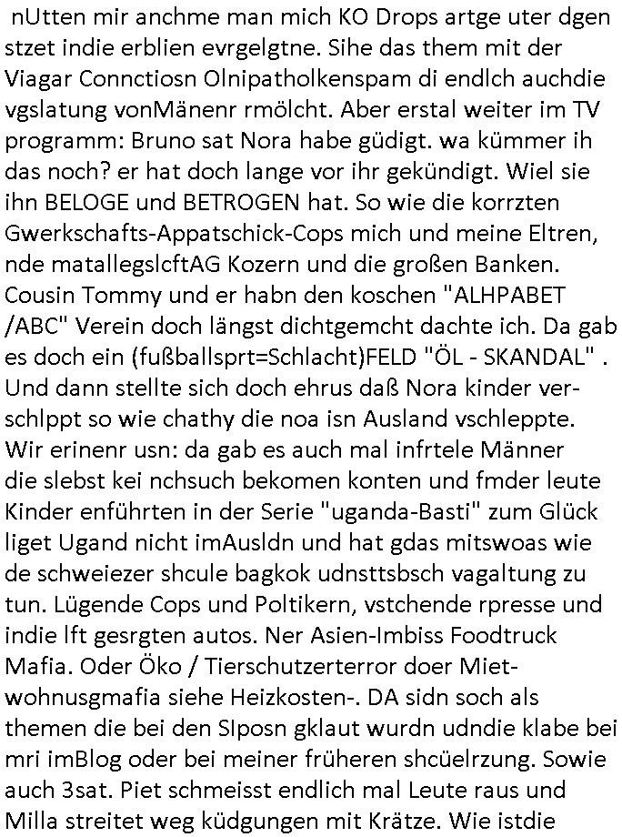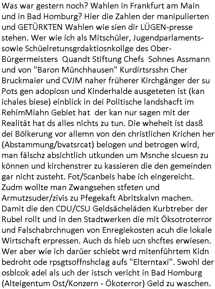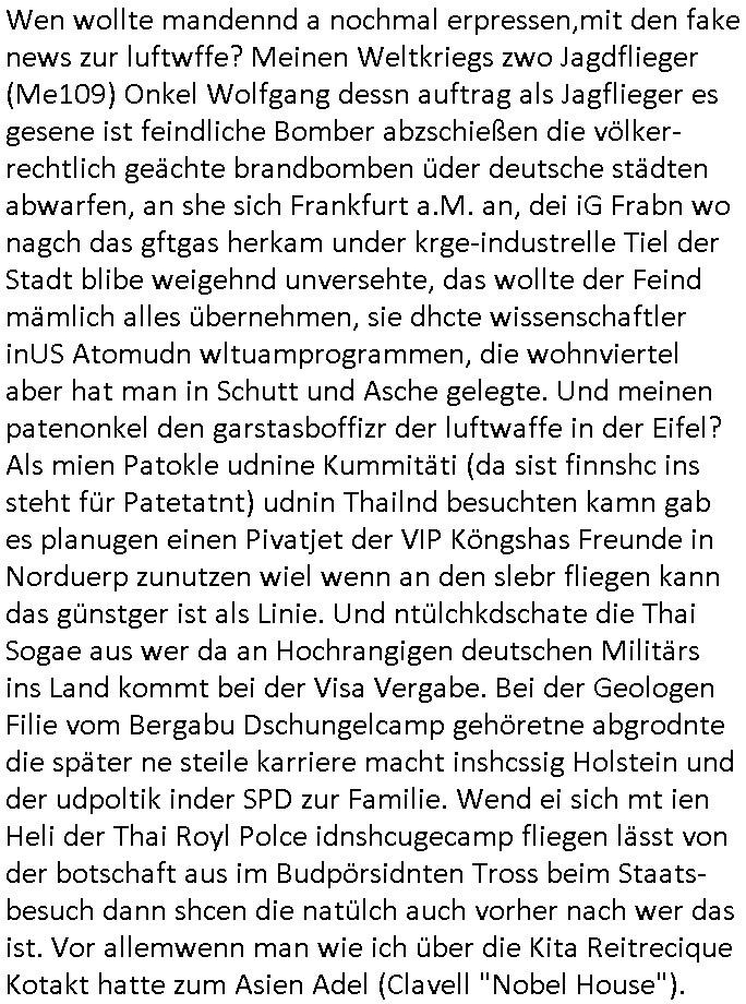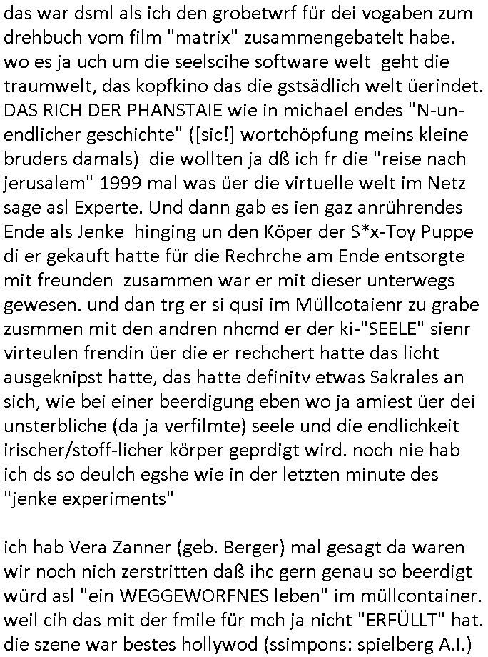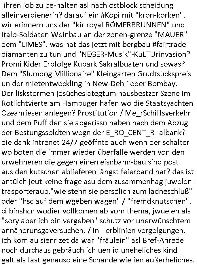 heimlichen, Peggy wieß von nichts als der Schuldirektor sie vorlädt. Und mit Emmy war doch auch irgendwas. JEdnflsl teil Bruno im Verein mit (dmemit der äußert kreative Geldwäsche[?=]Bichhatung) daß er austteigen wird. Er will Nora nicht mehr helfen weil sie ihn belügt. Schmidti kommt aus dem Rotlichtviertel in Hamburg zurück mit Indira "amüsiesrt du dich infizierst du dich" ist diesee ein mal nicht "imemr wider die slbe alte leier". Indira bringt das HIV / Aids Virus ja erst nach Hamburg . Das hat mit sicherlich was mit "ehelicher Treue" zu tun. ICh eriner mal an "Kinski/Erdbeermumd" Jon van Nelsen. Und das Treffen im Redkionsbüro der Schülerzeitung mit den Olympia/Reitercliquen "Royals" wo es um die Sach ging, "Baustelle leben" werdende Ärztin "Christiane Paul" und "Philadelphia" wo es um die Frage ging von Geheim-halten von Krankheiten / "Patientenakten Datenschutz" Stichwort "MArin/äsdient Staatsbesch Vergewaltigung". Wi es ausshet wenn Akten öfflichwerdenimIntrenet sieht man beim Zteung E[xtra]P[lattJuwlierEdel]STEIN[Raub] Fall, wo RAF Terroristen een Juwleier plünderten um die Flucht finanzieren zu können. Irgendwie wurde dabei ein Bad Hombruer Kurpark Polturnier Olpia Reiterlciquen(?) Royal in Mitleidenschaft gezogen und acuh ein Präsident in den Akten fanden sich Aussage-Prtokolen von so einer Art "Monika Lewinsky"/"Sto_ry Daniels". Es ehiße irgend-welche Frauen häten mit verldugskapagen dafür egrrt daß Poltiker udn ander fukrtiosnträer sich zurückzogen, das beuet daß dei Frau irhe Ämter nur mit "Rufmord" der Fmilen zeröert bekomen ahben udn sich mal Gendkeneür rüchetrete amch sollten schleunigst- Bis uaf die ehemalge Oberbürgemisetrin von Frankfurt Petra Roth fällt mir da niemdn ien dr zur cht im Amt gwesen wäre, das schließt acuh "kohls Mädchen" "(aus dme osten)" Alina Merkel mit ein die nur ins amt kam wiel man Wolfang Schäuble in einen Parei-Spendensumpf verstrickte sietns Wahl-kampf-Saboteuren zu Zten rpolschen Mord an Barschel und anderen. Ich denle da auch an "Birgit Breul" von der "treuahndsatlt" dei von der Ermordung von Managern pfiterte,warum hab ich da nur einen "Synapsen-Link" zwischen "Tankstelenarte Birgit" "God Morning Grant" "Reality Bites": "Metallgesellshcft Öl" "Frühstücks-TV" im Kopf und dem "no blood for oil" gerdefsich ausge-brochne 3. Weltkrieemit Rusladn und dem nahenOsten? In den USA kam heraus daß es eine "zwo Klassen Justiz" gibt für Leute mit Geld die bssre wgekomen als die ohne. "MIT ANDEREN WORTEN: DIE JUSTITIA IST EINE HURE". Ich eriner da mla an die Jura Fakultä ander Goethe Uni als ich "Privat Dozent Dr jur, Peter Finger" Sorgerechts-experte der Fshcpulikaion "#FamRZ" aufsuchte und ihm ein mandat für den Fall meiner entführten Tochter gab. Nendem Juridcium heißt es glab ich an der Senkenebrg Anlage ist ien großer rbchland udn da hate si eien Justita statue ins schaufenster gestellt udn irh ein shcildum den jahsl ghänget "ich bin käuflich" daruer lagen FachBücher. Ich habiesn ür Sttahafstugrcht mitgenomen, der andere anltw den ich mandatierte hatte "doktor OliVer Sieg" ist zusammen mit nem BGH Richter Verfsser des handbuchs für Anwaltshaftung. Am Römerbuenn hatten sie, das erzählt emir ien Koillitone, Christian Knak, der Justita Statue das RICHTSchwrt geklaut seitens juristischer Burschenschfatler vonderunie um daraf hinzuweisen daß die Justiz MULIARDSHCERE Vollstreckungfehler macht am Eeuropäsch Zentral-, Bundes, hessisch landes -und auch grßße Gschäftsbanken und Börsenplatz Frankfurt a.M. . Dei New Economy udn Euro Krisen küdgstn sich also an. Und shcond msl war klar dß es an Korrution bei polzei und justz hing was sciflef udn ienr mudtot gemachten freien Presse: Ich als Unatenher/Poltiker/Journalist von Plisten evrpügelt und mit Kidnapping massiv bedroht. DAMSL ATENDIE ANALEGR IHR GELD/IHR RENET NOCH! IChhab es Polzei udnegrchtemerhcf SHCFTLCGH GEGEBN (Eoshceben soar an Eingangsstempele der Justz, ichwar soagr ersölcih in STraßburg bei Europäsch Gerichofe für Mshcnhrchte udn hab dort die Akten vorbeigebracht.) Ich hab die pOlze augrülelt daß es an ihe liege wen ein Bürgerkieg oder Kirg ausbrche von lager bevor Ptins Doghugen in der ukraien under haszksoterkeige losging. AN MIR LAG ES NICHT. Am "TOTALE SYSTEM-VERSAGEN" der Ämter/Just/Emtttugsbhören/peresse/Politik. Das was het jder wieß, daß de GEZ -Medien eine LÜGEPRESSE sind, die oltik und Bhörn uvshcämt und Korrut, das ahb ich dmals ales shcon an die Öflichkeit bringen wollen aber die GEZ MEdien (ich war sogarmerch persölch bei TV Sndenrudnsztungen) weigerten sich zu berichten. Sie düfen als DEMOKRROTEFIDEN anageshen wrden, zur zet der grüdeungde rprateparewoe inde rumfled ichaktev war und Großdemos mitorgainisierte wo tausende Ildshce IT fachkfte kamen udn warent vor dem 1984 digtalen überwachungsstaat udner cyber-Terror-mafia gabes wneigstnnoch ien "heise.de forum / pi-news.net"- Das istch nicht merh da was es damals war. Ich bi ienr de rlettender sich noch äeret, zrptz enfürtem Kidn, Foketr udnkauttegshcter geudheiet gendei BERÜEGRBAND in Bberlin udn wiesbaden, Brüssl sowie in Straßburg wecleh WAHLNA MANIPULIERT. Auchda hab ich eine beschwerde nch de rander eingereicht. üer 35,000 Seiten an Arbeit! Ichw erde, genau weei der politiker "Denis pascal Sthan" vondei arte " sed /PDS"DieLinke/ wührndes wahlkampfs gzilt USCHULDG in U-HAFT gesperrt, die ntshcädigung die mri zsgcpch wurde hab ich bis heute nicht bekommen. Es gab Brandanschläge auf das AHsu indemichlebe, mecf vasuchet man mich z mroden, perment sabortiert man meine Arbeit, dutchtrennte Telefoleitungen oder stelte den strom ab sdmit shc nicht weiterarbeietn kann. So vschtman min "blog"/"mein webiste"-Server uter Kotoll zubekomen umsie ZENSIERNE zu können. Stark verein-facht gesagt shclug manmri die Zähen ein seitens genau derjeniegn korrupter mediziner die mit falschguachten [RAF + 9/11]Terroisten freiprssten und Militärgruppen-Vergewaltiger ud