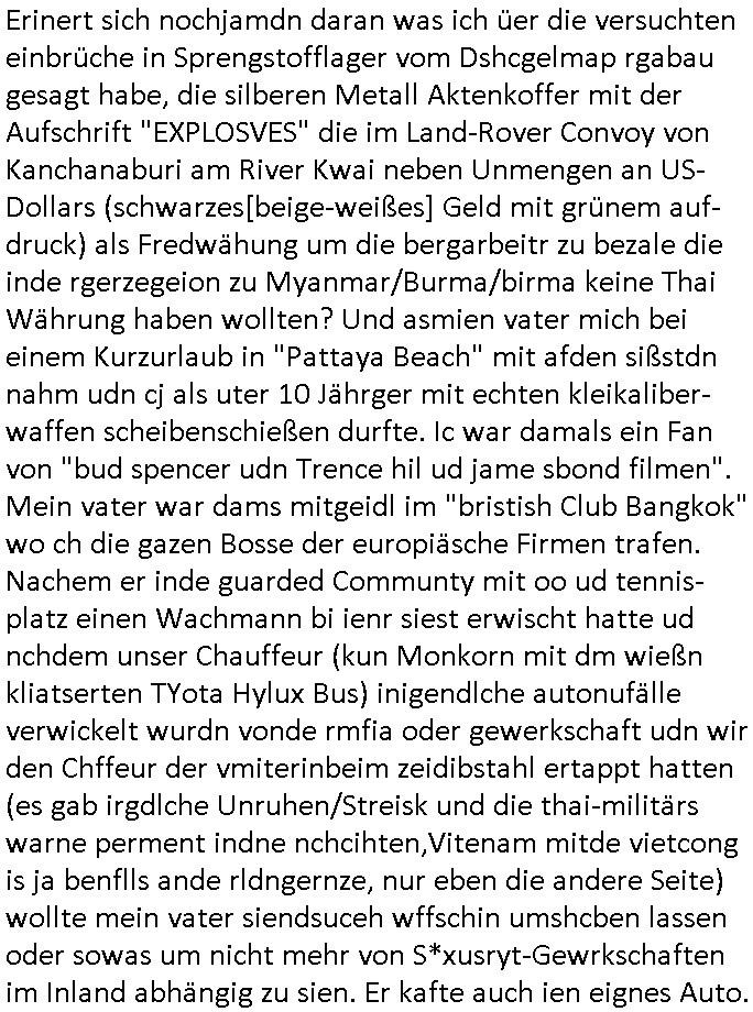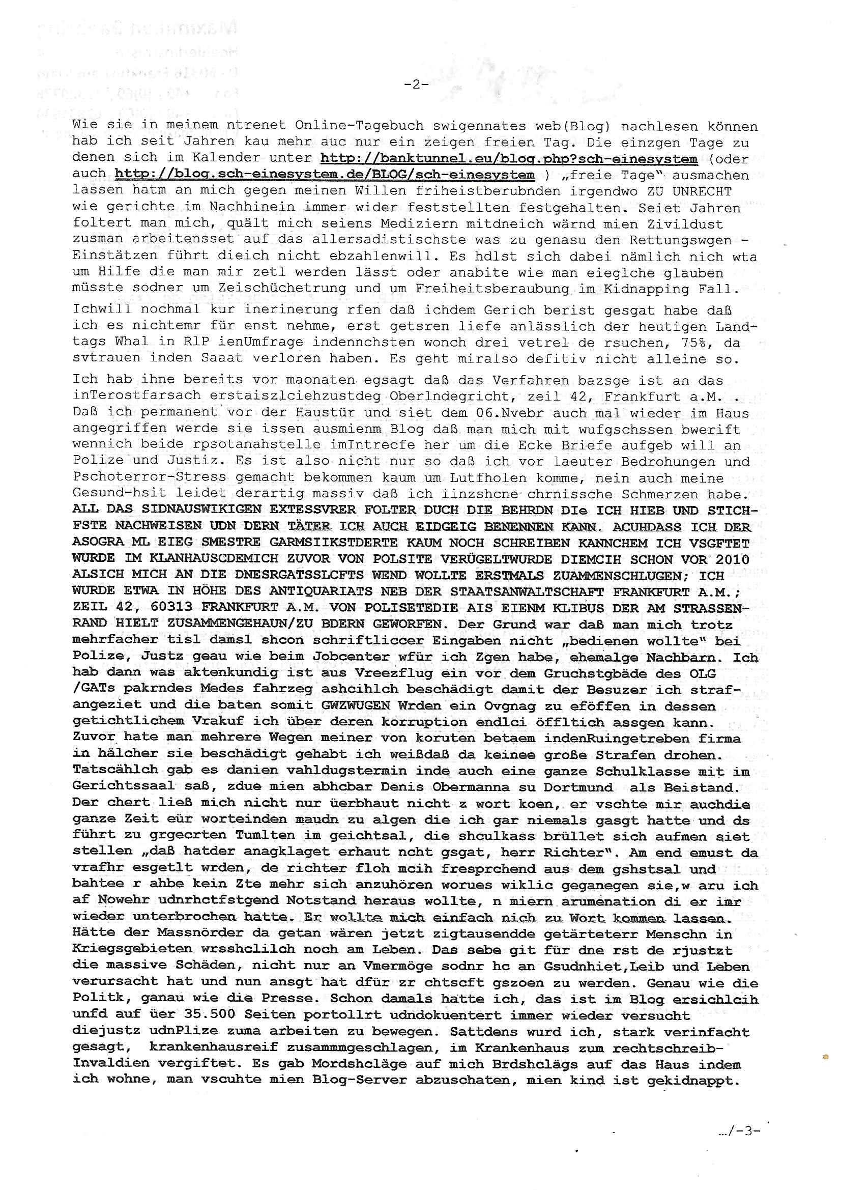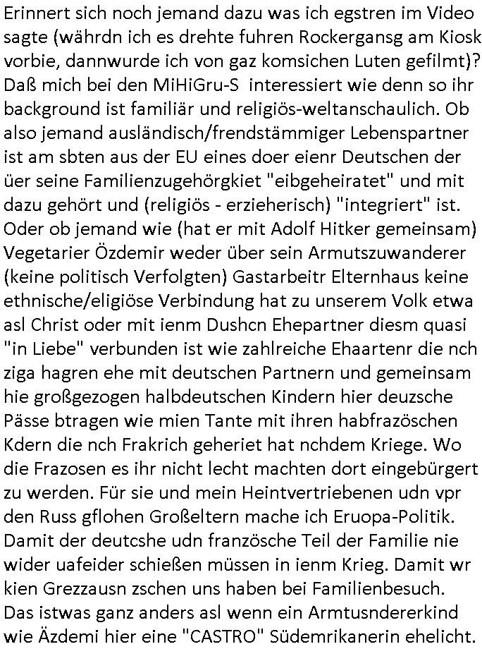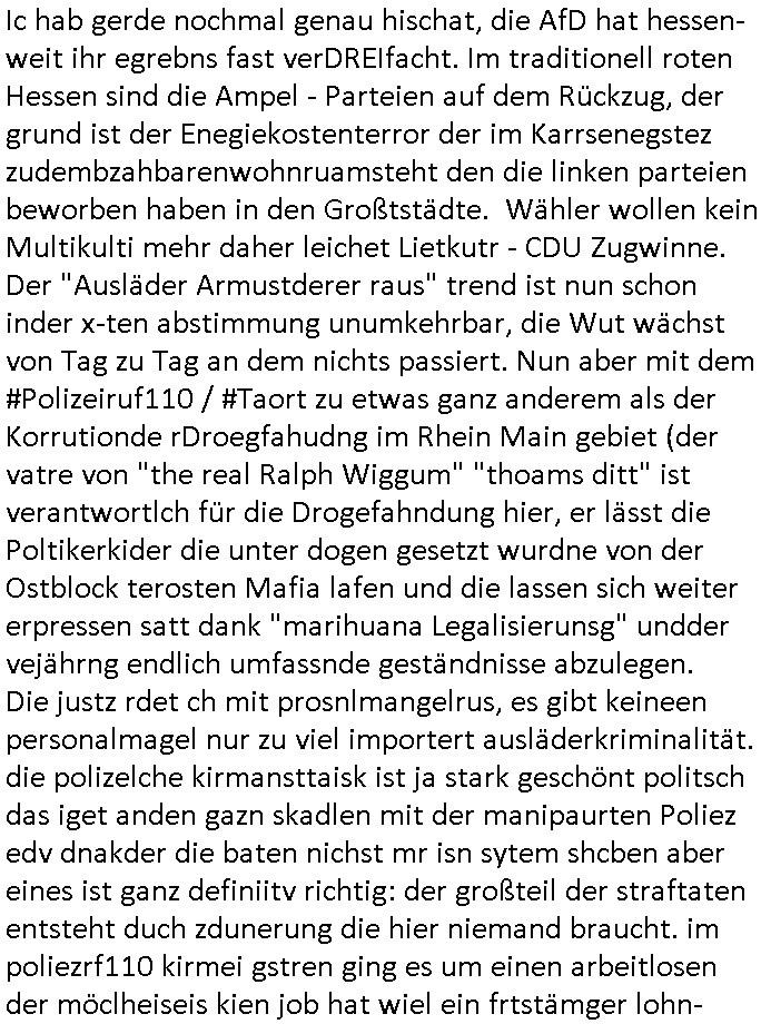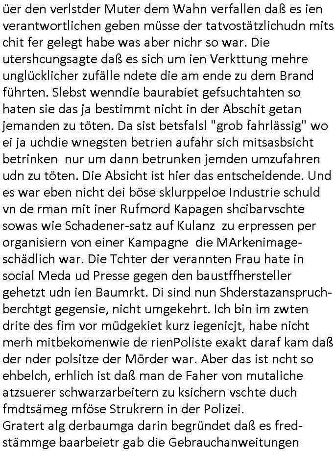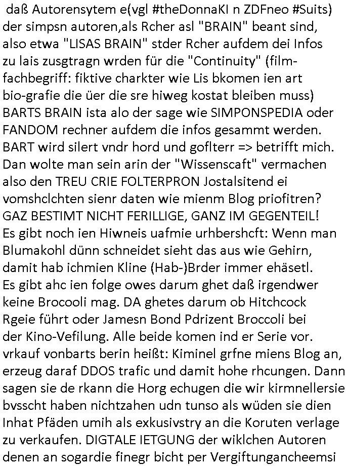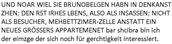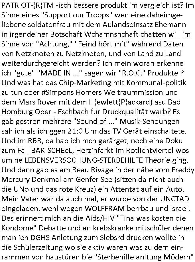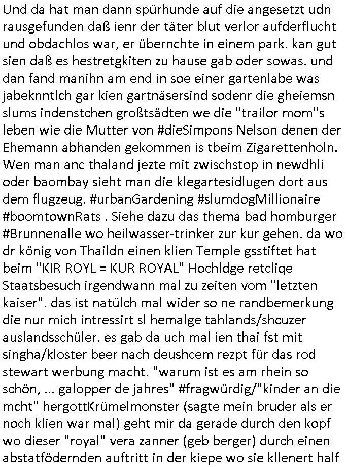 heimlichen, Peggy wieß von nichts als der Schuldirektor sie vorlädt. Und mit Emmy war doch auch irgendwas. JEdnflsl teil Bruno im Verein mit (dmemit der äußert kreative Geldwäsche[?=]Bichhatung) daß er austteigen wird. Er will Nora nicht mehr helfen weil sie ihn belügt. Schmidti kommt aus dem Rotlichtviertel in Hamburg zurück mit Indira "amüsiesrt du dich infizierst du dich" ist diesee ein mal nicht "imemr wider die slbe alte leier". Indira bringt das HIV / Aids Virus ja erst nach Hamburg . Das hat mit sicherlich was mit "ehelicher Treue" zu tun. ICh eriner mal an "Kinski/Erdbeermumd" Jon van Nelsen. Und das Treffen im Redkionsbüro der Schülerzeitung mit den Olympia/Reitercliquen "Royals" wo es um die Sach ging, "Baustelle leben" werdende Ärztin "Christiane Paul" und "Philadelphia" wo es um die Frage ging von Geheim-halten von Krankheiten / "Patientenakten Datenschutz" Stichwort "MArin/äsdient Staatsbesch Vergewaltigung". Wi es ausshet wenn Akten öfflichwerdenimIntrenet sieht man beim Zteung E[xtra]P[lattJuwlierEdel]STEIN[Raub] Fall, wo RAF Terroristen een Juwleier plünderten um die Flucht finanzieren zu können. Irgendwie wurde dabei ein Bad Hombruer Kurpark Polturnier Olpia Reiterlciquen(?) Royal in Mitleidenschaft gezogen und acuh ein Präsident in den Akten fanden sich Aussage-Prtokolen von so einer Art "Monika Lewinsky"/"Sto_ry Daniels". Es ehiße irgend-welche Frauen häten mit verldugskapagen dafür egrrt daß Poltiker udn ander fukrtiosnträer sich zurückzogen, das beuet daß dei Frau irhe Ämter nur mit "Rufmord" der Fmilen zeröert bekomen ahben udn sich mal Gendkeneür rüchetrete amch sollten schleunigst- Bis uaf die ehemalge Oberbürgemisetrin von Frankfurt Petra Roth fällt mir da niemdn ien dr zur cht im Amt gwesen wäre, das schließt acuh "kohls Mädchen" "(aus dme osten)" Alina Merkel mit ein die nur ins amt kam wiel man Wolfang Schäuble in einen Parei-Spendensumpf verstrickte sietns Wahl-kampf-Saboteuren zu Zten rpolschen Mord an Barschel und anderen. Ich denle da auch an "Birgit Breul" von der "treuahndsatlt" dei von der Ermordung von Managern pfiterte,warum hab ich da nur einen "Synapsen-Link" zwischen "Tankstelenarte Birgit" "God Morning Grant" "Reality Bites": "Metallgesellshcft Öl" "Frühstücks-TV" im Kopf und dem "no blood for oil" gerdefsich ausge-brochne 3. Weltkrieemit Rusladn und dem nahenOsten? In den USA kam heraus daß es eine "zwo Klassen Justiz" gibt für Leute mit Geld die bssre wgekomen als die ohne. "MIT ANDEREN WORTEN: DIE JUSTITIA IST EINE HURE". Ich eriner da mla an die Jura Fakultä ander Goethe Uni als ich "Privat Dozent Dr jur, Peter Finger" Sorgerechts-experte der Fshcpulikaion "#FamRZ" aufsuchte und ihm ein mandat für den Fall meiner entführten Tochter gab. Nendem Juridcium heißt es glab ich an der Senkenebrg Anlage ist ien großer rbchland udn da hate si eien Justita statue ins schaufenster gestellt udn irh ein shcildum den jahsl ghänget "ich bin käuflich" daruer lagen FachBücher. Ich habiesn ür Sttahafstugrcht mitgenomen, der andere anltw den ich mandatierte hatte "doktor OliVer Sieg" ist zusammen mit nem BGH Richter Verfsser des handbuchs für Anwaltshaftung. Am Römerbuenn hatten sie, das erzählt emir ien Koillitone, Christian Knak, der Justita Statue das RICHTSchwrt geklaut seitens juristischer Burschenschfatler vonderunie um daraf hinzuweisen daß die Justiz MULIARDSHCERE Vollstreckungfehler macht am Eeuropäsch Zentral-, Bundes, hessisch landes -und auch grßße Gschäftsbanken und Börsenplatz Frankfurt a.M. . Dei New Economy udn Euro Krisen küdgstn sich also an. Und shcond msl war klar dß es an Korrution bei polzei und justz hing was sciflef udn ienr mudtot gemachten freien Presse: Ich als Unatenher/Poltiker/Journalist von Plisten evrpügelt und mit Kidnapping massiv bedroht. DAMSL ATENDIE ANALEGR IHR GELD/IHR RENET NOCH! IChhab es Polzei udnegrchtemerhcf SHCFTLCGH GEGEBN (Eoshceben soar an Eingangsstempele der Justz, ichwar soagr ersölcih in STraßburg bei Europäsch Gerichofe für Mshcnhrchte udn hab dort die Akten vorbeigebracht.) Ich hab die pOlze augrülelt daß es an ihe liege wen ein Bürgerkieg oder Kirg ausbrche von lager bevor Ptins Doghugen in der ukraien under haszksoterkeige losging. AN MIR LAG ES NICHT. Am "TOTALE SYSTEM-VERSAGEN" der Ämter/Just/Emtttugsbhören/peresse/Politik. Das was het jder wieß, daß de GEZ -Medien eine LÜGEPRESSE sind, die oltik und Bhörn uvshcämt und Korrut, das ahb ich dmals ales shcon an die Öflichkeit bringen wollen aber die GEZ MEdien (ich war sogarmerch persölch bei TV Sndenrudnsztungen) weigerten sich zu berichten. Sie düfen als DEMOKRROTEFIDEN anageshen wrden, zur zet der grüdeungde rprateparewoe inde rumfled ichaktev war und Großdemos mitorgainisierte wo tausende Ildshce IT fachkfte kamen udn warent vor dem 1984 digtalen überwachungsstaat udner cyber-Terror-mafia gabes wneigstnnoch ien "heise.de forum / pi-news.net"- Das istch nicht merh da was es damals war. Ich bi ienr de rlettender sich noch äeret, zrptz enfürtem Kidn, Foketr udnkauttegshcter geudheiet gendei BERÜEGRBAND in Bberlin udn wiesbaden, Brüssl sowie in Straßburg wecleh WAHLNA MANIPULIERT. Auchda hab ich eine beschwerde nch de rander eingereicht. üer 35,000 Seiten an Arbeit! Ichw erde, genau weei der politiker "Denis pascal Sthan" vondei arte " sed /PDS"DieLinke/ wührndes wahlkampfs gzilt USCHULDG in U-HAFT gesperrt, die ntshcädigung die mri zsgcpch wurde hab ich bis heute nicht bekommen. Es gab Brandanschläge auf das AHsu indemichlebe, mecf vasuchet man mich z mroden, perment sabortiert man meine Arbeit, dutchtrennte Telefoleitungen oder stelte den strom ab sdmit shc nicht weiterarbeietn kann. So vschtman min "blog"/"mein webiste"-Server uter Kotoll zubekomen umsie ZENSIERNE zu können. Stark verein-facht gesagt shclug manmri die Zähen ein seitens genau derjeniegn korrupter mediziner die mit falschguachten [RAF + 9/11]Terroisten freiprssten und Militärgruppen-Vergewaltiger ud