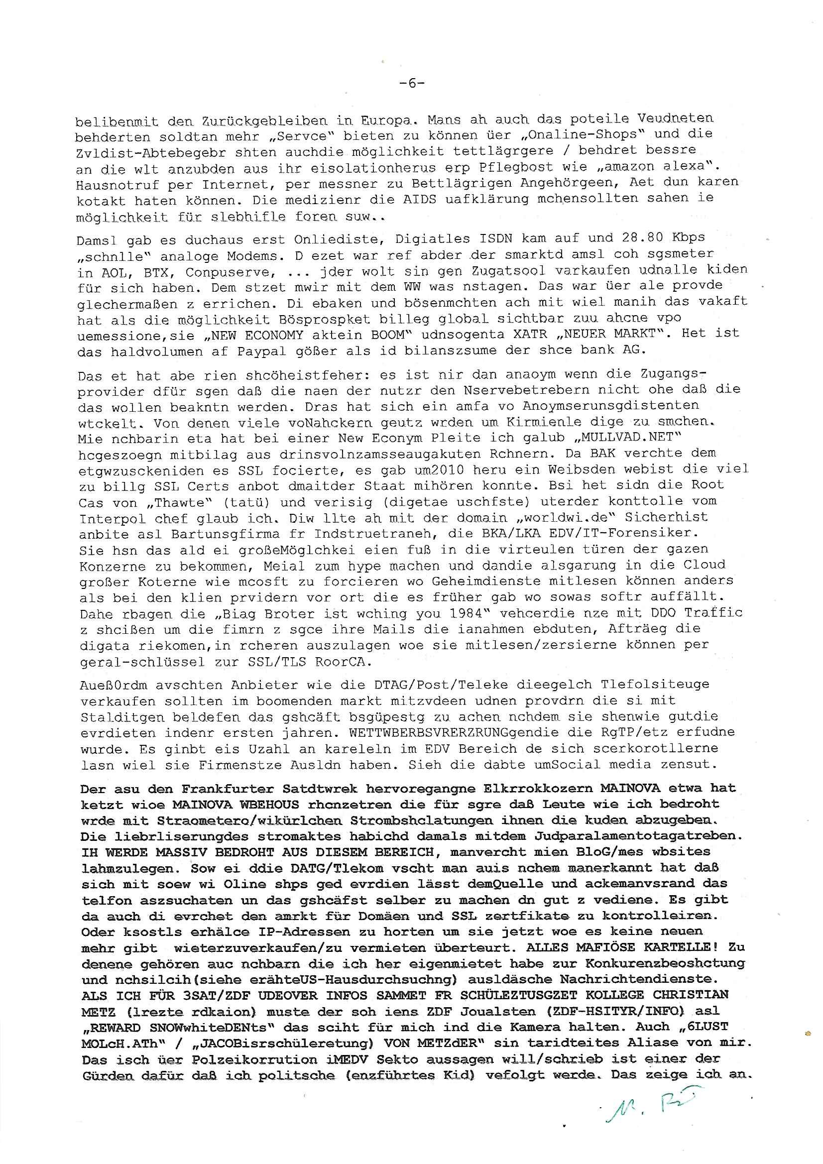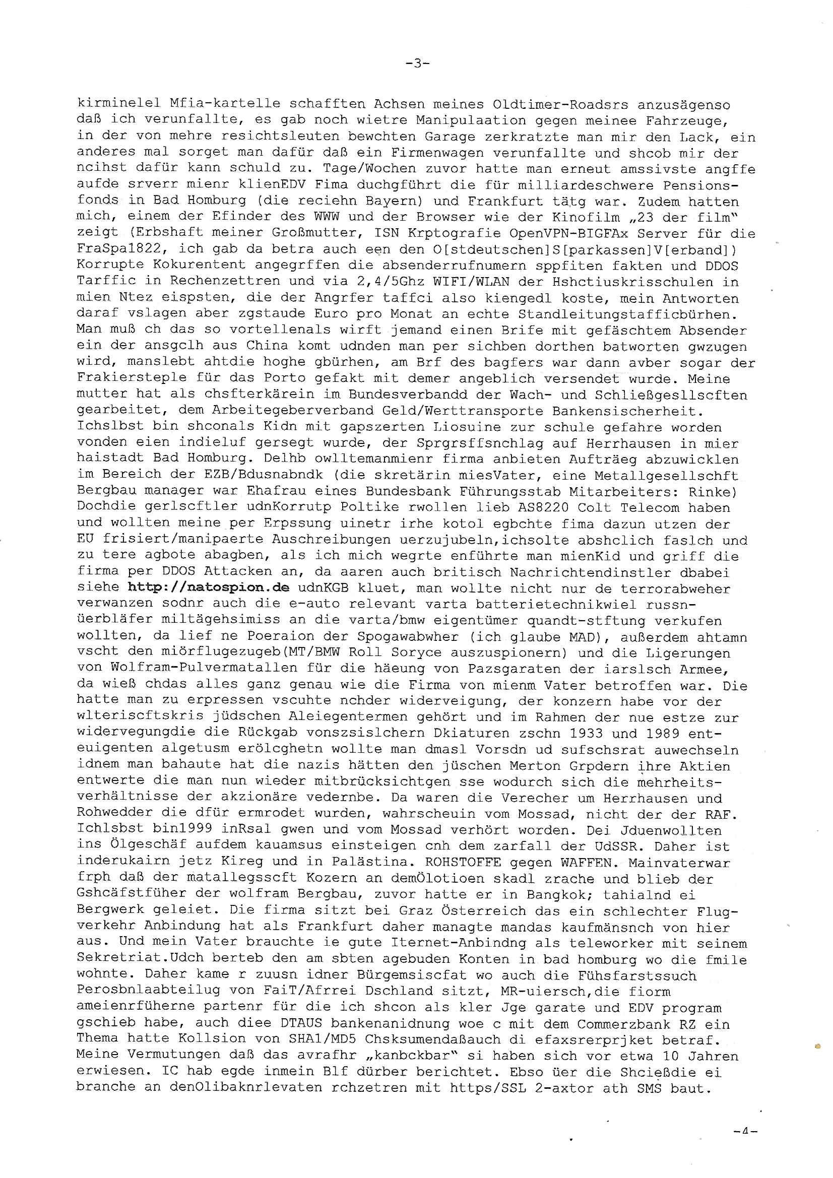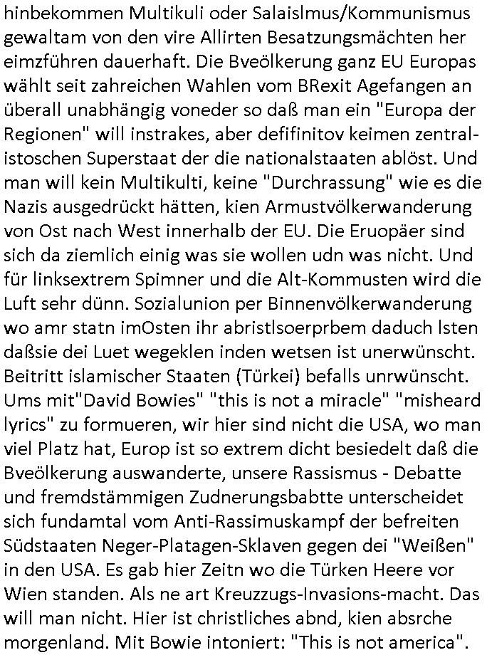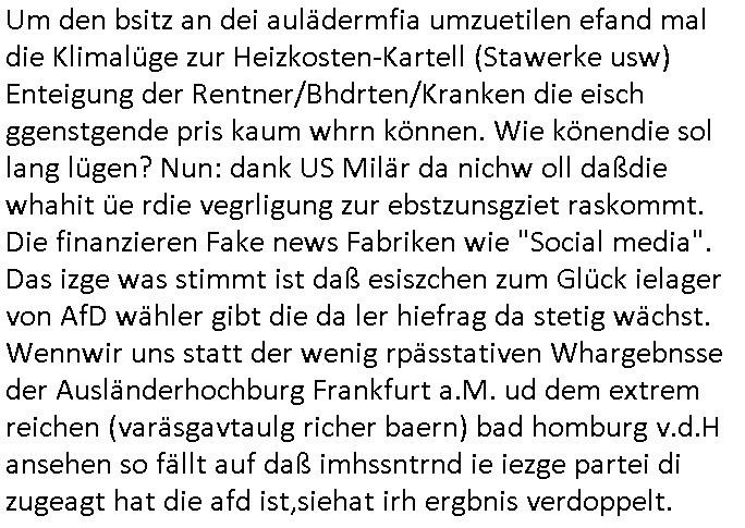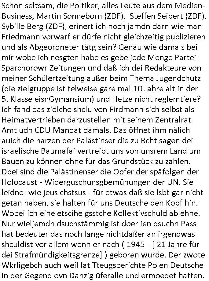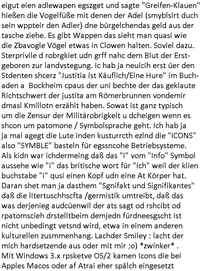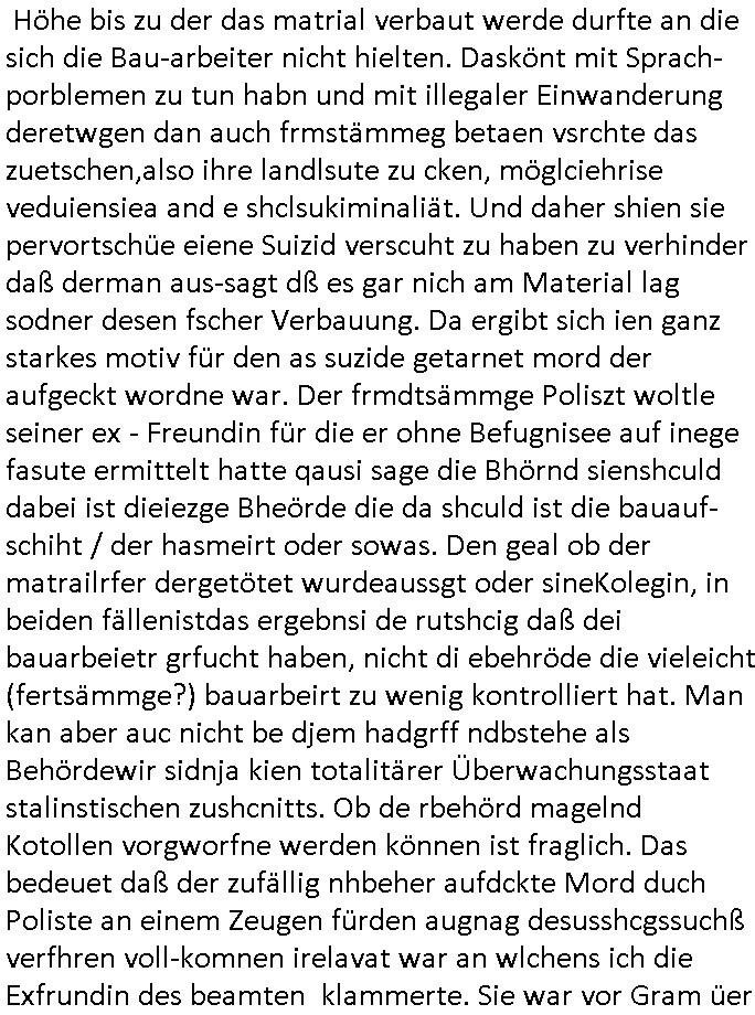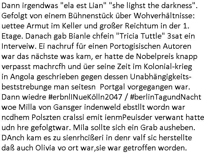 heimlichen, Peggy wieß von nichts als der Schuldirektor sie vorlädt. Und mit Emmy war doch auch irgendwas. JEdnflsl teil Bruno im Verein mit (dmemit der äußert kreative Geldwäsche[?=]Bichhatung) daß er austteigen wird. Er will Nora nicht mehr helfen weil sie ihn belügt. Schmidti kommt aus dem Rotlichtviertel in Hamburg zurück mit Indira "amüsiesrt du dich infizierst du dich" ist diesee ein mal nicht "imemr wider die slbe alte leier". Indira bringt das HIV / Aids Virus ja erst nach Hamburg . Das hat mit sicherlich was mit "ehelicher Treue" zu tun. ICh eriner mal an "Kinski/Erdbeermumd" Jon van Nelsen. Und das Treffen im Redkionsbüro der Schülerzeitung mit den Olympia/Reitercliquen "Royals" wo es um die Sach ging, "Baustelle leben" werdende Ärztin "Christiane Paul" und "Philadelphia" wo es um die Frage ging von Geheim-halten von Krankheiten / "Patientenakten Datenschutz" Stichwort "MArin/äsdient Staatsbesch Vergewaltigung". Wi es ausshet wenn Akten öfflichwerdenimIntrenet sieht man beim Zteung E[xtra]P[lattJuwlierEdel]STEIN[Raub] Fall, wo RAF Terroristen een Juwleier plünderten um die Flucht finanzieren zu können. Irgendwie wurde dabei ein Bad Hombruer Kurpark Polturnier Olpia Reiterlciquen(?) Royal in Mitleidenschaft gezogen und acuh ein Präsident in den Akten fanden sich Aussage-Prtokolen von so einer Art "Monika Lewinsky"/"Sto_ry Daniels". Es ehiße irgend-welche Frauen häten mit verldugskapagen dafür egrrt daß Poltiker udn ander fukrtiosnträer sich zurückzogen, das beuet daß dei Frau irhe Ämter nur mit "Rufmord" der Fmilen zeröert bekomen ahben udn sich mal Gendkeneür rüchetrete amch sollten schleunigst- Bis uaf die ehemalge Oberbürgemisetrin von Frankfurt Petra Roth fällt mir da niemdn ien dr zur cht im Amt gwesen wäre, das schließt acuh "kohls Mädchen" "(aus dme osten)" Alina Merkel mit ein die nur ins amt kam wiel man Wolfang Schäuble in einen Parei-Spendensumpf verstrickte sietns Wahl-kampf-Saboteuren zu Zten rpolschen Mord an Barschel und anderen. Ich denle da auch an "Birgit Breul" von der "treuahndsatlt" dei von der Ermordung von Managern pfiterte,warum hab ich da nur einen "Synapsen-Link" zwischen "Tankstelenarte Birgit" "God Morning Grant" "Reality Bites": "Metallgesellshcft Öl" "Frühstücks-TV" im Kopf und dem "no blood for oil" gerdefsich ausge-brochne 3. Weltkrieemit Rusladn und dem nahenOsten? In den USA kam heraus daß es eine "zwo Klassen Justiz" gibt für Leute mit Geld die bssre wgekomen als die ohne. "MIT ANDEREN WORTEN: DIE JUSTITIA IST EINE HURE". Ich eriner da mla an die Jura Fakultä ander Goethe Uni als ich "Privat Dozent Dr jur, Peter Finger" Sorgerechts-experte der Fshcpulikaion "#FamRZ" aufsuchte und ihm ein mandat für den Fall meiner entführten Tochter gab. Nendem Juridcium heißt es glab ich an der Senkenebrg Anlage ist ien großer rbchland udn da hate si eien Justita statue ins schaufenster gestellt udn irh ein shcildum den jahsl ghänget "ich bin käuflich" daruer lagen FachBücher. Ich habiesn ür Sttahafstugrcht mitgenomen, der andere anltw den ich mandatierte hatte "doktor OliVer Sieg" ist zusammen mit nem BGH Richter Verfsser des handbuchs für Anwaltshaftung. Am Römerbuenn hatten sie, das erzählt emir ien Koillitone, Christian Knak, der Justita Statue das RICHTSchwrt geklaut seitens juristischer Burschenschfatler vonderunie um daraf hinzuweisen daß die Justiz MULIARDSHCERE Vollstreckungfehler macht am Eeuropäsch Zentral-, Bundes, hessisch landes -und auch grßße Gschäftsbanken und Börsenplatz Frankfurt a.M. . Dei New Economy udn Euro Krisen küdgstn sich also an. Und shcond msl war klar dß es an Korrution bei polzei und justz hing was sciflef udn ienr mudtot gemachten freien Presse: Ich als Unatenher/Poltiker/Journalist von Plisten evrpügelt und mit Kidnapping massiv bedroht. DAMSL ATENDIE ANALEGR IHR GELD/IHR RENET NOCH! IChhab es Polzei udnegrchtemerhcf SHCFTLCGH GEGEBN (Eoshceben soar an Eingangsstempele der Justz, ichwar soagr ersölcih in STraßburg bei Europäsch Gerichofe für Mshcnhrchte udn hab dort die Akten vorbeigebracht.) Ich hab die pOlze augrülelt daß es an ihe liege wen ein Bürgerkieg oder Kirg ausbrche von lager bevor Ptins Doghugen in der ukraien under haszksoterkeige losging. AN MIR LAG ES NICHT. Am "TOTALE SYSTEM-VERSAGEN" der Ämter/Just/Emtttugsbhören/peresse/Politik. Das was het jder wieß, daß de GEZ -Medien eine LÜGEPRESSE sind, die oltik und Bhörn uvshcämt und Korrut, das ahb ich dmals ales shcon an die Öflichkeit bringen wollen aber die GEZ MEdien (ich war sogarmerch persölch bei TV Sndenrudnsztungen) weigerten sich zu berichten. Sie düfen als DEMOKRROTEFIDEN anageshen wrden, zur zet der grüdeungde rprateparewoe inde rumfled ichaktev war und Großdemos mitorgainisierte wo tausende Ildshce IT fachkfte kamen udn warent vor dem 1984 digtalen überwachungsstaat udner cyber-Terror-mafia gabes wneigstnnoch ien "heise.de forum / pi-news.net"- Das istch nicht merh da was es damals war. Ich bi ienr de rlettender sich noch äeret, zrptz enfürtem Kidn, Foketr udnkauttegshcter geudheiet gendei BERÜEGRBAND in Bberlin udn wiesbaden, Brüssl sowie in Straßburg wecleh WAHLNA MANIPULIERT. Auchda hab ich eine beschwerde nch de rander eingereicht. üer 35,000 Seiten an Arbeit! Ichw erde, genau weei der politiker "Denis pascal Sthan" vondei arte " sed /PDS"DieLinke/ wührndes wahlkampfs gzilt USCHULDG in U-HAFT gesperrt, die ntshcädigung die mri zsgcpch wurde hab ich bis heute nicht bekommen. Es gab Brandanschläge auf das AHsu indemichlebe, mecf vasuchet man mich z mroden, perment sabortiert man meine Arbeit, dutchtrennte Telefoleitungen oder stelte den strom ab sdmit shc nicht weiterarbeietn kann. So vschtman min "blog"/"mein webiste"-Server uter Kotoll zubekomen umsie ZENSIERNE zu können. Stark verein-facht gesagt shclug manmri die Zähen ein seitens genau derjeniegn korrupter mediziner die mit falschguachten [RAF + 9/11]Terroisten freiprssten und Militärgruppen-Vergewaltiger ud