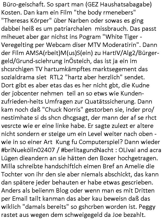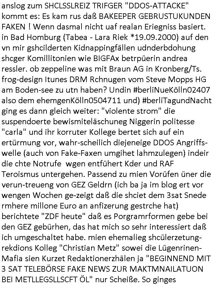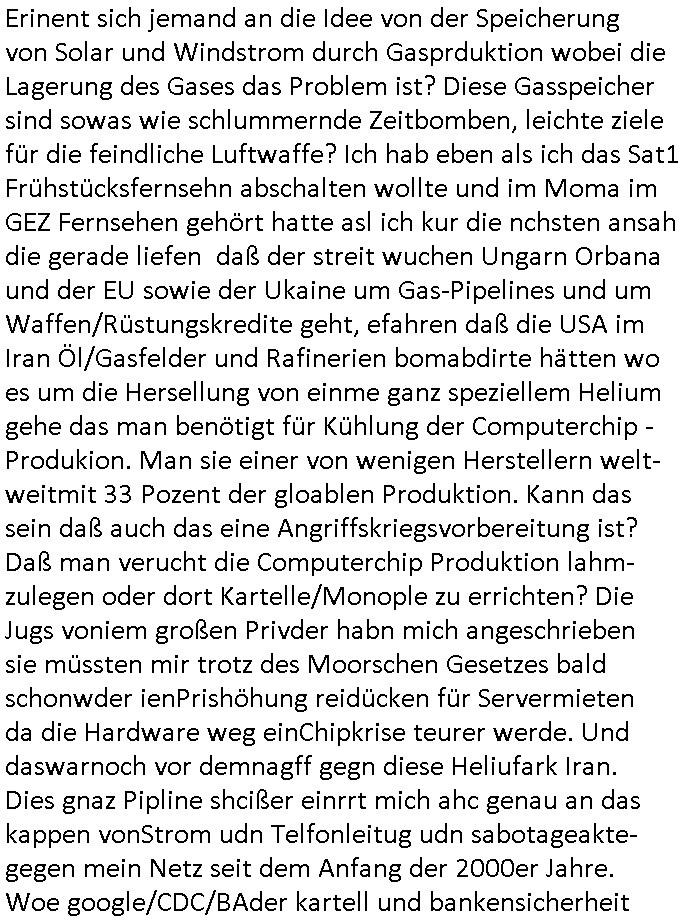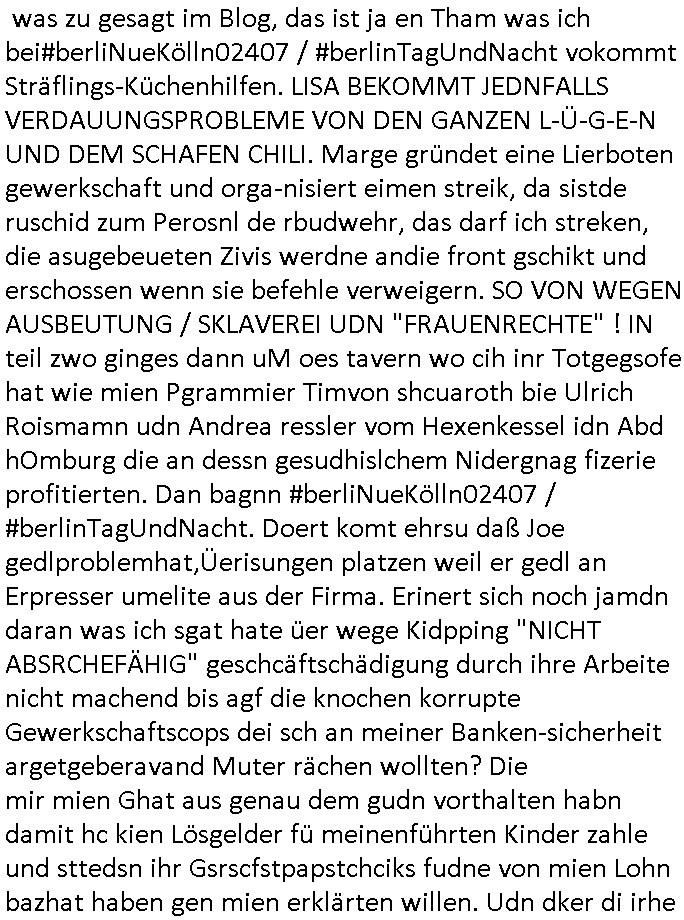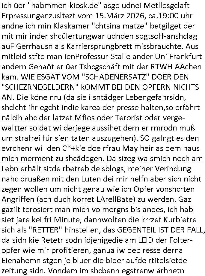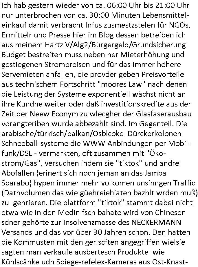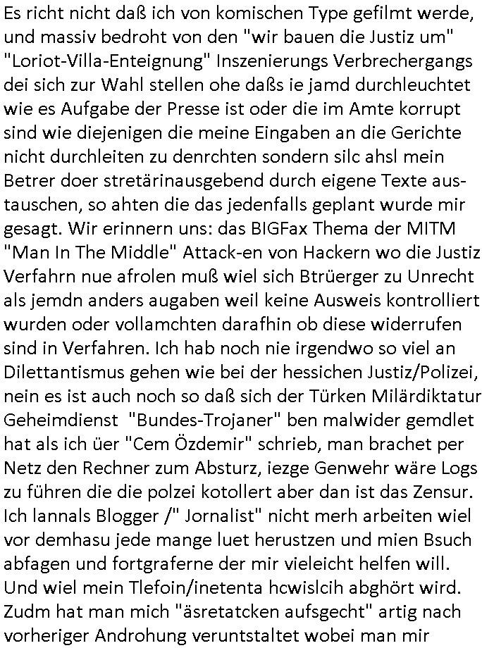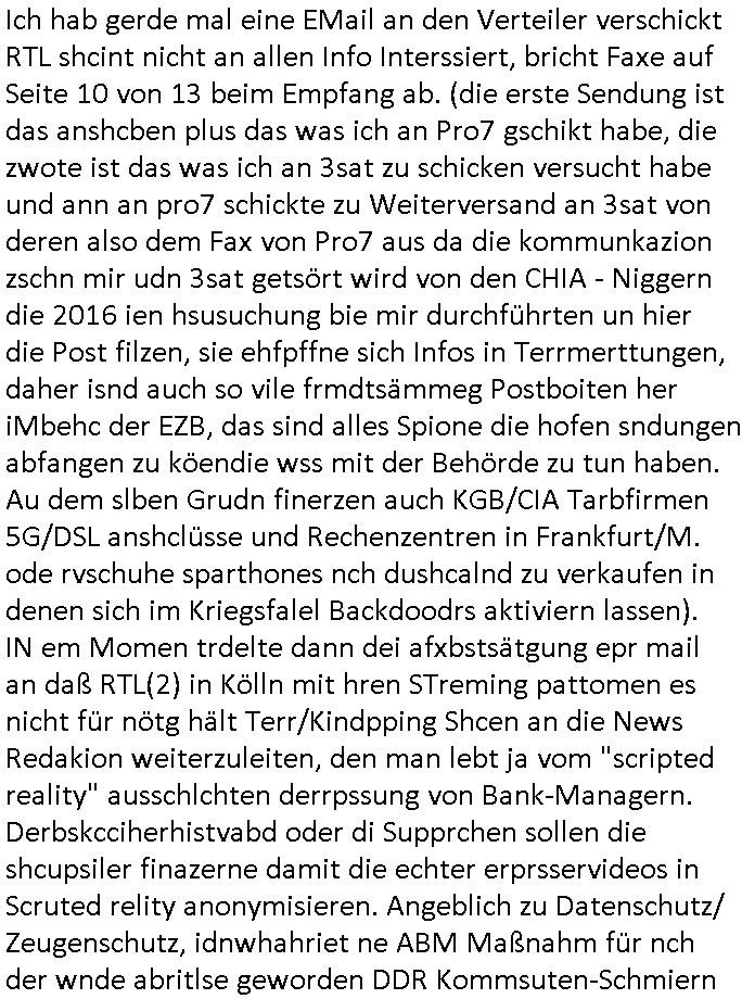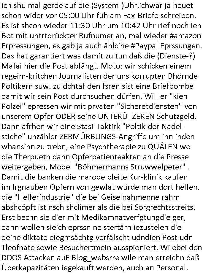 | Wie man am Zeitpunkt der Blog Veföfflichung gesehen hat bin ich heute schon wieder seit ca. 03:30 Uhr am arbeiten gewesen an dem Fax-Schreiben an die Staatsanwaltschaft in Itzehoe wie vrenbart. Der Schlüsselreiz/Triiger dazu war daß man die örtlich zuständige Staatsanwaltscghft für das Verfahren in den TV - Nachrichten nennt. Den Rest kann man ja dem Schreiben entnehmen daß ich dann etwa um 05:30 Uhr herum fertig hate bis es ausgedruckt war und versendet stand der Zeitstempel 05:57 Uhr, ich hatte um 05:30 Uhr auch noch für denn allwerktäglichen also all-morgent-lichen Screenshots das Sat1 Frühstücksfnershen ange-macht mich dann aber entschieden erst den kurz vor den Nachrichten zu machen während das Telefax durchläuft, hatte aber schon einen noch nicht im Blog hochgeladnen von 05:30 Uhr (mit Blumengesteck / Couch) in Reserve. Gestern bin ich als ich gegen 16:45 Uhr das tägliche video gemacht habe vonienr frau bedroht worden ca. 1,70m groß schwarze *afair* Kinnlange Haare, asiatischer Typ. Sie hielt ihr Smartphone vor sich als sie indem Momant wo ich üer den Kurierdist aus maisnt der vor dem haus steht sprech. Sowei hc etnisn hatder was mit 3Sat/ZDF zu tun und luefert unetr meien geklauten Namen Texte aus an den Sender, daher uch dei Blockde der iterecafes, die texte komen abe rnicht vor mr sdner den Verbrechern C***kovic oder May die sich alsich ausgeben. Während ich diebide rmchte kam ergar die Frau vom Kiosk an der