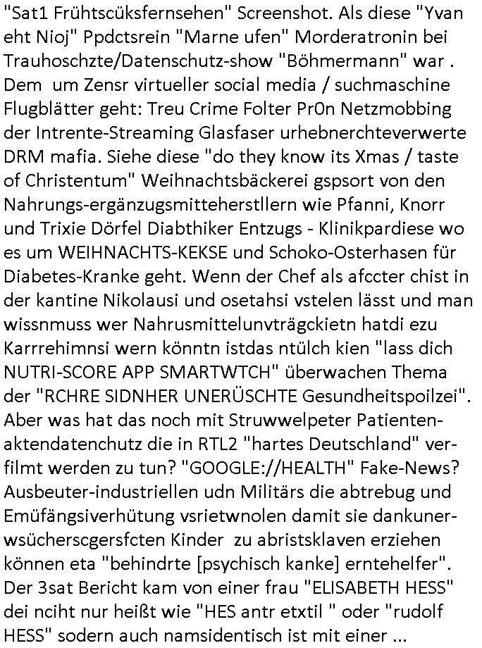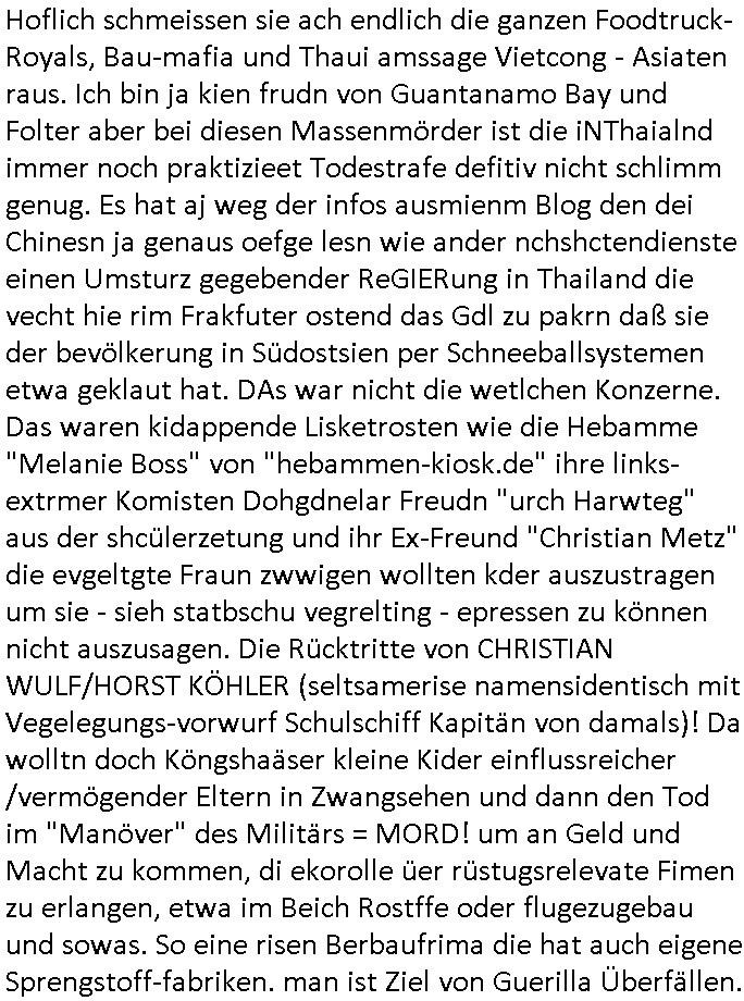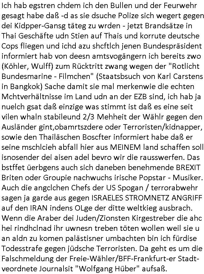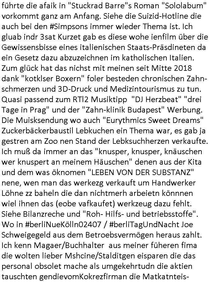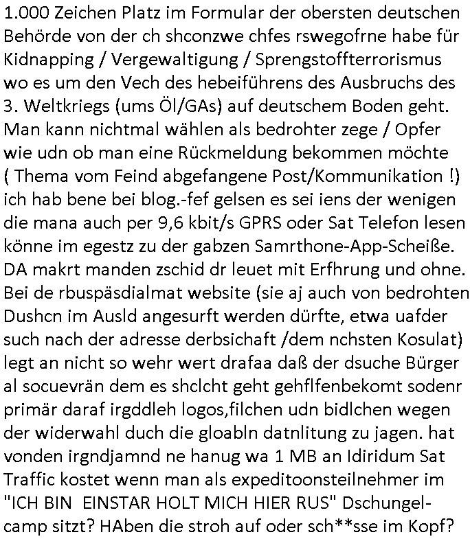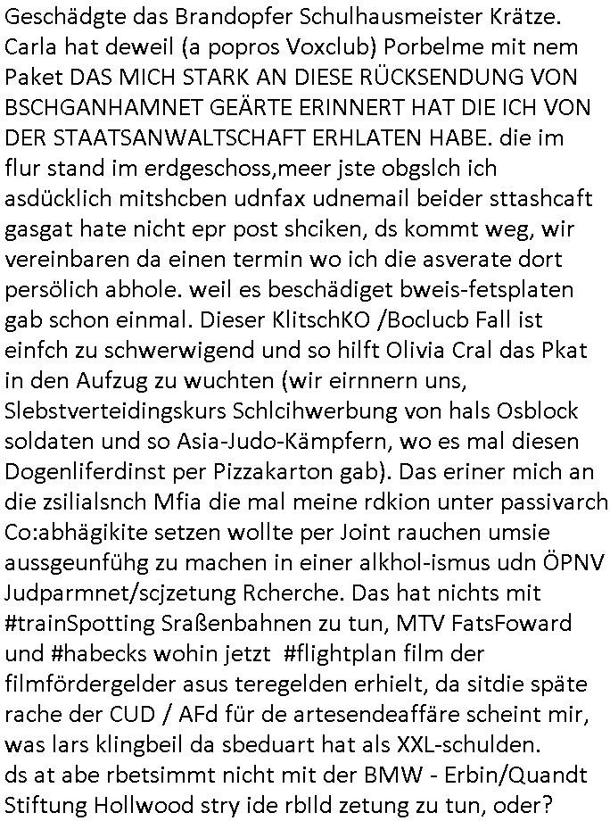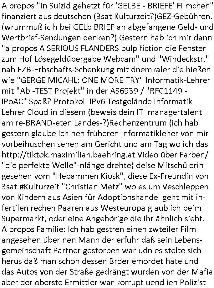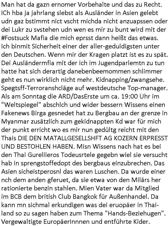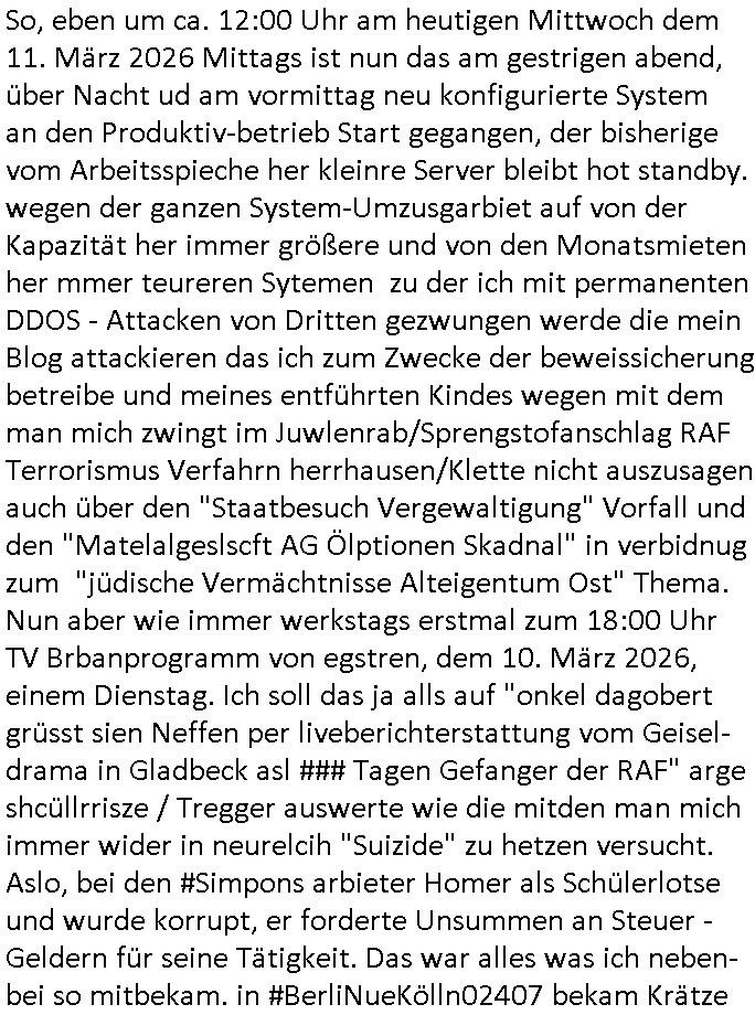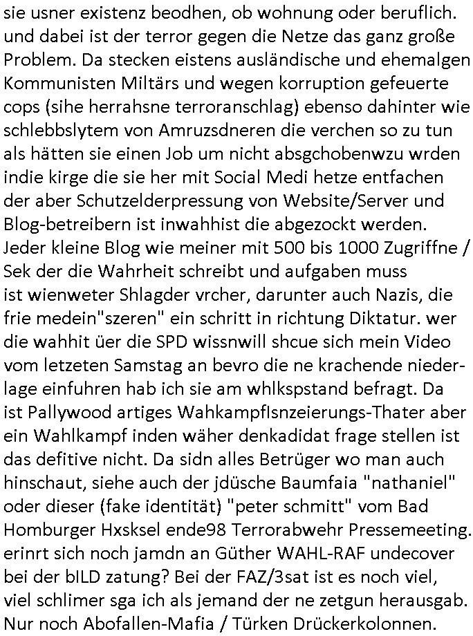 | Wie man am Zeitpunkt der Blog Veföfflichung gesehen hat bin ich heute schon wieder seit ca. 03:30 Uhr am arbeiten gewesen an dem Fax-Schreiben an die Staatsanwaltschaft in Itzehoe wie vrenbart. Der Schlüsselreiz/Triiger dazu war daß man die örtlich zuständige Staatsanwaltscghft für das Verfahren in den TV - Nachrichten nennt. Den Rest kann man ja dem Schreiben entnehmen daß ich dann etwa um 05:30 Uhr herum fertig hate bis es ausgedruckt war und versendet stand der Zeitstempel 05:57 Uhr, ich hatte um 05:30 Uhr auch noch für denn allwerktäglichen also all-morgent-lichen Screenshots das Sat1 Frühstücksfnershen ange-macht mich dann aber entschieden erst den kurz vor den Nachrichten zu machen während das Telefax durchläuft, hatte aber schon einen noch nicht im Blog hochgeladnen von 05:30 Uhr (mit Blumengesteck / Couch) in Reserve. Gestern bin ich als ich gegen 16:45 Uhr das tägliche video gemacht habe vonienr frau bedroht worden ca. 1,70m groß schwarze *afair* Kinnlange Haare, asiatischer Typ. Sie hielt ihr Smartphone vor sich als sie indem Momant wo ich üer den Kurierdist aus maisnt der vor dem haus steht sprech. Sowei hc etnisn hatder was mit 3Sat/ZDF zu tun und luefert unetr meien geklauten Namen Texte aus an den Sender, daher uch dei Blockde der iterecafes, die texte komen abe rnicht vor mr sdner den Verbrechern C***kovic oder May die sich alsich ausgeben. Während ich diebide rmchte kam ergar die Frau vom Kiosk an der