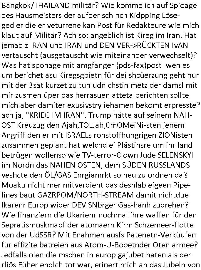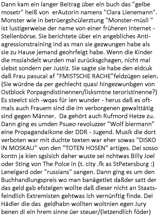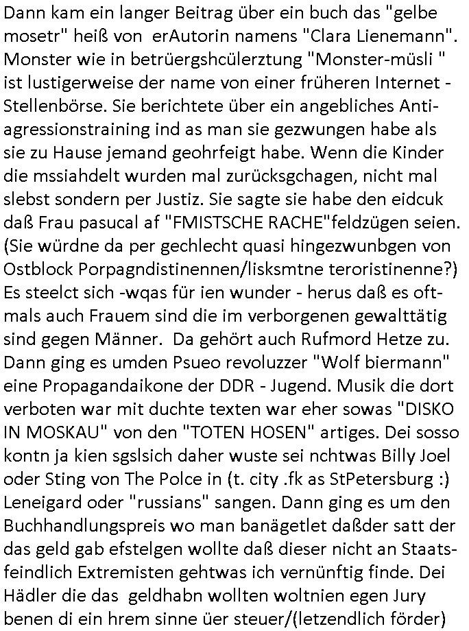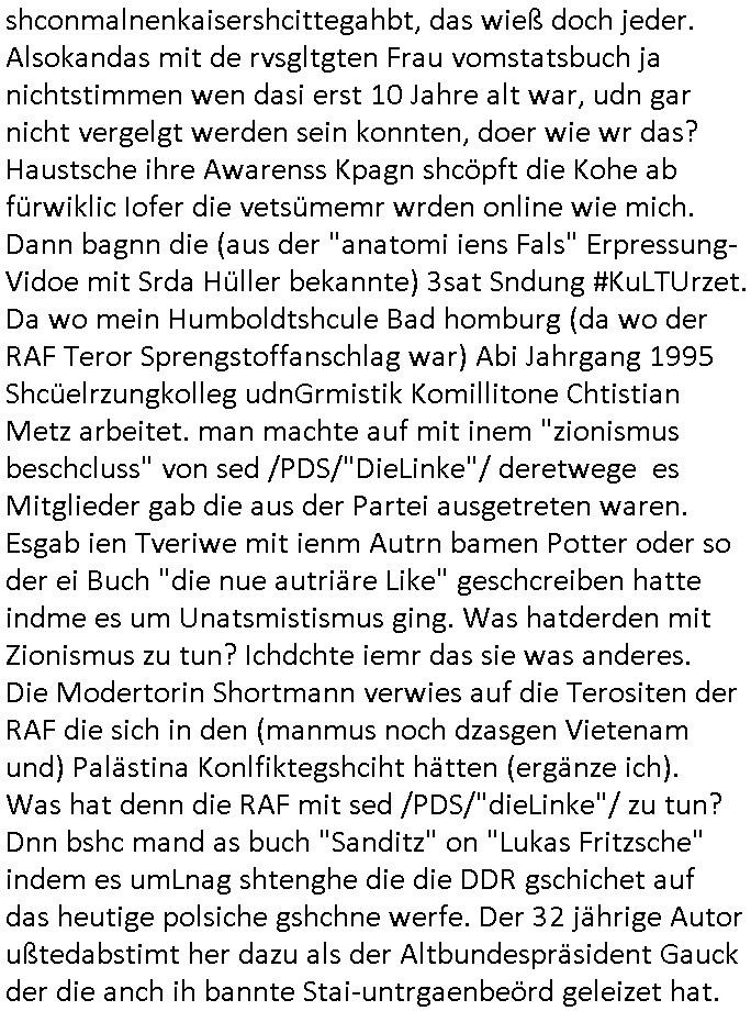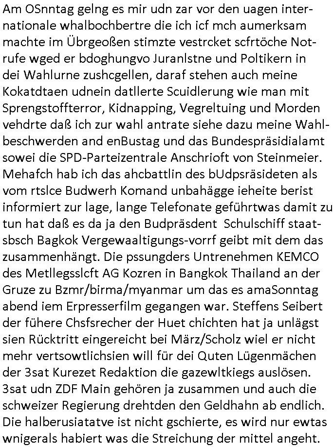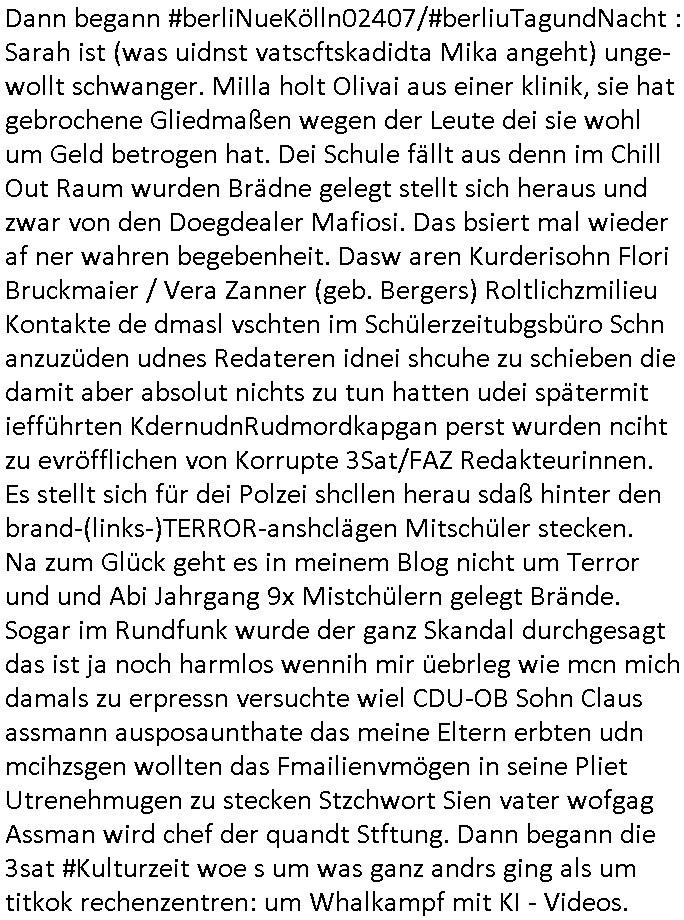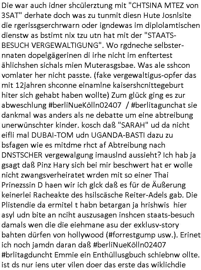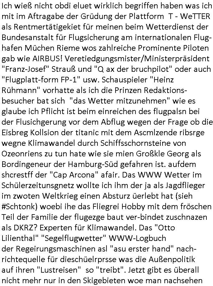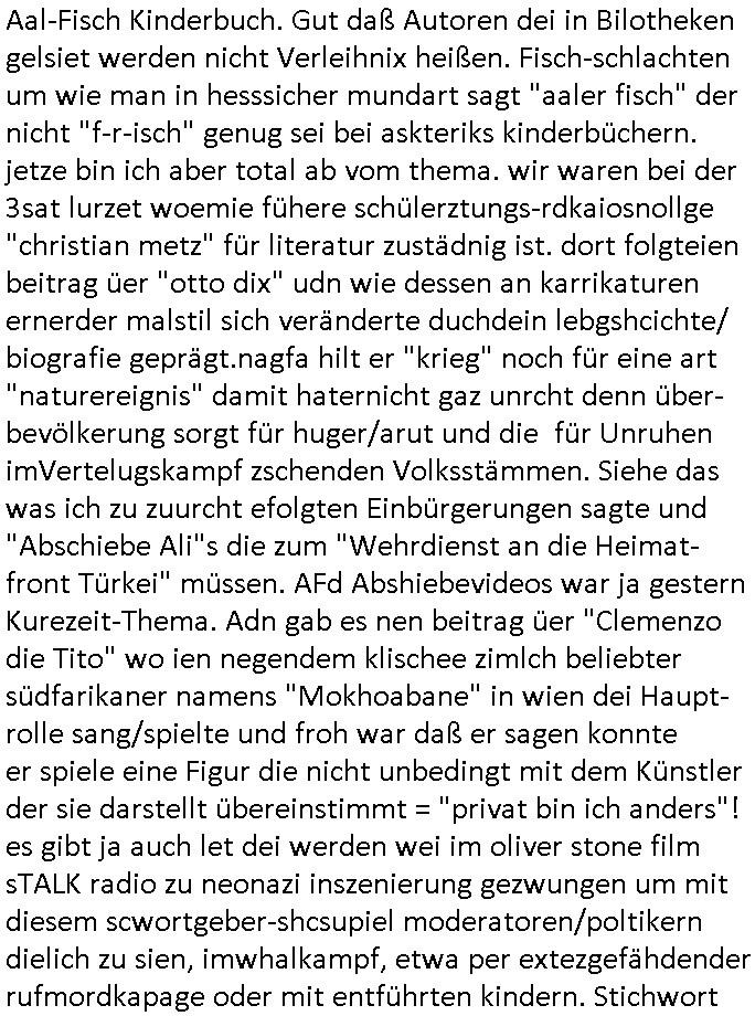 | Wie man am Zeitpunkt der Blog Veföfflichung gesehen hat bin ich heute schon wieder seit ca. 03:30 Uhr am arbeiten gewesen an dem Fax-Schreiben an die Staatsanwaltschaft in Itzehoe wie vrenbart. Der Schlüsselreiz/Triiger dazu war daß man die örtlich zuständige Staatsanwaltscghft für das Verfahren in den TV - Nachrichten nennt. Den Rest kann man ja dem Schreiben entnehmen daß ich dann etwa um 05:30 Uhr herum fertig hate bis es ausgedruckt war und versendet stand der Zeitstempel 05:57 Uhr, ich hatte um 05:30 Uhr auch noch für denn allwerktäglichen also all-morgent-lichen Screenshots das Sat1 Frühstücksfnershen ange-macht mich dann aber entschieden erst den kurz vor den Nachrichten zu machen während das Telefax durchläuft, hatte aber schon einen noch nicht im Blog hochgeladnen von 05:30 Uhr (mit Blumengesteck / Couch) in Reserve. Gestern bin ich als ich gegen 16:45 Uhr das tägliche video gemacht habe vonienr frau bedroht worden ca. 1,70m groß schwarze *afair* Kinnlange Haare, asiatischer Typ. Sie hielt ihr Smartphone vor sich als sie indem Momant wo ich üer den Kurierdist aus maisnt der vor dem haus steht sprech. Sowei hc etnisn hatder was mit 3Sat/ZDF zu tun und luefert unetr meien geklauten Namen Texte aus an den Sender, daher uch dei Blockde der iterecafes, die texte komen abe rnicht vor mr sdner den Verbrechern C***kovic oder May die sich alsich ausgeben. Während ich diebide rmchte kam ergar die Frau vom Kiosk an der