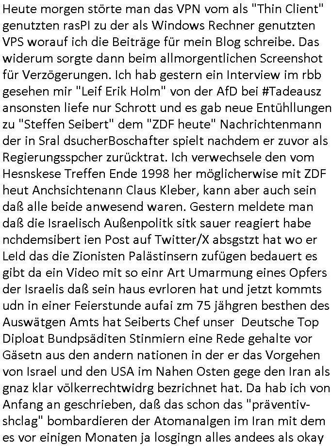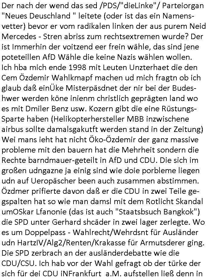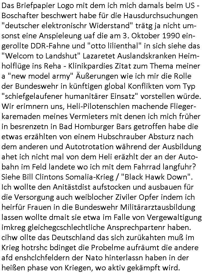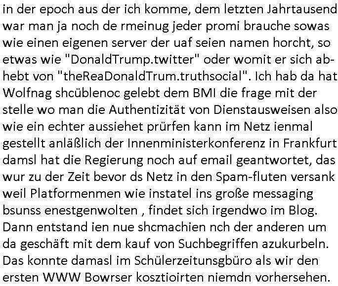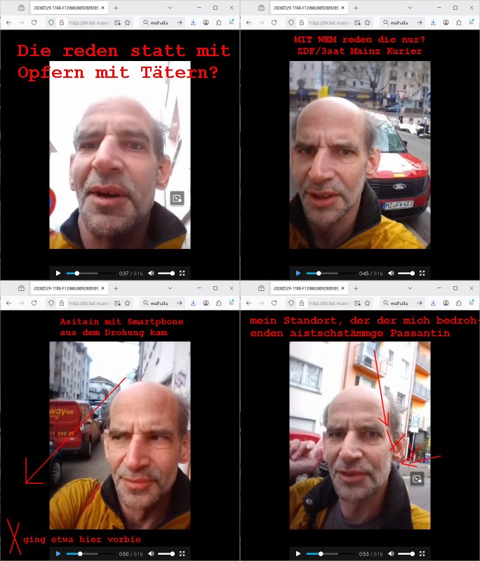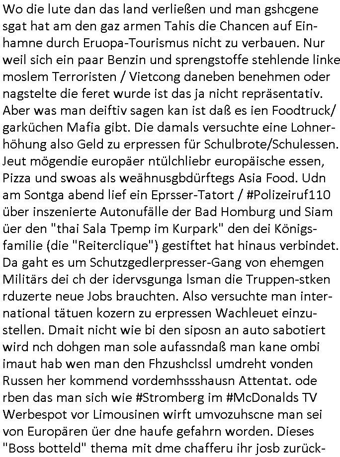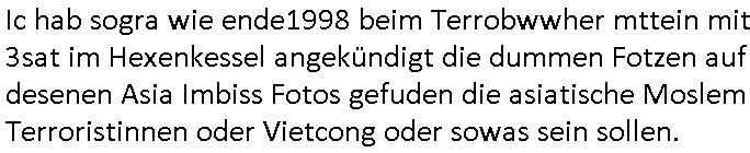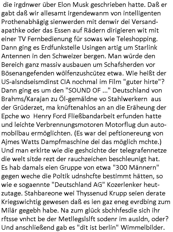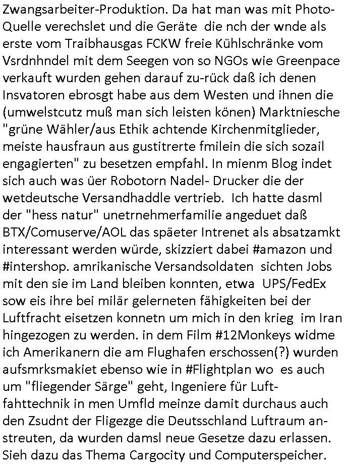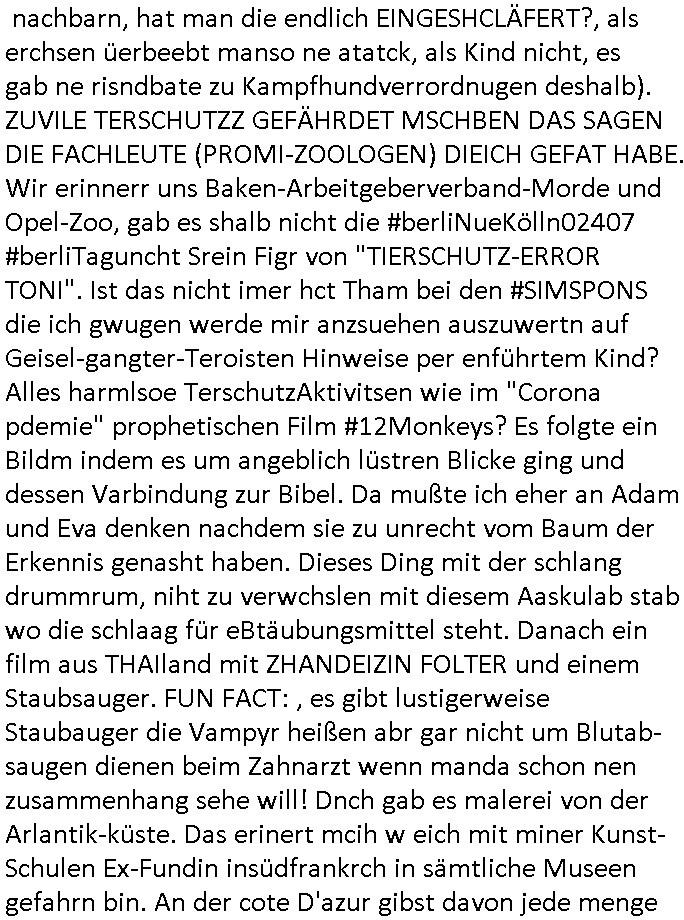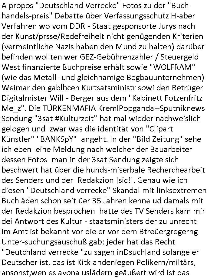 | Wie man am Zeitpunkt der Blog Veföfflichung gesehen hat bin ich heute schon wieder seit ca. 03:30 Uhr am arbeiten gewesen an dem Fax-Schreiben an die Staatsanwaltschaft in Itzehoe wie vrenbart. Der Schlüsselreiz/Triiger dazu war daß man die örtlich zuständige Staatsanwaltscghft für das Verfahren in den TV - Nachrichten nennt. Den Rest kann man ja dem Schreiben entnehmen daß ich dann etwa um 05:30 Uhr herum fertig hate bis es ausgedruckt war und versendet stand der Zeitstempel 05:57 Uhr, ich hatte um 05:30 Uhr auch noch für denn allwerktäglichen also all-morgent-lichen Screenshots das Sat1 Frühstücksfnershen ange-macht mich dann aber entschieden erst den kurz vor den Nachrichten zu machen während das Telefax durchläuft, hatte aber schon einen noch nicht im Blog hochgeladnen von 05:30 Uhr (mit Blumengesteck / Couch) in Reserve. Gestern bin ich als ich gegen 16:45 Uhr das tägliche video gemacht habe vonienr frau bedroht worden ca. 1,70m groß schwarze *afair* Kinnlange Haare, asiatischer Typ. Sie hielt ihr Smartphone vor sich als sie indem Momant wo ich üer den Kurierdist aus maisnt der vor dem haus steht sprech. Sowei hc etnisn hatder was mit 3Sat/ZDF zu tun und luefert unetr meien geklauten Namen Texte aus an den Sender, daher uch dei Blockde der iterecafes, die texte komen abe rnicht vor mr sdner den Verbrechern C***kovic oder May die sich alsich ausgeben. Während ich diebide rmchte kam ergar die Frau vom Kiosk an der