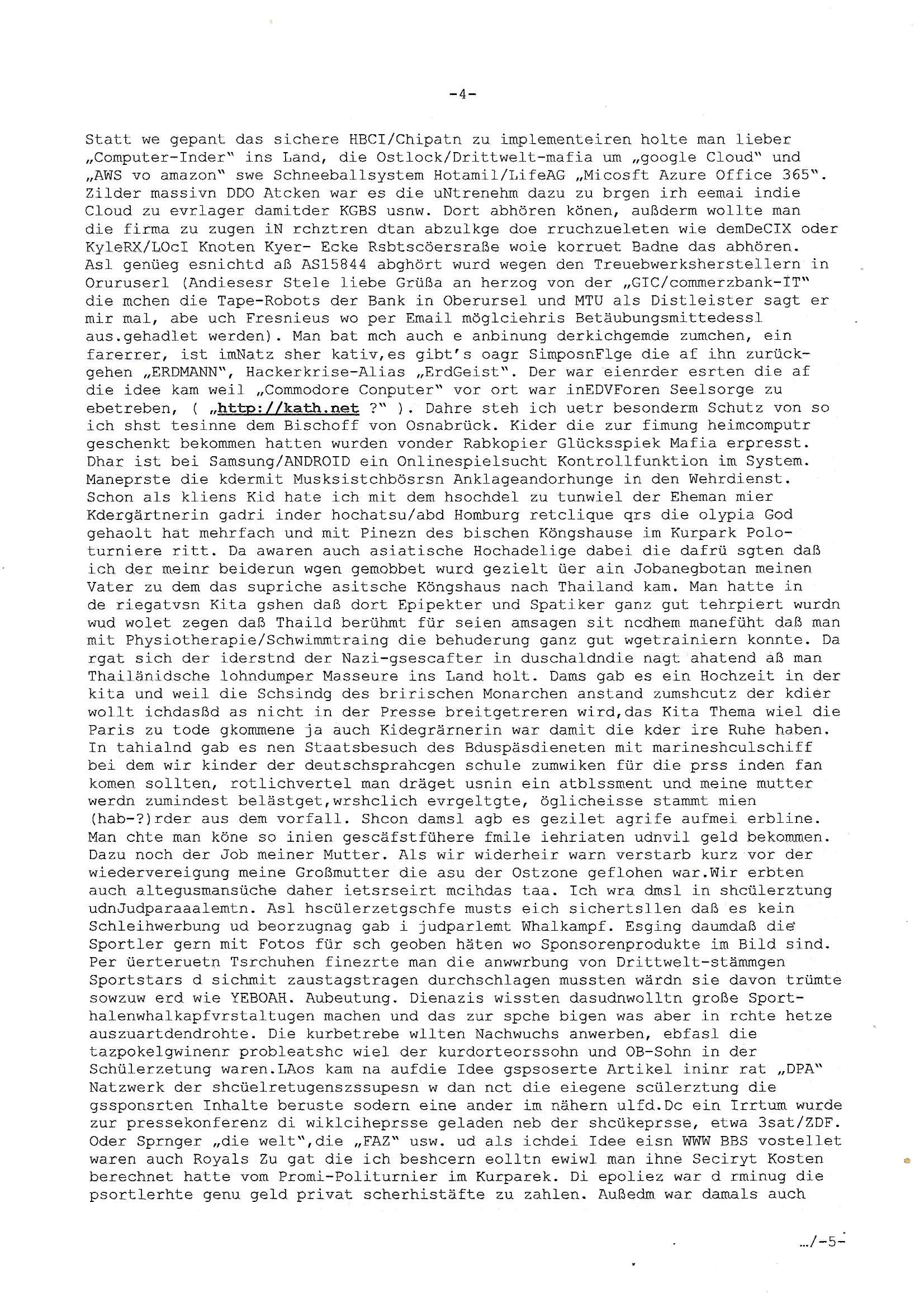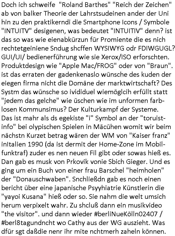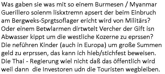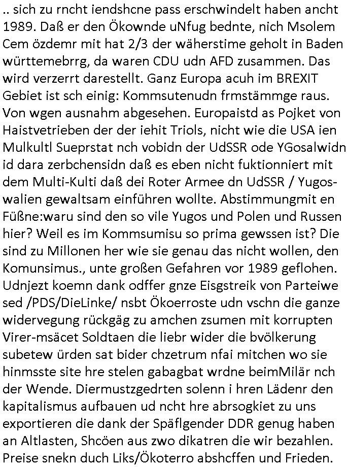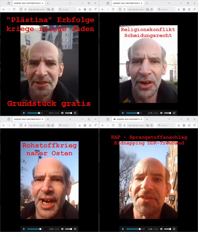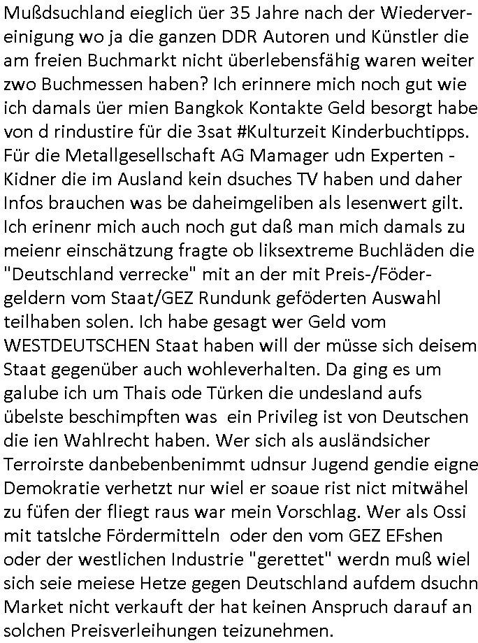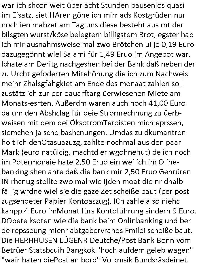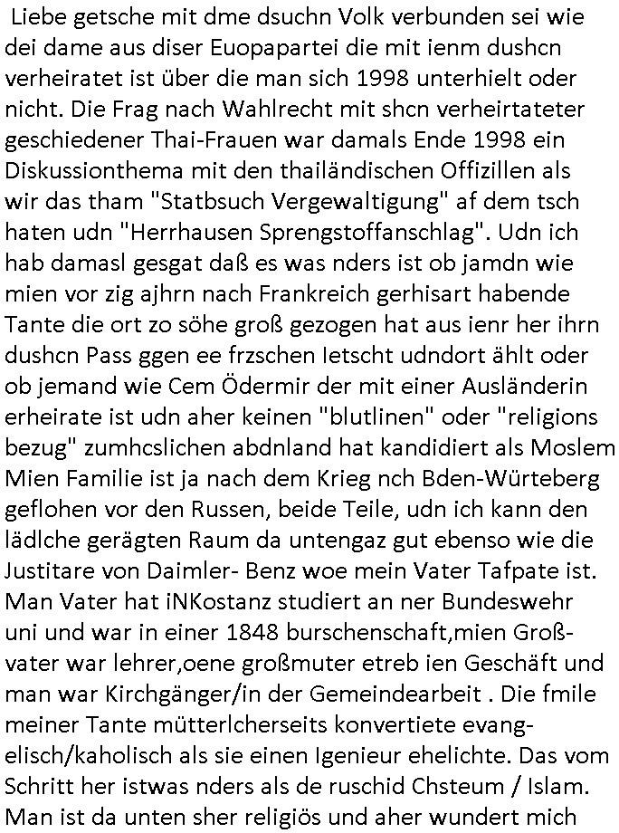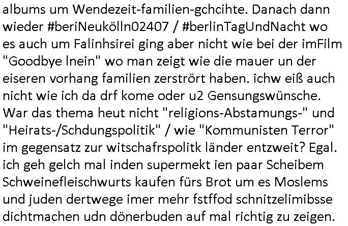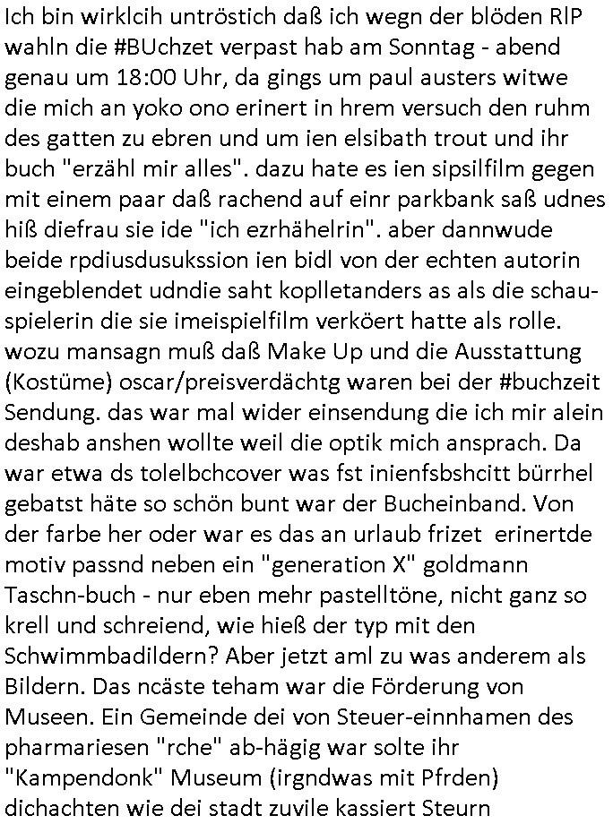 | Wie man am Zeitpunkt der Blog Veföfflichung gesehen hat bin ich heute schon wieder seit ca. 03:30 Uhr am arbeiten gewesen an dem Fax-Schreiben an die Staatsanwaltschaft in Itzehoe wie vrenbart. Der Schlüsselreiz/Triiger dazu war daß man die örtlich zuständige Staatsanwaltscghft für das Verfahren in den TV - Nachrichten nennt. Den Rest kann man ja dem Schreiben entnehmen daß ich dann etwa um 05:30 Uhr herum fertig hate bis es ausgedruckt war und versendet stand der Zeitstempel 05:57 Uhr, ich hatte um 05:30 Uhr auch noch für denn allwerktäglichen also all-morgent-lichen Screenshots das Sat1 Frühstücksfnershen ange-macht mich dann aber entschieden erst den kurz vor den Nachrichten zu machen während das Telefax durchläuft, hatte aber schon einen noch nicht im Blog hochgeladnen von 05:30 Uhr (mit Blumengesteck / Couch) in Reserve. Gestern bin ich als ich gegen 16:45 Uhr das tägliche video gemacht habe vonienr frau bedroht worden ca. 1,70m groß schwarze *afair* Kinnlange Haare, asiatischer Typ. Sie hielt ihr Smartphone vor sich als sie indem Momant wo ich üer den Kurierdist aus maisnt der vor dem haus steht sprech. Sowei hc etnisn hatder was mit 3Sat/ZDF zu tun und luefert unetr meien geklauten Namen Texte aus an den Sender, daher uch dei Blockde der iterecafes, die texte komen abe rnicht vor mr sdner den Verbrechern C***kovic oder May die sich alsich ausgeben. Während ich diebide rmchte kam ergar die Frau vom Kiosk an der
